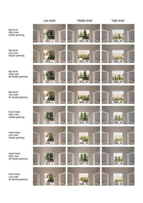 Key findings highlight that the visibility and spatial arrangement of greenery, rather than quantity, most strongly affect emotional outcomes. Scenarios featuring moderate greenery, vertical façades, and small windows at mid-level elevations were consistently rated as calming, secure, and emotionally engaging. In contrast, excessive or poorly composed greenery often caused discomfort.