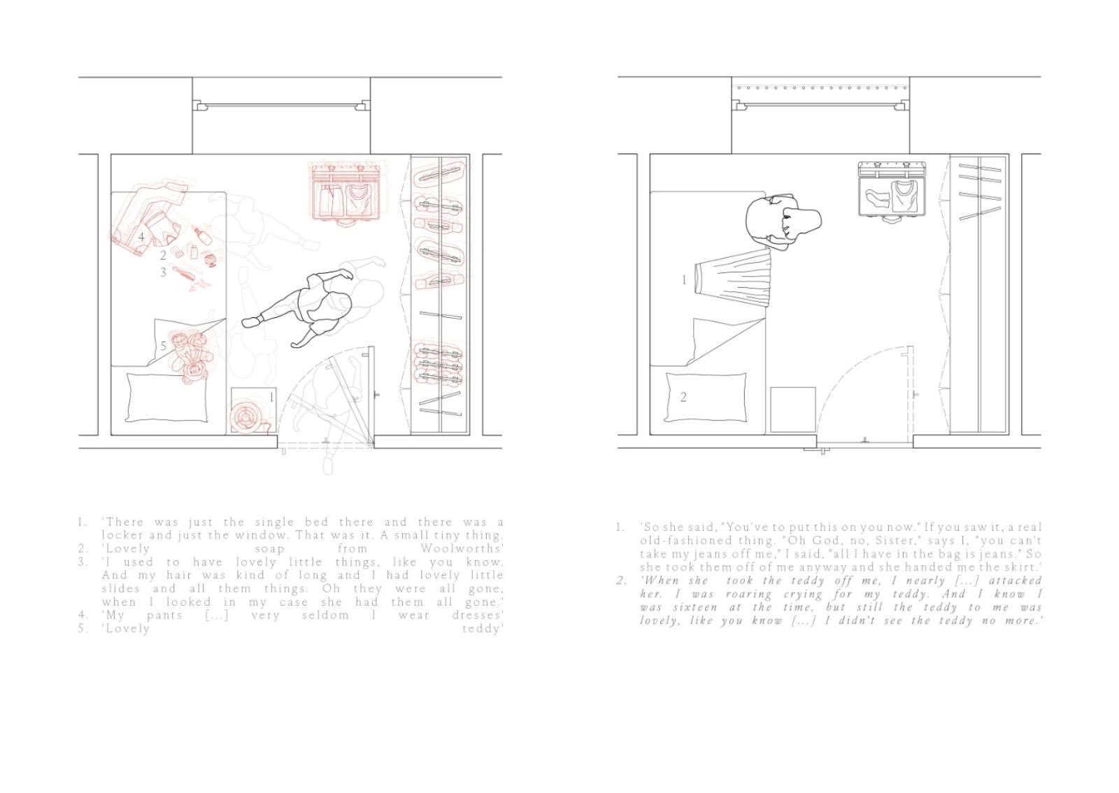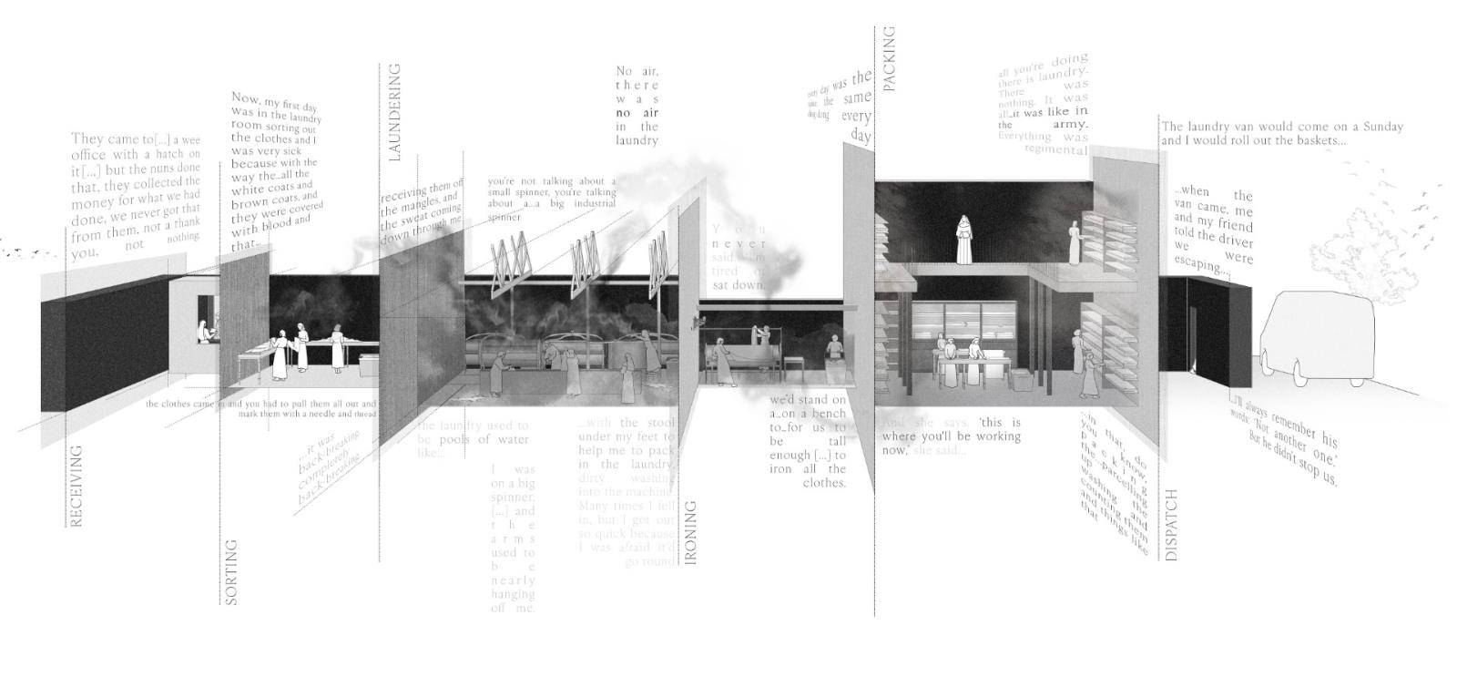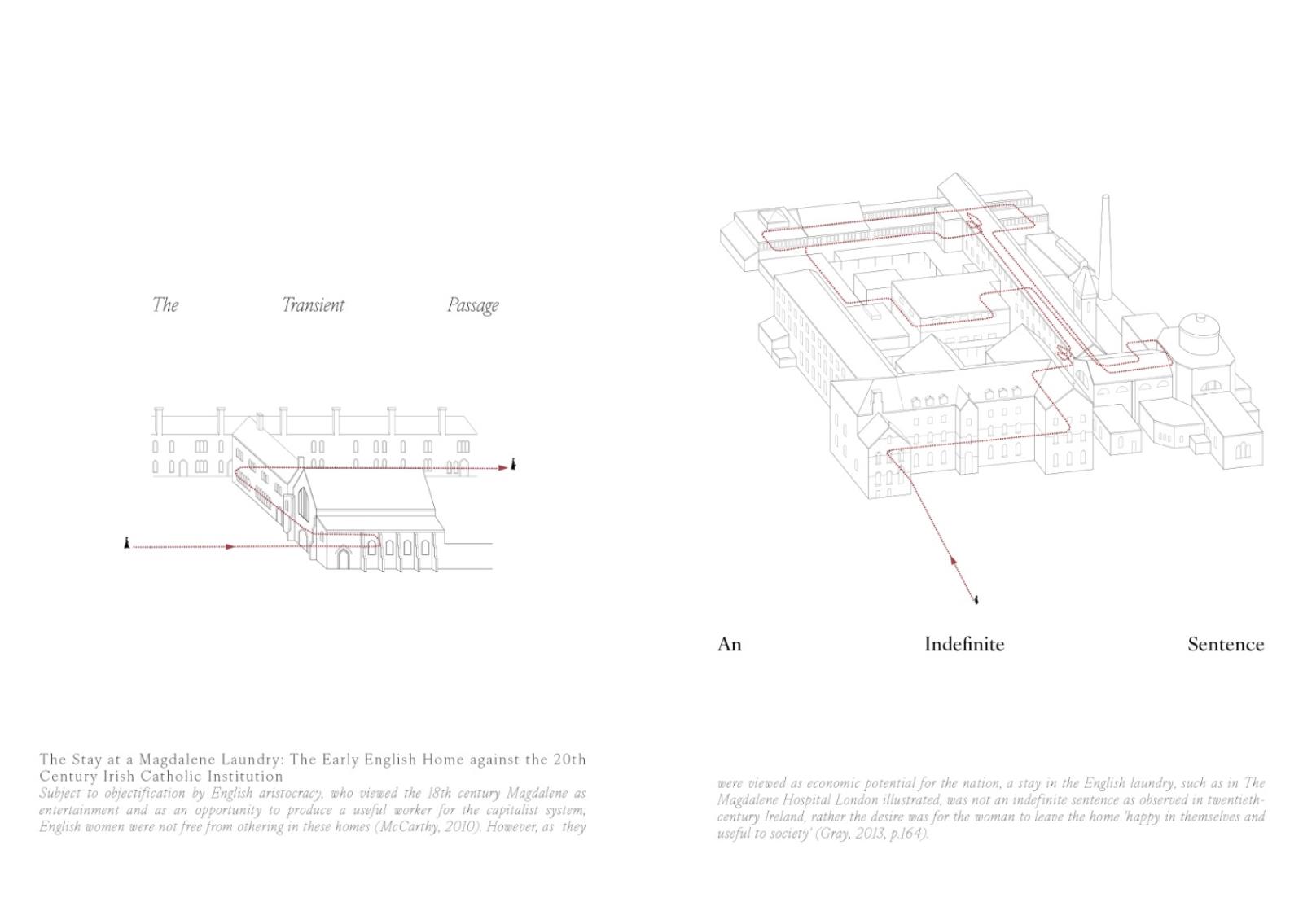 The research positions the Laundry within a feminist theoretical framework, drawing on Simone de Beauvoir’s The Second Sex to analyse how institutional architecture produced and maintained the category of woman as ‘Other’. Analysing architectural archival material and survivor testimony, the study constructs a spatial reading of the institution as an instrument of control, mapping how design enforced the segregation, dehumanisation, and containment of the women and girls confined within.