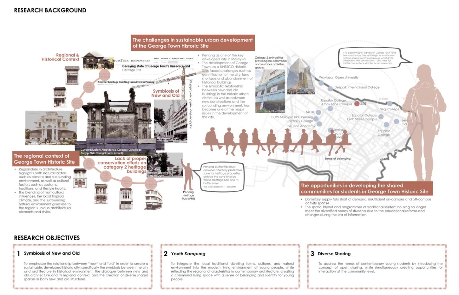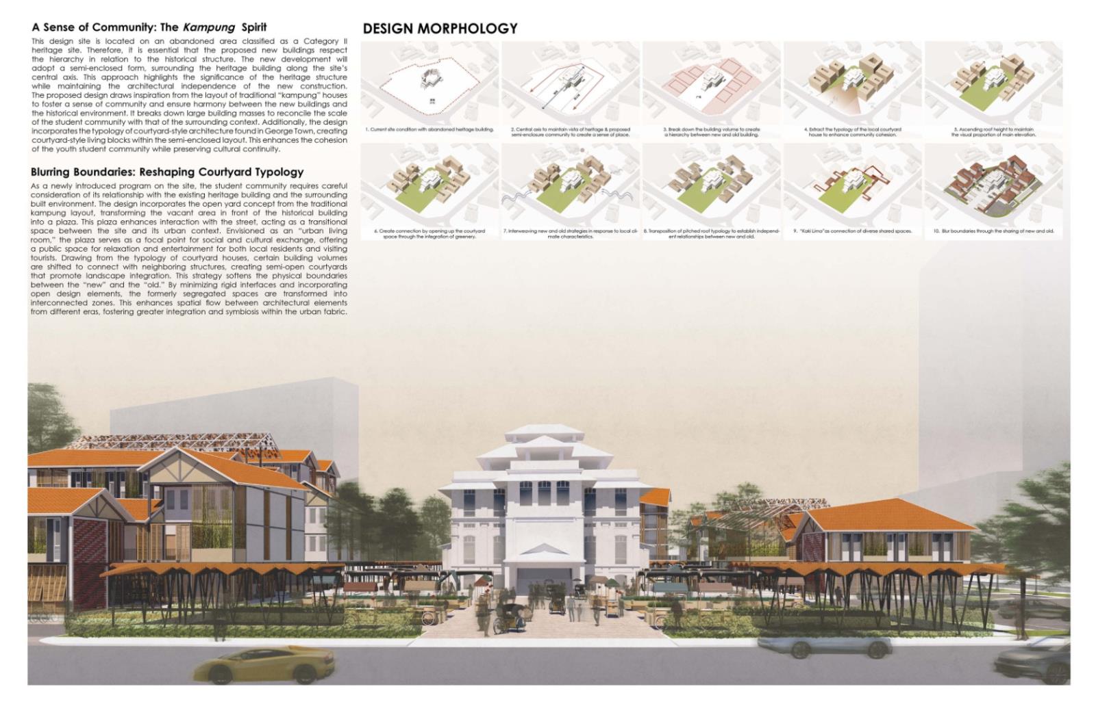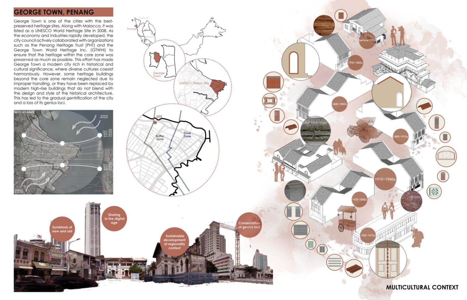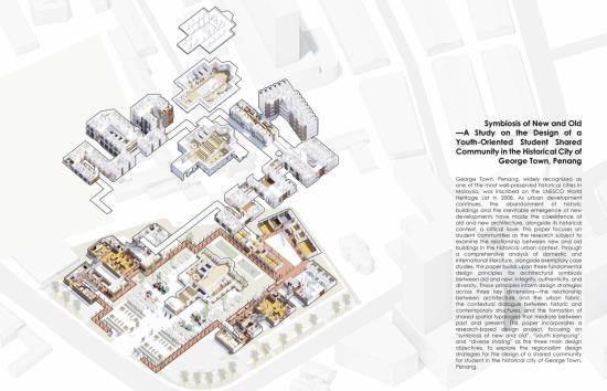 Symbiosis of New and Old: A study on the design of a youth-oriented student shared community in the historical city of George Town, Penang Part 2 Dissertation 2025 Zhi Shing Heng Tongji University | China George Town, Penang-widely recognized as one of Malaysia's most well-preserved historical cities -was inscribed on the UNESCO World Heritage List in 2008. Amid ongoing urban development, the abandonment of heritage buildings and the rise of new construction have raised pressing concerns about the coexistence of historic architecture and contemporary urban growth. This dissertation seizes the opportunity to envision a student shared community within the city's heritage core, presenting a research based design proposal for a Youth-Oriented Student Shared Community in George Town. It addresses the challenge of integrating old and new within heritage contexts, framed by three key objectives: symbiosis between old and new, youth kampung, and diverse sharing. Through an extensive literature review and case studies, this study proposes design strategies rooted in the principles of integrity, authenticity, and diversity. It investigates how architecture can foster holistic symbiosis between new and old, facilitate the dialogic integration of historic and contemporary elements, and articulate multidimensional narratives of shared spaces. This dissertation emphasises the potential of student shared communities as catalysts for sustainable urban renewal and social inclusivity in historic settings. With shared living as an agent of dialogue, it proposes a replicable design framework that challenges conventional boundaries between preservation and innovation. Tutor(s) Zhenyu Li