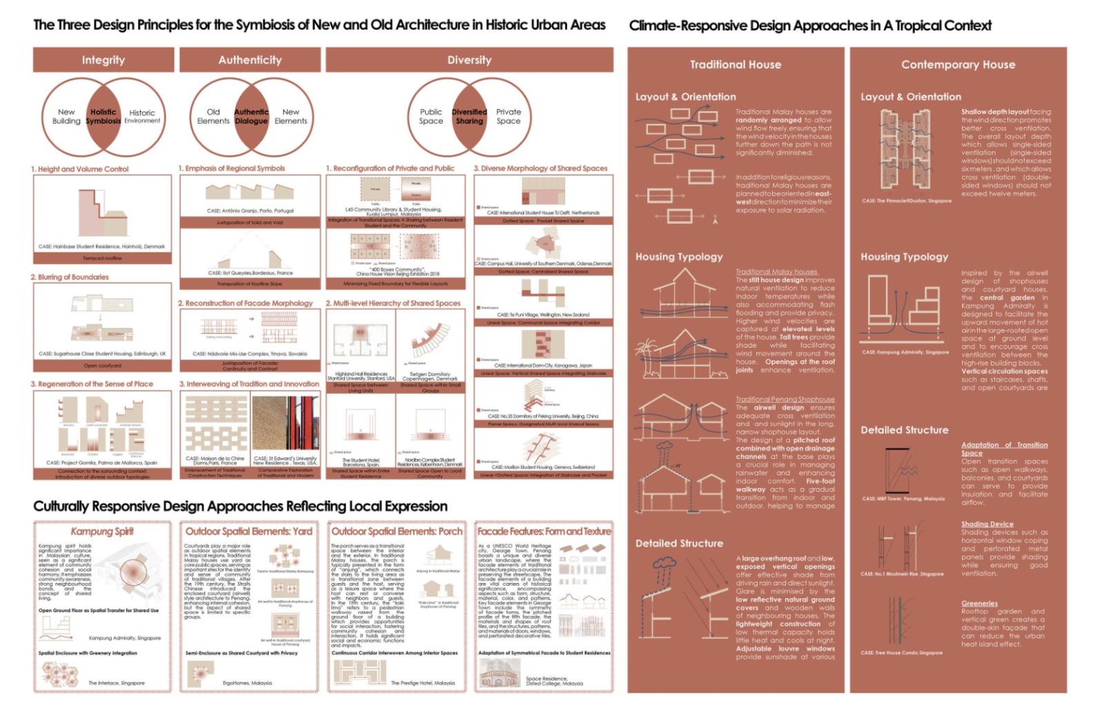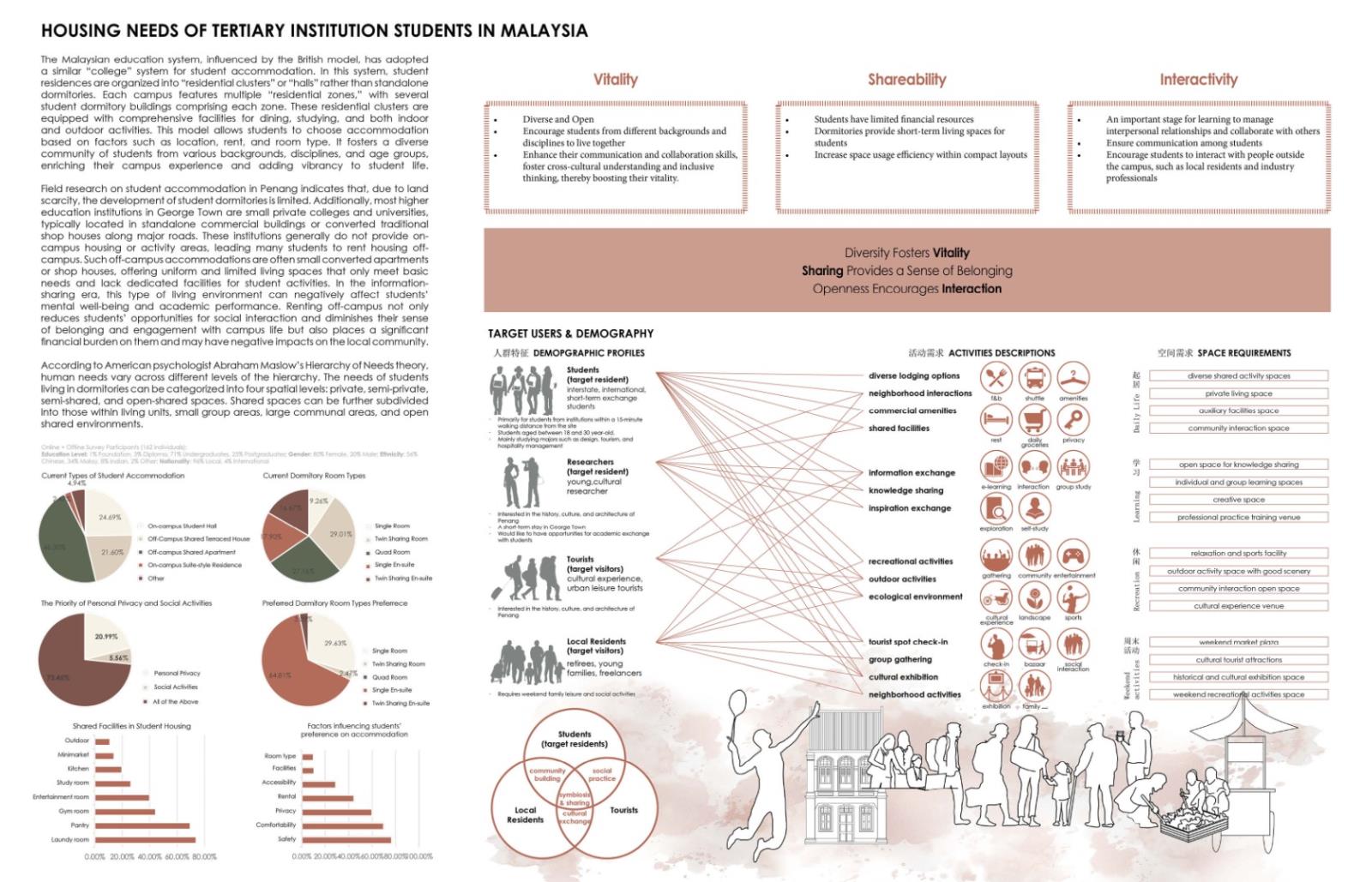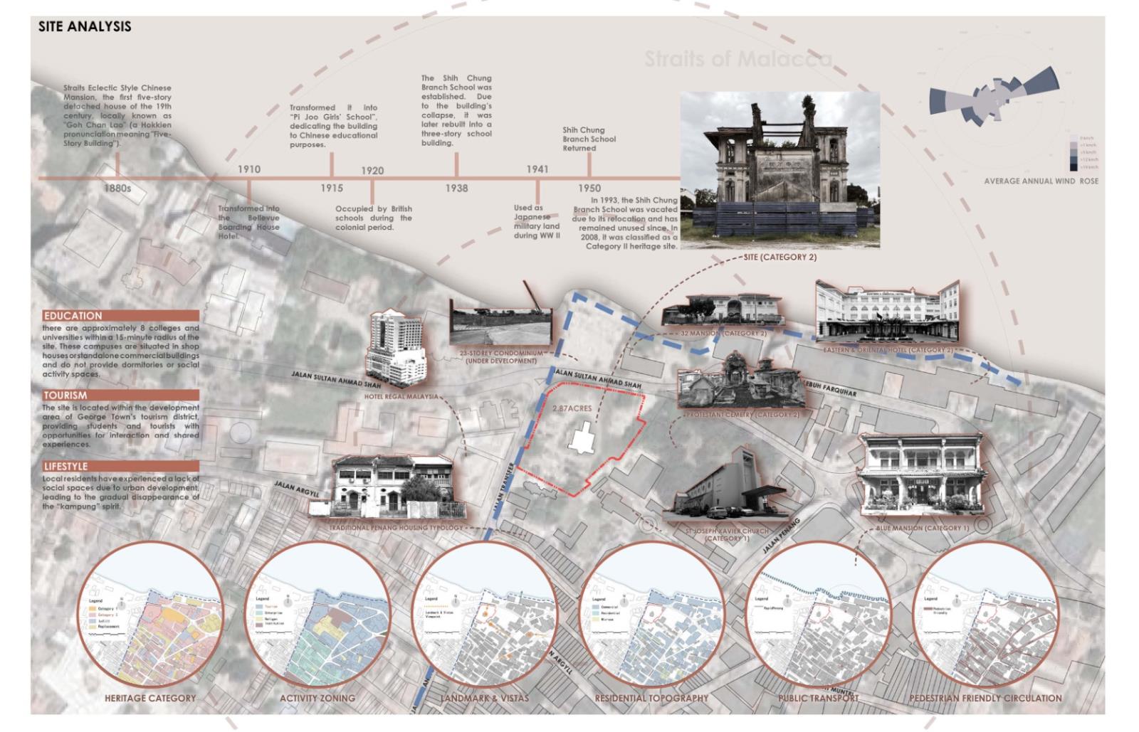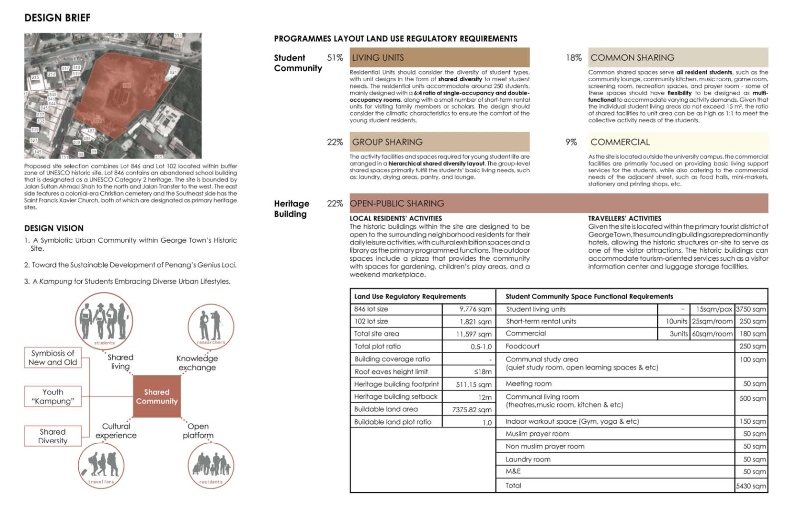Symbiosis of New and Old: A study on the design of a youth-oriented student shared community in the historical city of George Town, Penang Part 2 Dissertation 2025 Zhi Shing Heng Tongji University | China George Town, Penang-widely recognized as one of Malaysia's most well-preserved historical cities -was inscribed on the UNESCO World Heritage List in 2008. Amid ongoing urban development, the abandonment of heritage buildings and the rise of new construction have raised pressing concerns about the coexistence of historic architecture and contemporary urban growth. This dissertation seizes the opportunity to envision a student shared community within the city's heritage core, presenting a research based design proposal for a Youth-Oriented Student Shared Community in George Town. It addresses the challenge of integrating old and new within heritage contexts, framed by three key objectives: symbiosis between old and new, youth kampung, and diverse sharing. Through an extensive literature review and case studies, this study proposes design strategies rooted in the principles of integrity, authenticity, and diversity. It investigates how architecture can foster holistic symbiosis between new and old, facilitate the dialogic integration of historic and contemporary elements, and articulate multidimensional narratives of shared spaces. This dissertation emphasises the potential of student shared communities as catalysts for sustainable urban renewal and social inclusivity in historic settings. With shared living as an agent of dialogue, it proposes a replicable design framework that challenges conventional boundaries between preservation and innovation. Tutor(s) Zhenyu Li