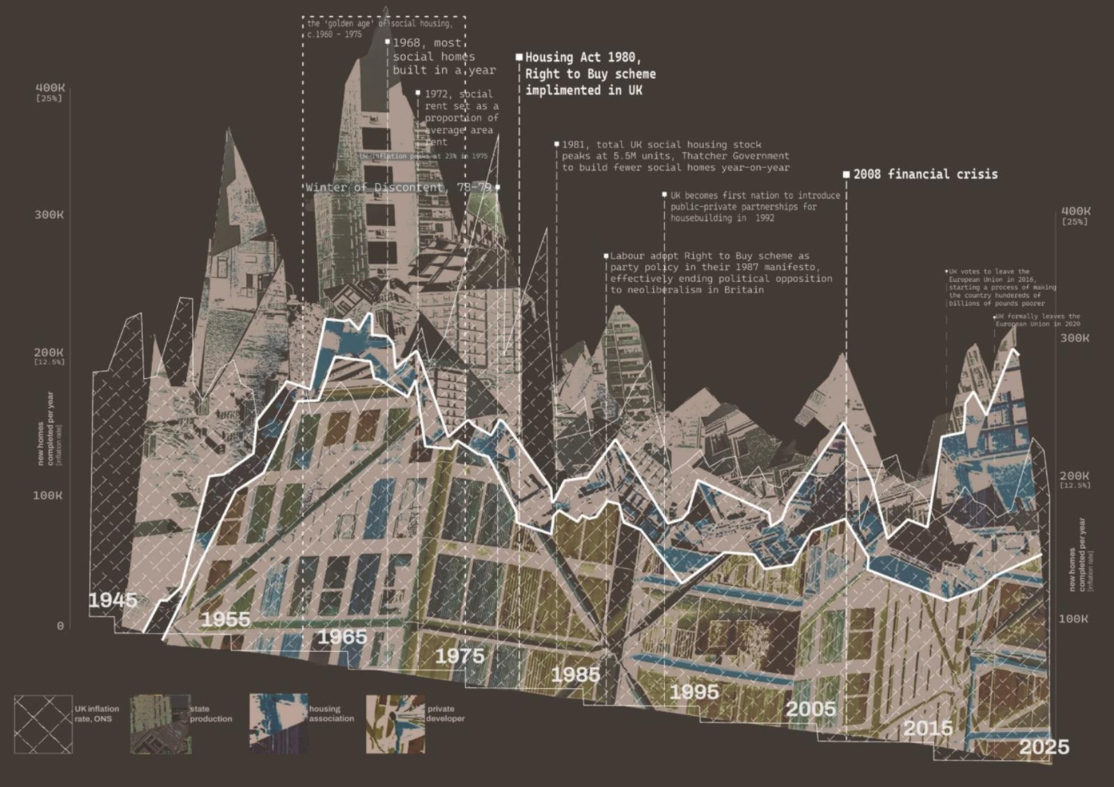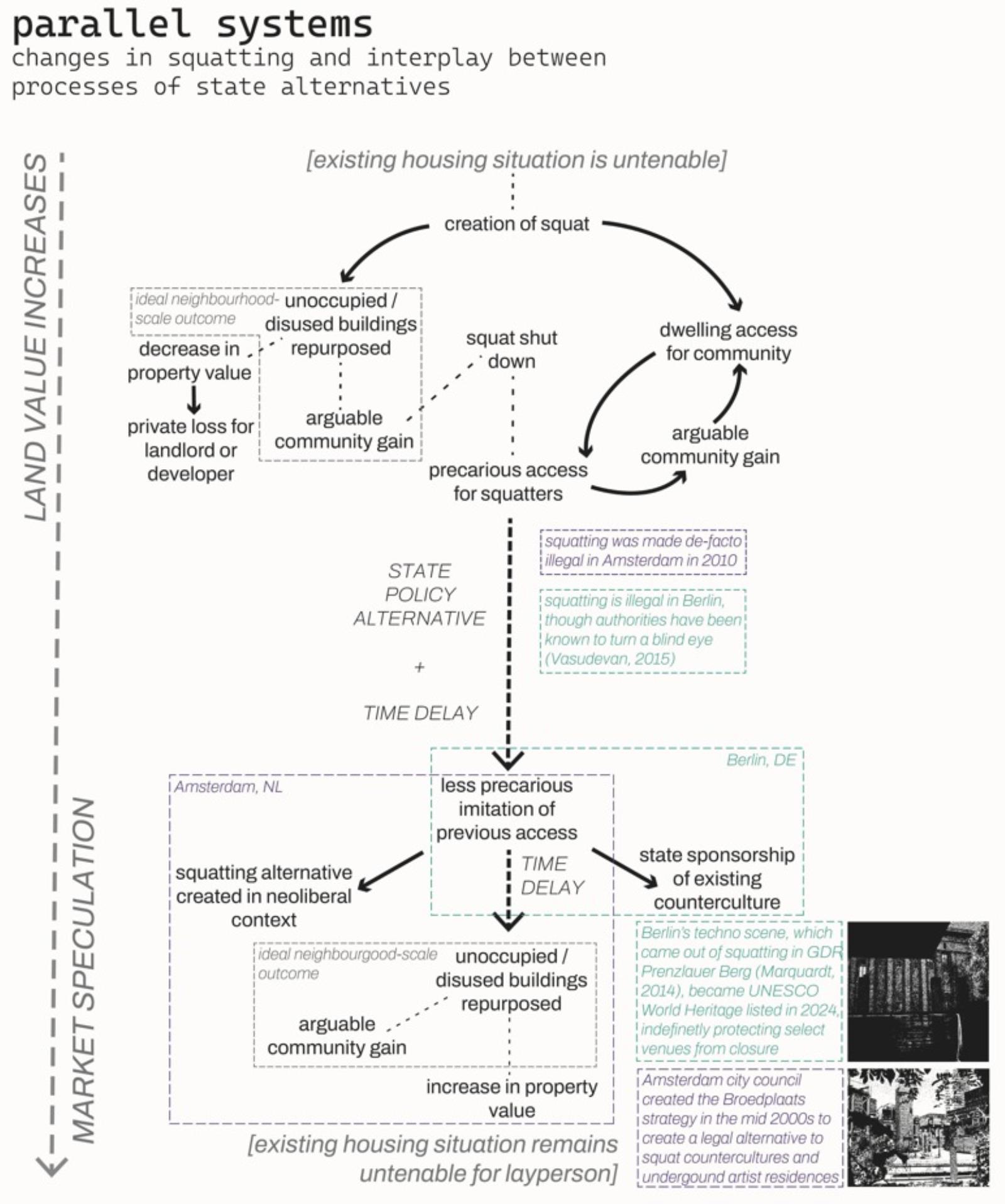 Precarious Alternative: Lessons from parallel housing crises Part 2 Dissertation 2025 Oliver Piers University of Plymouth | UK Using Henri Lefebvre’s concept of abstract spatialisation to examine how profit-driven housing developments disrupt subcultural communities, the dissertation looks at Berlin and Amsterdam housing projects and methods and compares them with London. This is done by first outlining the socio-economic and political lineage of London housing access, from the post-war period to the present, where gentrification as state development policy epitomises the abstraction of social space. The understanding of precarious urban conditions and modes of agency has been developed through conversational interviews and anecdotal accounts. These methods were used to foreground the embodied and lived experiences of individuals who have inhabited these urban environments over time. Finally, the dissertation considers the degree to which the alternative and perhaps more radical models present in Berlin and Amsterdam could challenge housing commodification in London, while simultaneously being mindful that implementing such models in the UK is hindered by political resistance and the suppression of grassroots movements. Tutor(s) Nikolina Bobic
