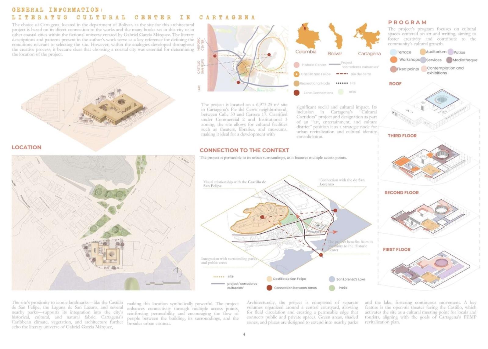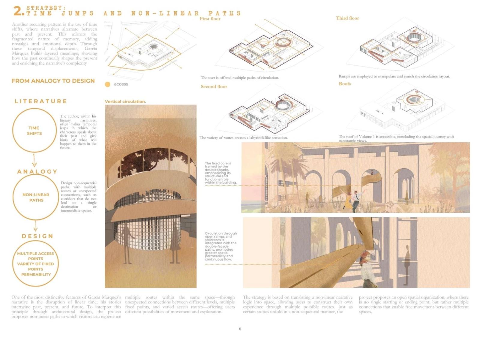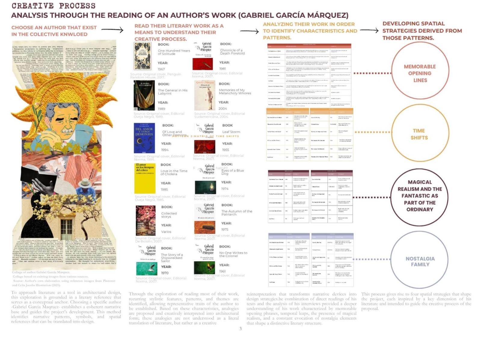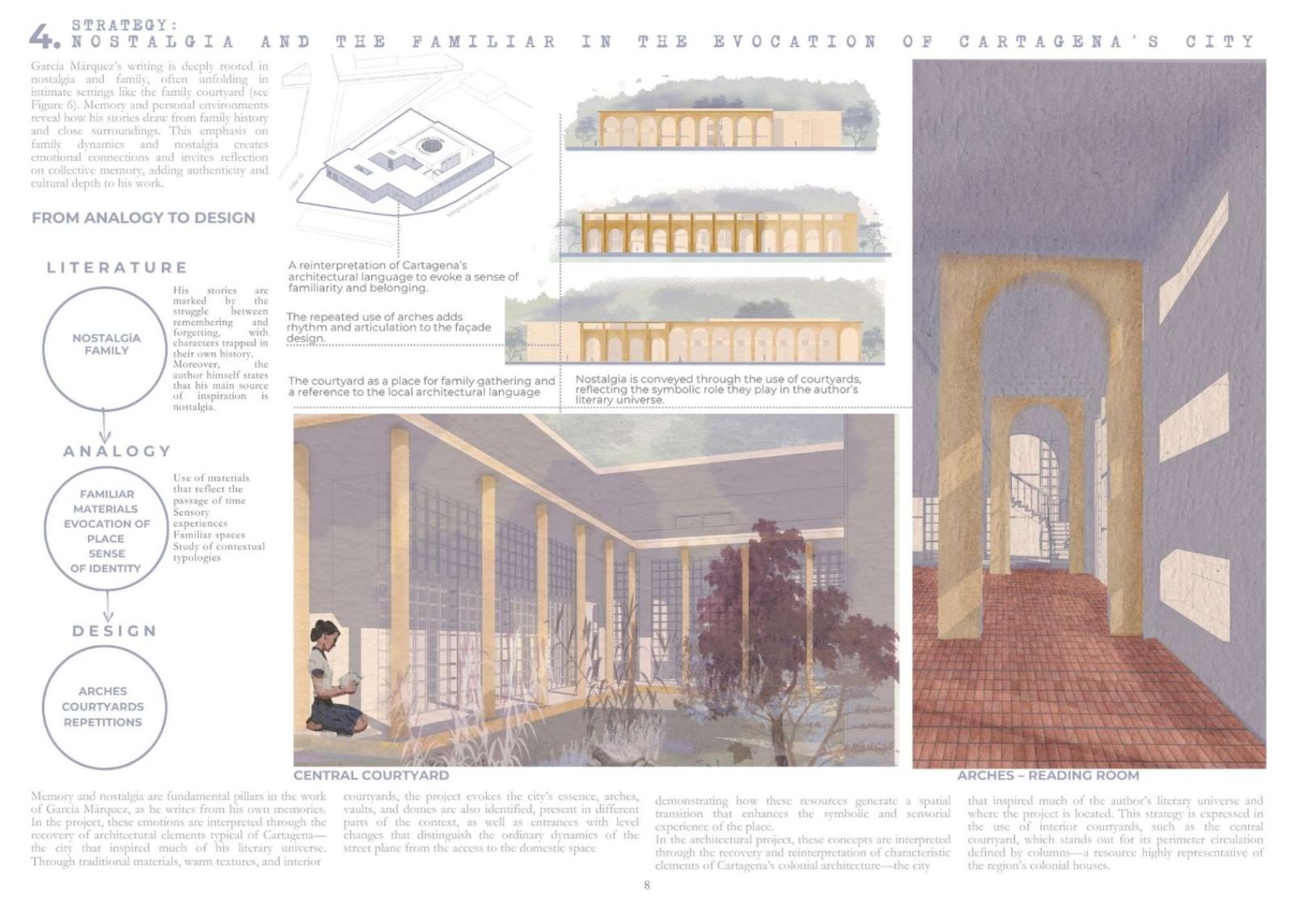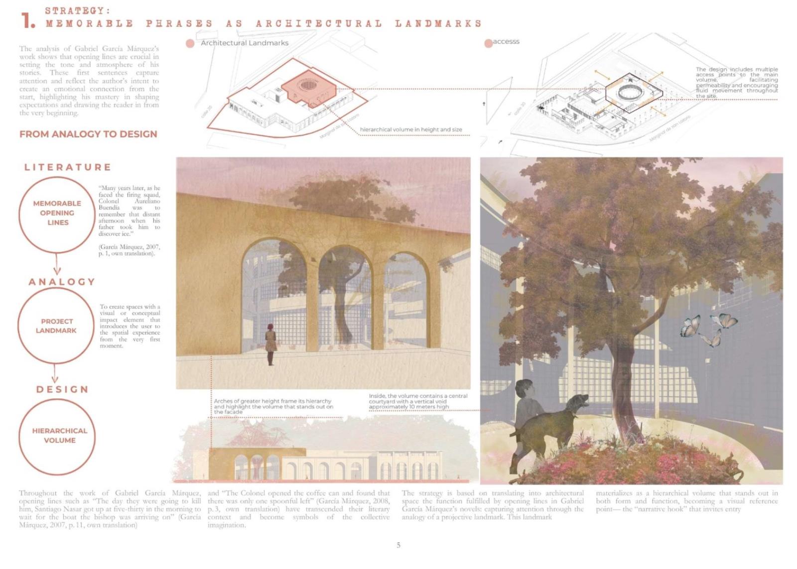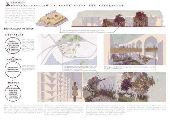 Through a detailed study of Gabriel García Márquez’s narrative characteristics—such as non-linear time, symbolic repetition, and atmospheric spaces—the project interprets these as conceptual and spatial strategies. This interpretative process guides the creative development of the Literatus Cultural Center in Cartagena, a city deeply connected to the author’s legacy.