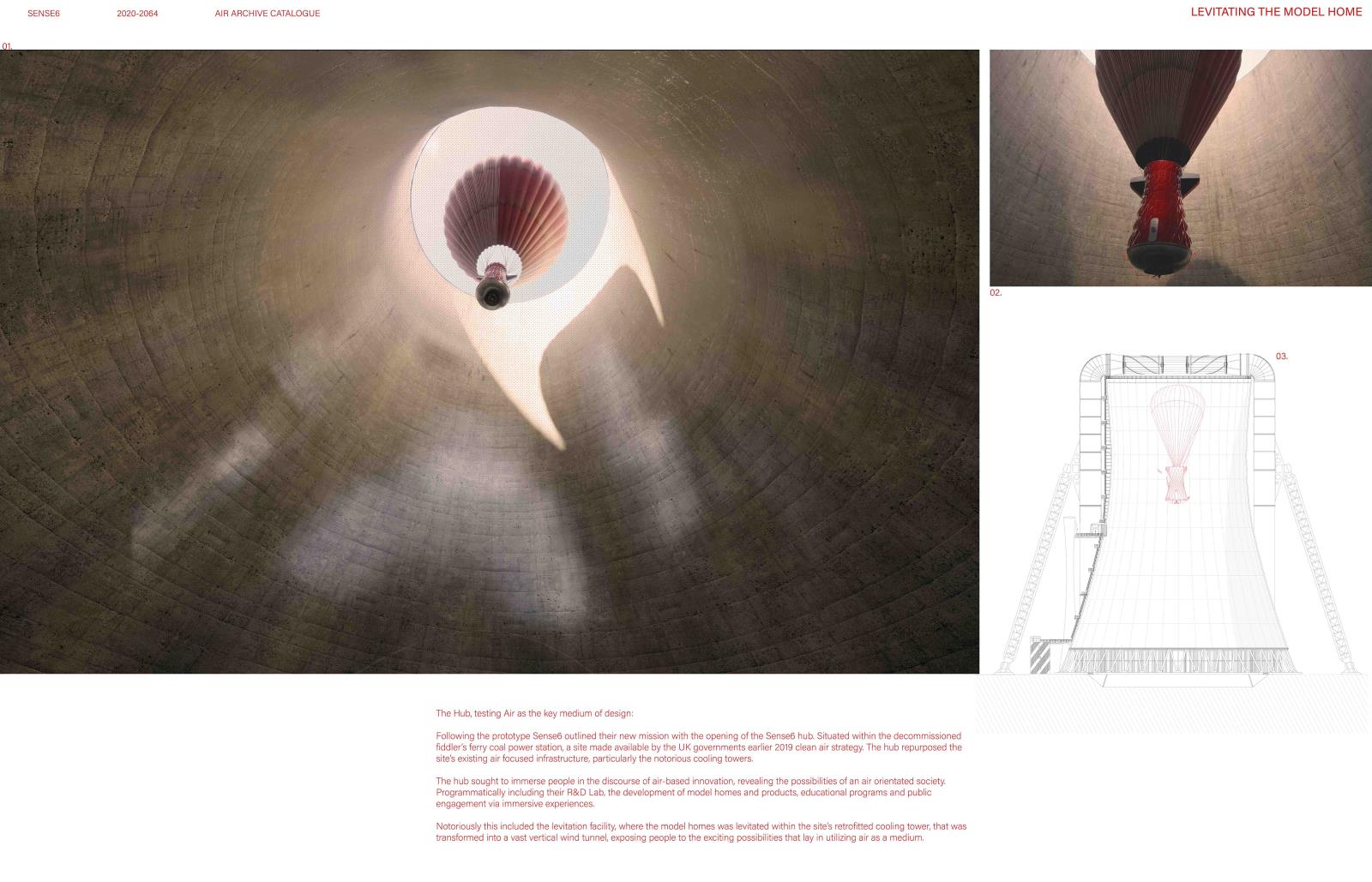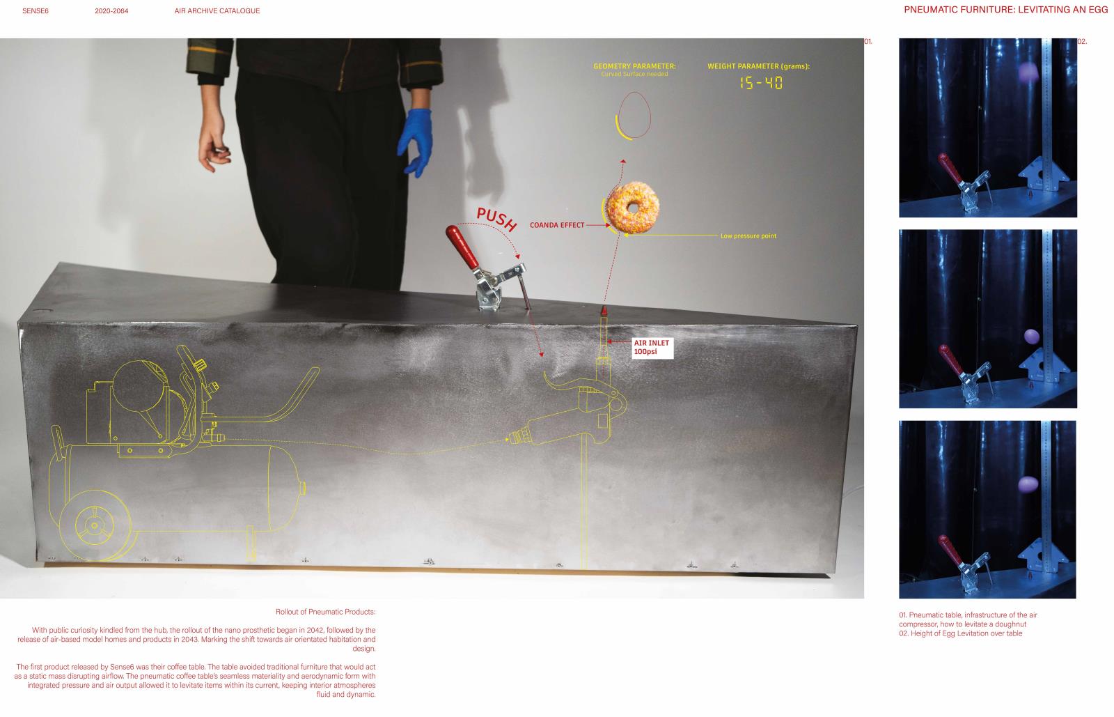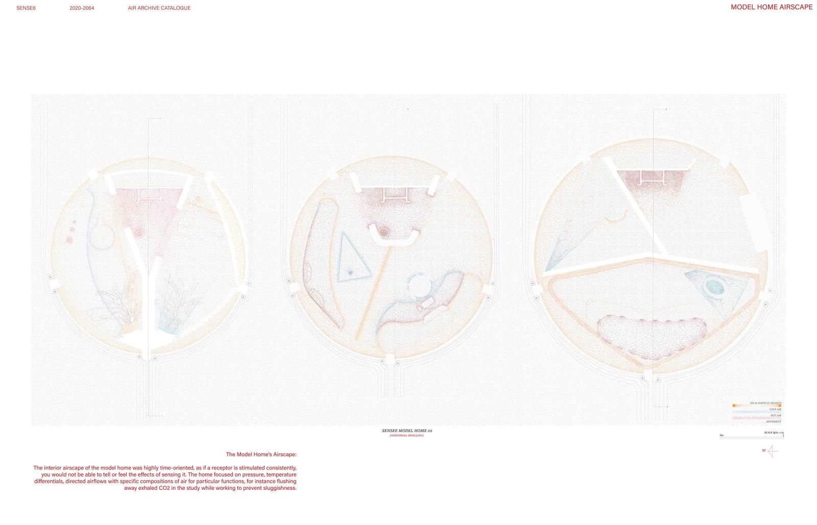 From model airscape homes to pneumatic products, Sense6’s designs accelerate air’s commodification. Cheaper alternatives spur retrofit airscapes and unexpected innovation. The project speculates across scales from national relocation patterns and urban air filtration systems to levitating inhabitants and flying cutlery. The designs are for an air-orientated society, exposing the already existing ‘Economy of Breathing’ that stratifies breathers by wealth.