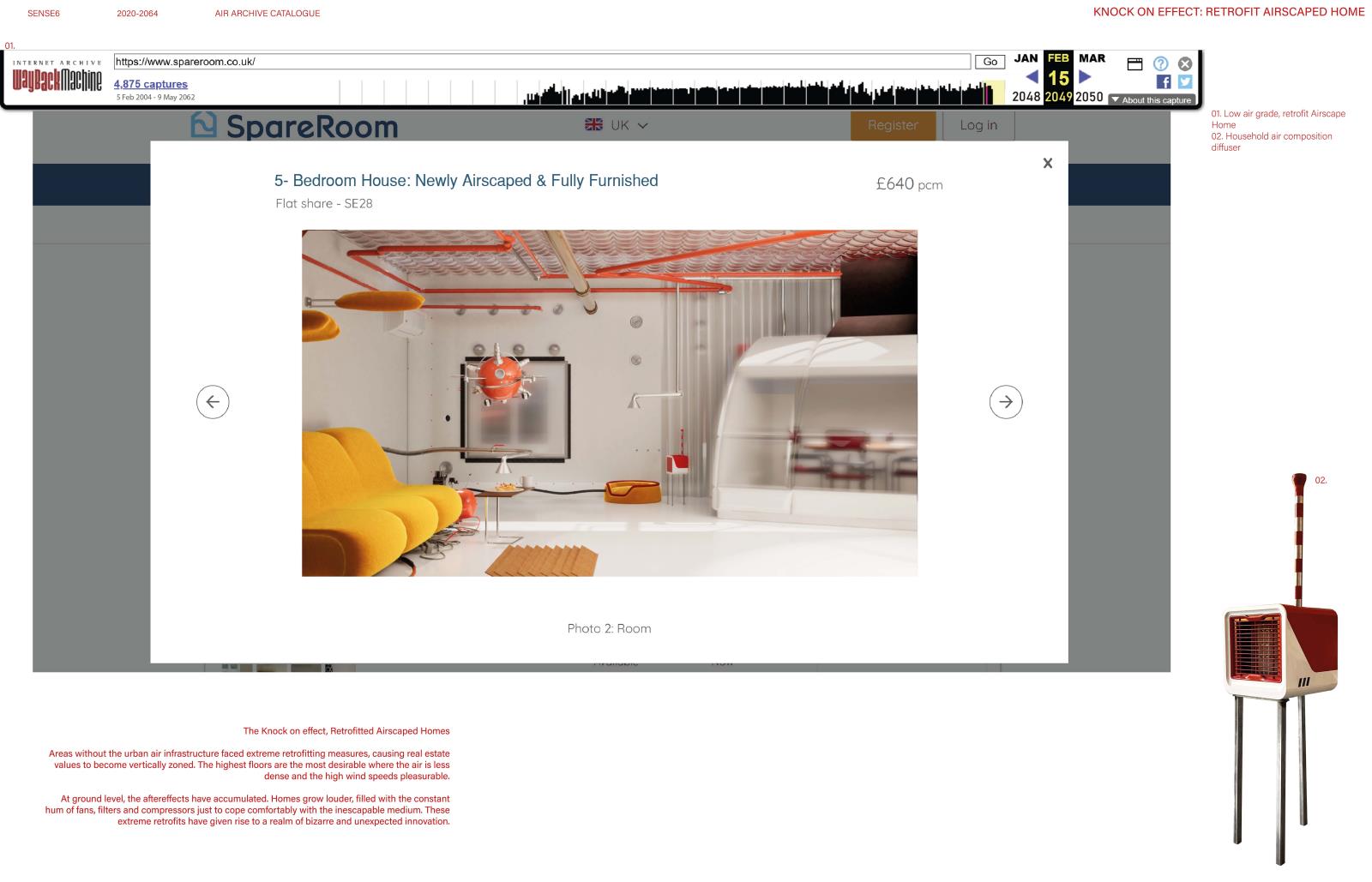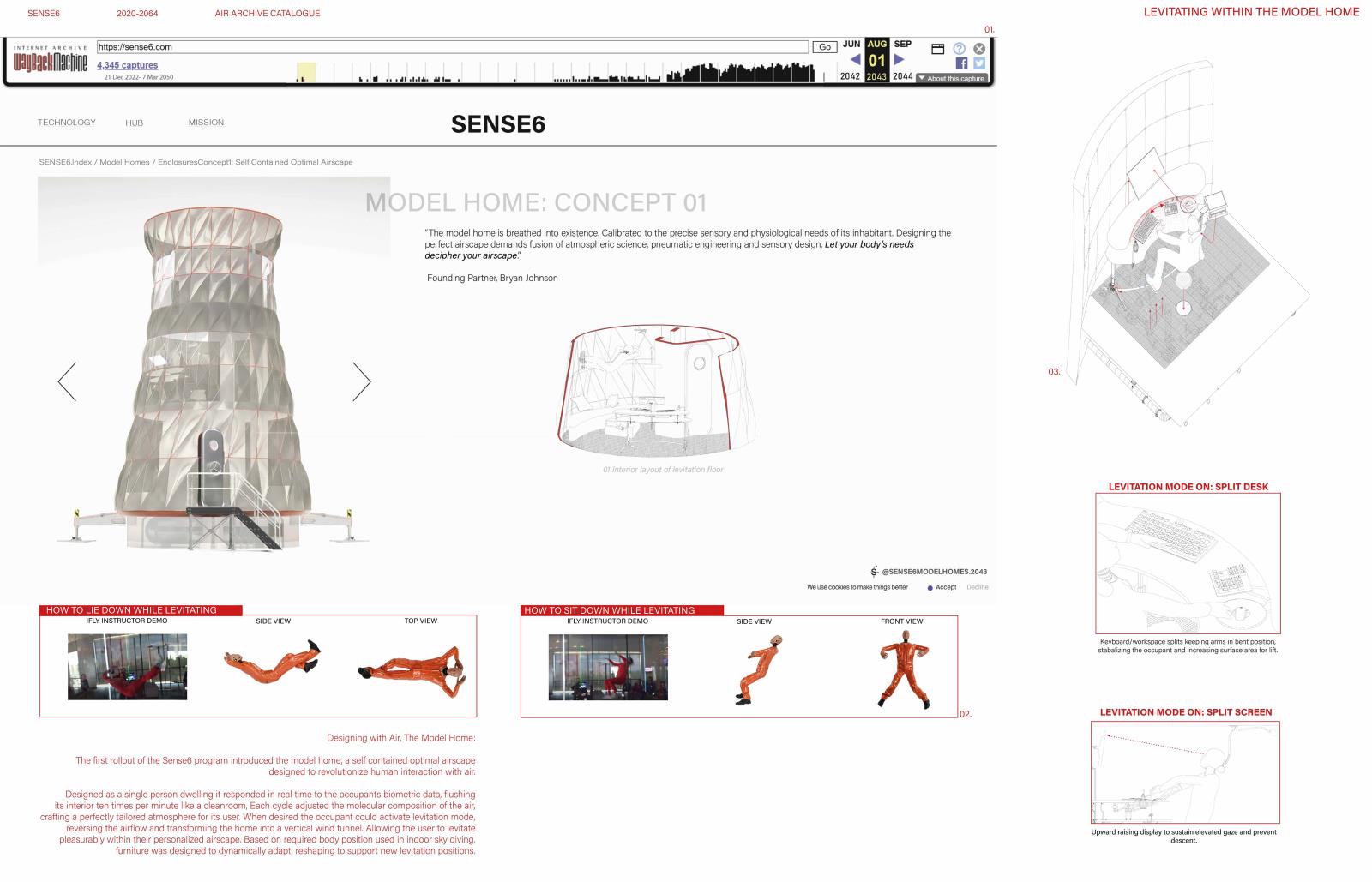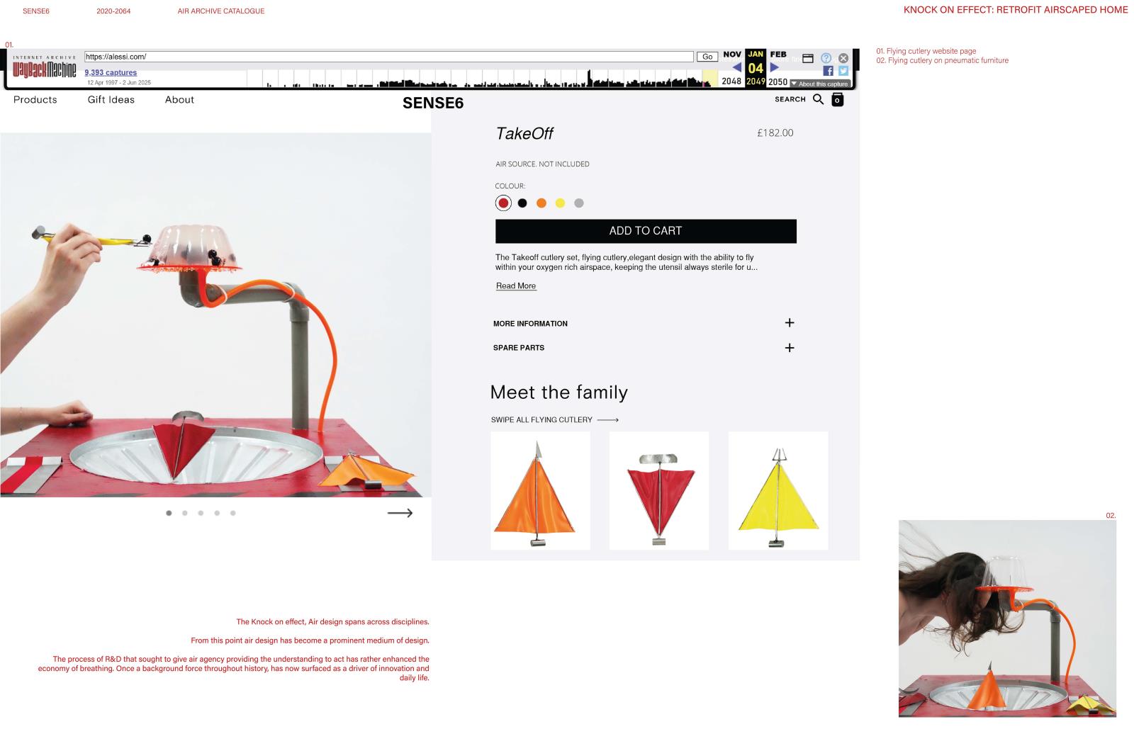 From model airscape homes to pneumatic products, Sense6’s designs accelerate air’s commodification. Cheaper alternatives spur retrofit airscapes and unexpected innovation. The project speculates across scales from national relocation patterns and urban air filtration systems to levitating inhabitants and flying cutlery. The designs are for an air-orientated society, exposing the already existing ‘Economy of Breathing’ that stratifies breathers by wealth.