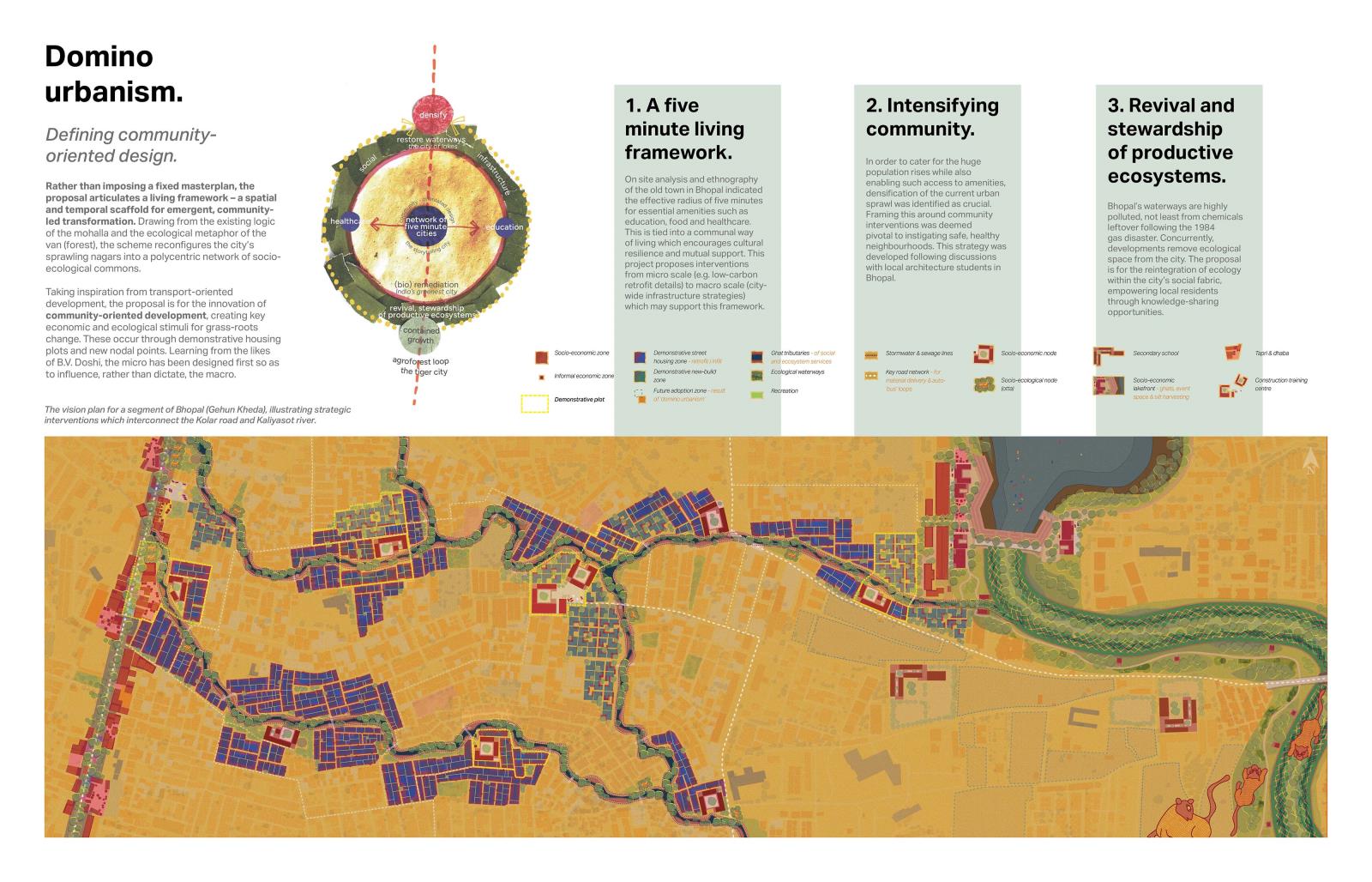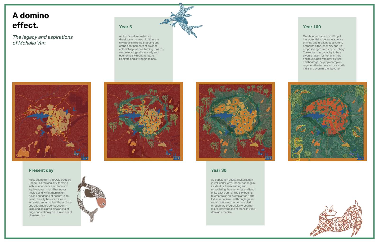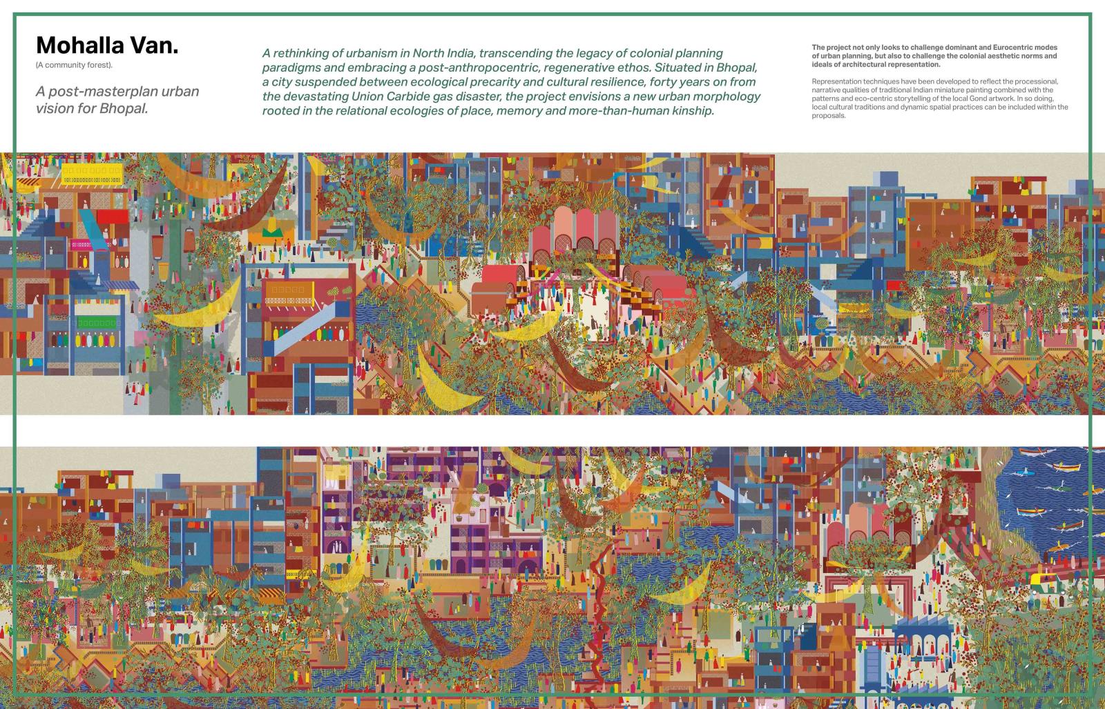 Mohalla Van presents a post-masterplan, post-anthropocentric rethinking of North Indian urbanism. Situated in Bhopal, a city suspended between ecological precarity and cultural resilience, forty years on from the devastating Union Carbide gas disaster, the project envisions a new urban morphology rooted in the relational ecologies of place, memory and more-than-human kinship. Built around revitalising catastrophically polluted waterways, creating a polycentric network of socio-ecological commons, Mohalla Van proposes a reimagined mode of urban design - domino urbanism - which looks to harness historic Indian influential design in order to spark regenerative change. This is achieved through the creation of key nodal architectural interventions and precise demonstrative housing developments.