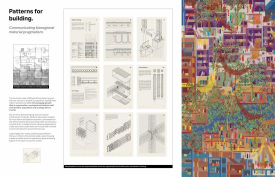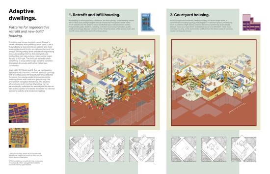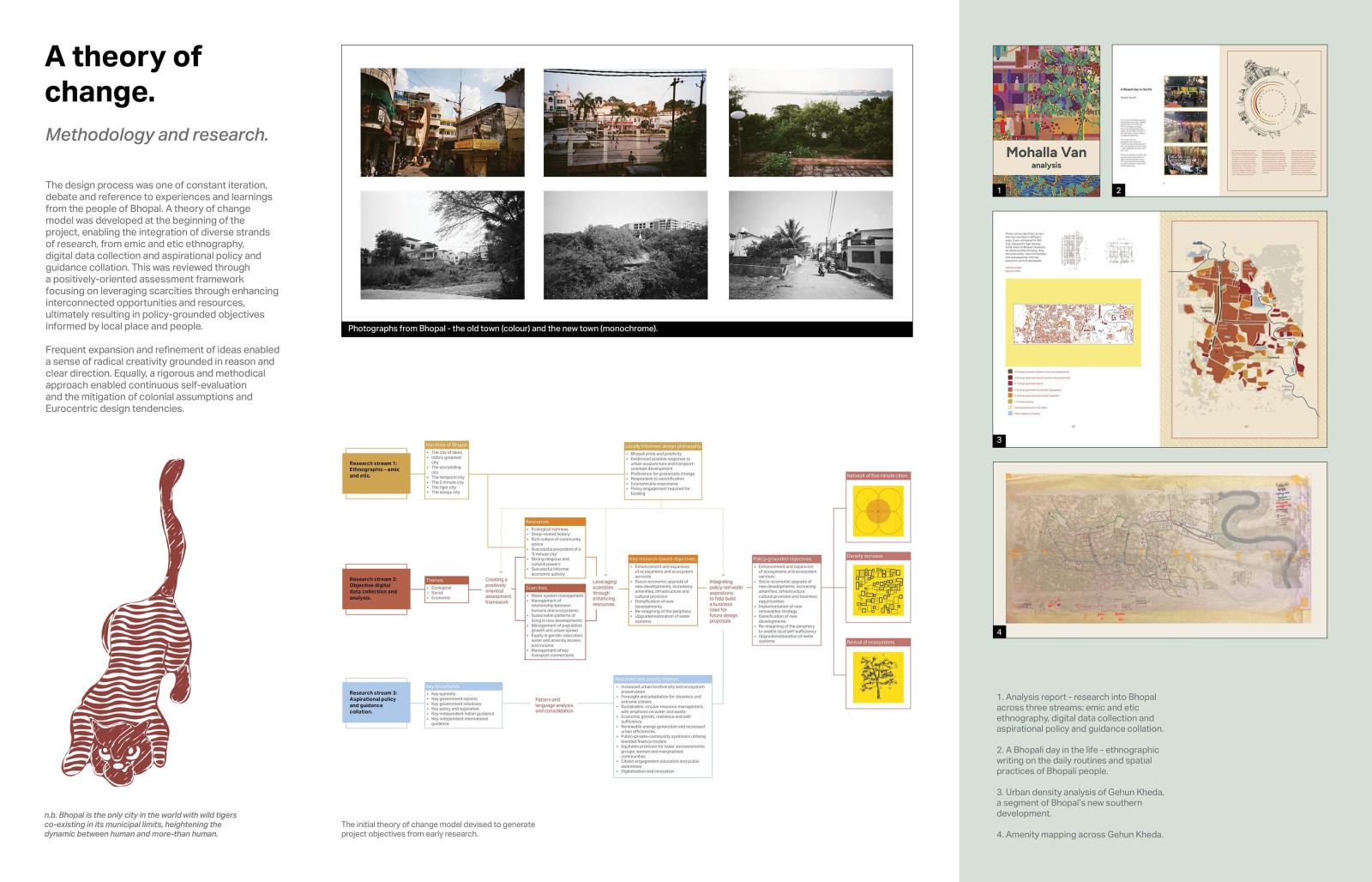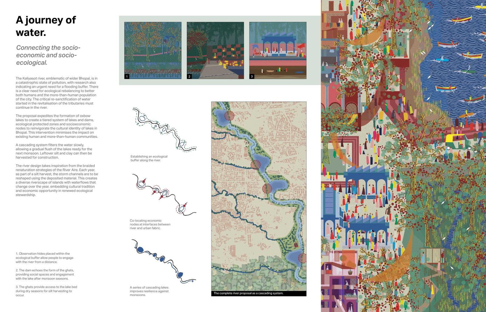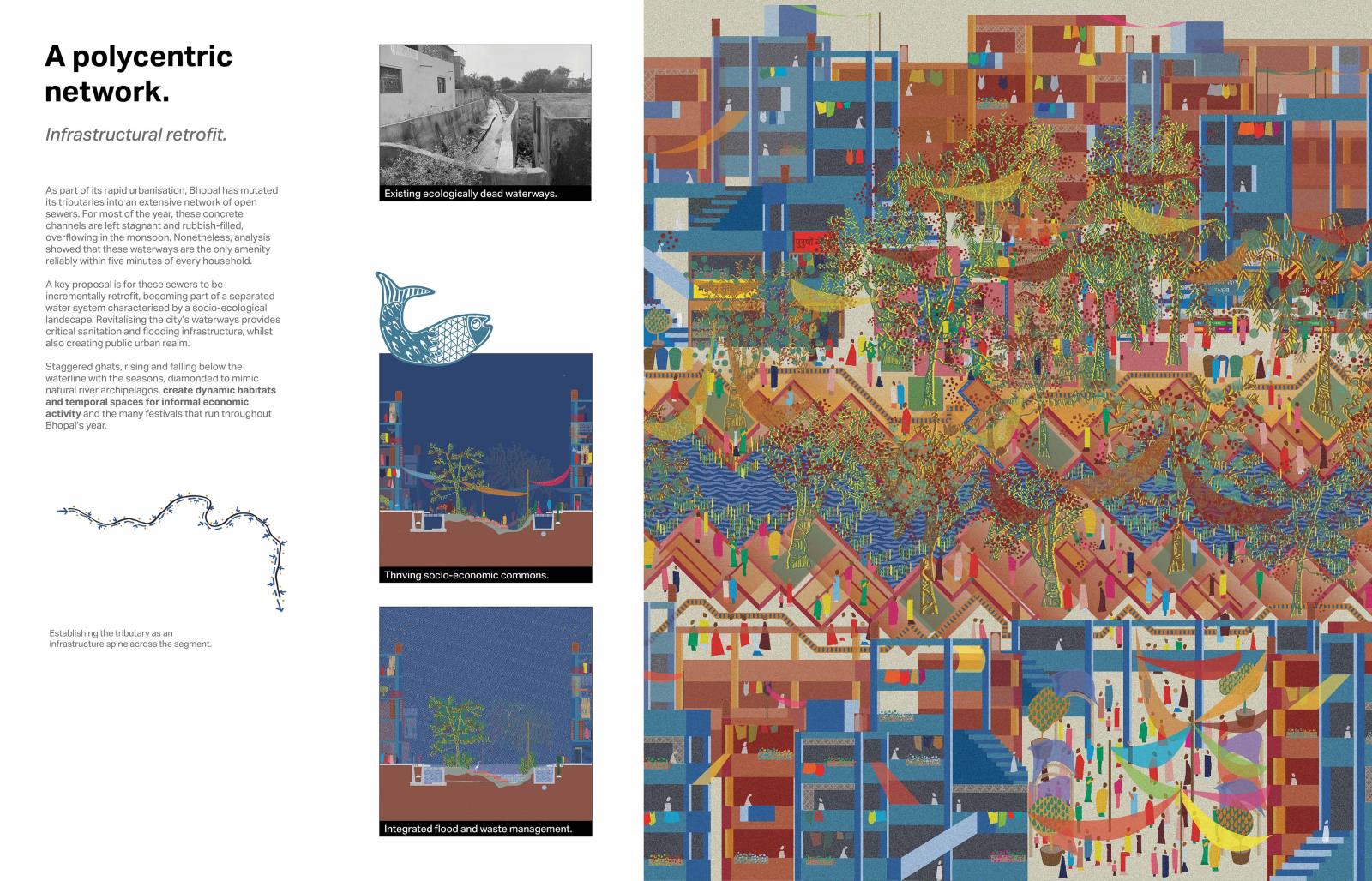 Mohalla Van presents a post-masterplan, post-anthropocentric rethinking of North Indian urbanism. Situated in Bhopal, a city suspended between ecological precarity and cultural resilience, forty years on from the devastating Union Carbide gas disaster, the project envisions a new urban morphology rooted in the relational ecologies of place, memory and more-than-human kinship. Built around revitalising catastrophically polluted waterways, creating a polycentric network of socio-ecological commons, Mohalla Van proposes a reimagined mode of urban design - domino urbanism - which looks to harness historic Indian influential design in order to spark regenerative change. This is achieved through the creation of key nodal architectural interventions and precise demonstrative housing developments.