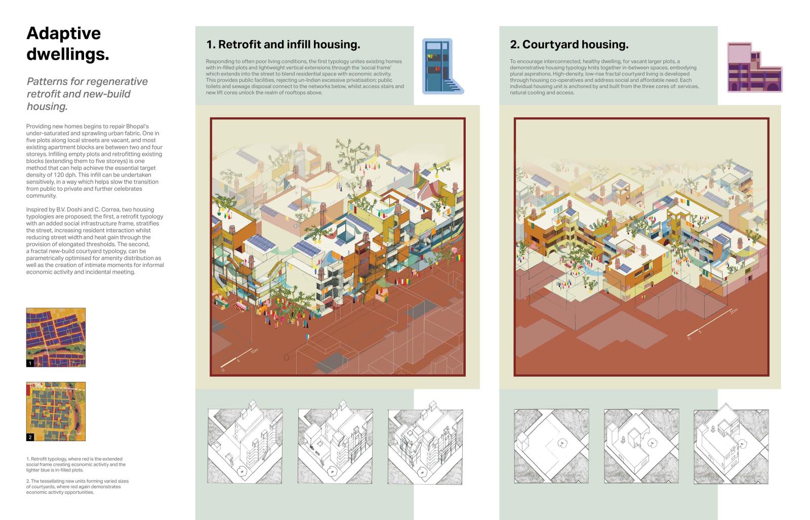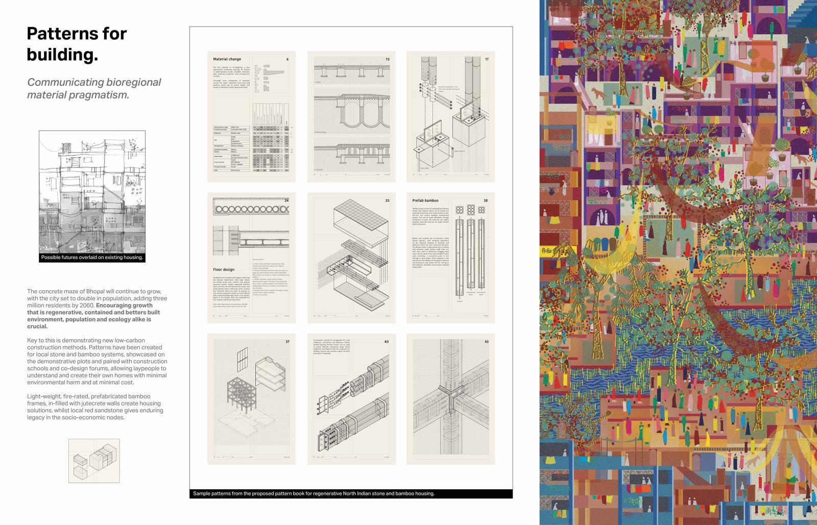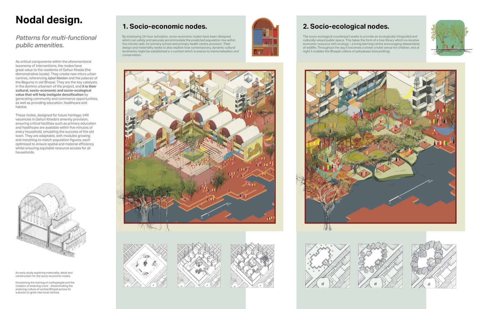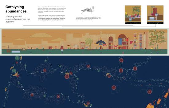 The project is grounded in decolonial theory, methodology and representation, with a visual language developed to blend traditional Indian miniature painting with local Gond artwork, eschewing the Eurocentric dichotomy of ‘render’ and ‘orthographic’. Growing from the stories of Bhopali residents, the project aspires to showcase an exemplar for North Indian design, presenting pragmatism through visual fantasy to inspire the re-centring of old Bhopali dynamic spatial practice and help create new resilient, regenerative and thriving city fabric.