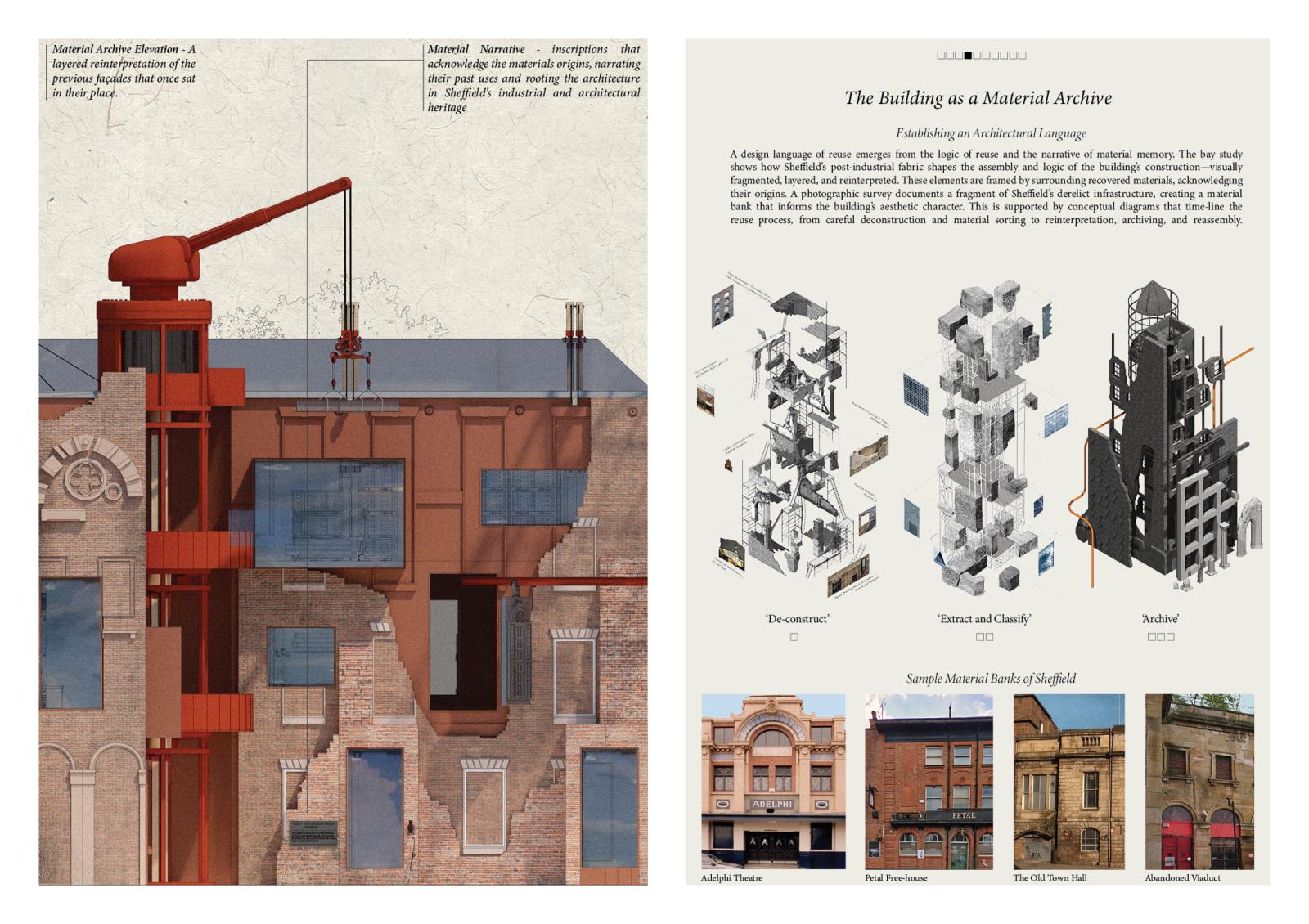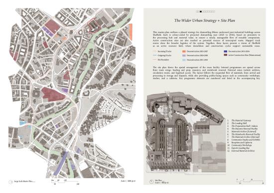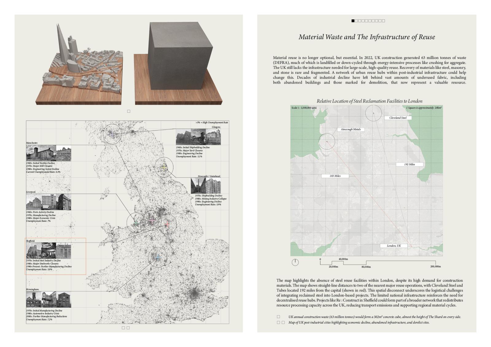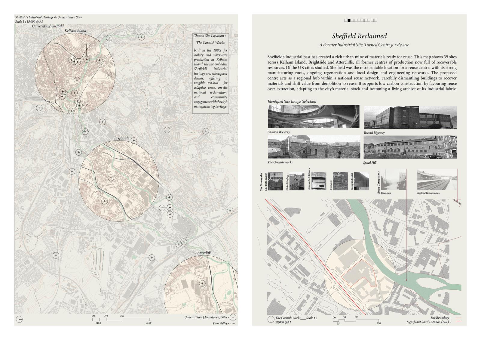 Located in Sheffield, a city rooted in industrial heritage, 'Re:Construct' salvages materials from abandoned structures and establishes a platform for processing, archiving and reintegrating these resources into architectural applications.