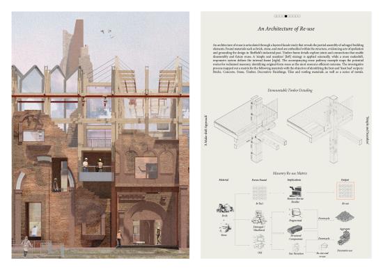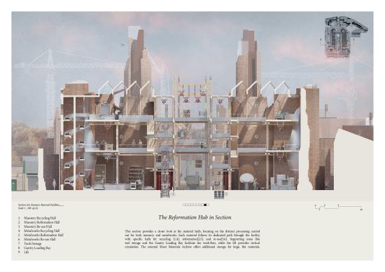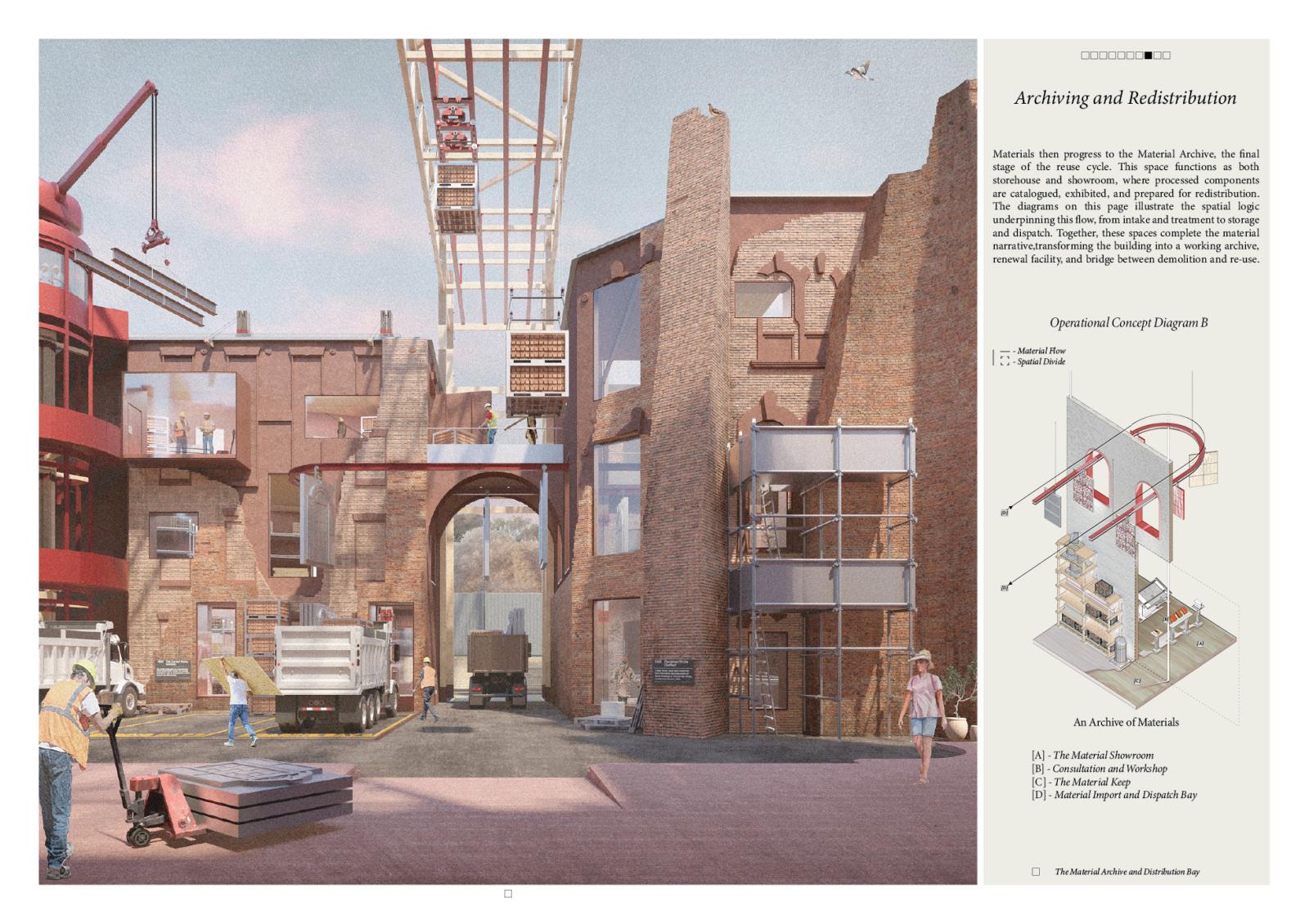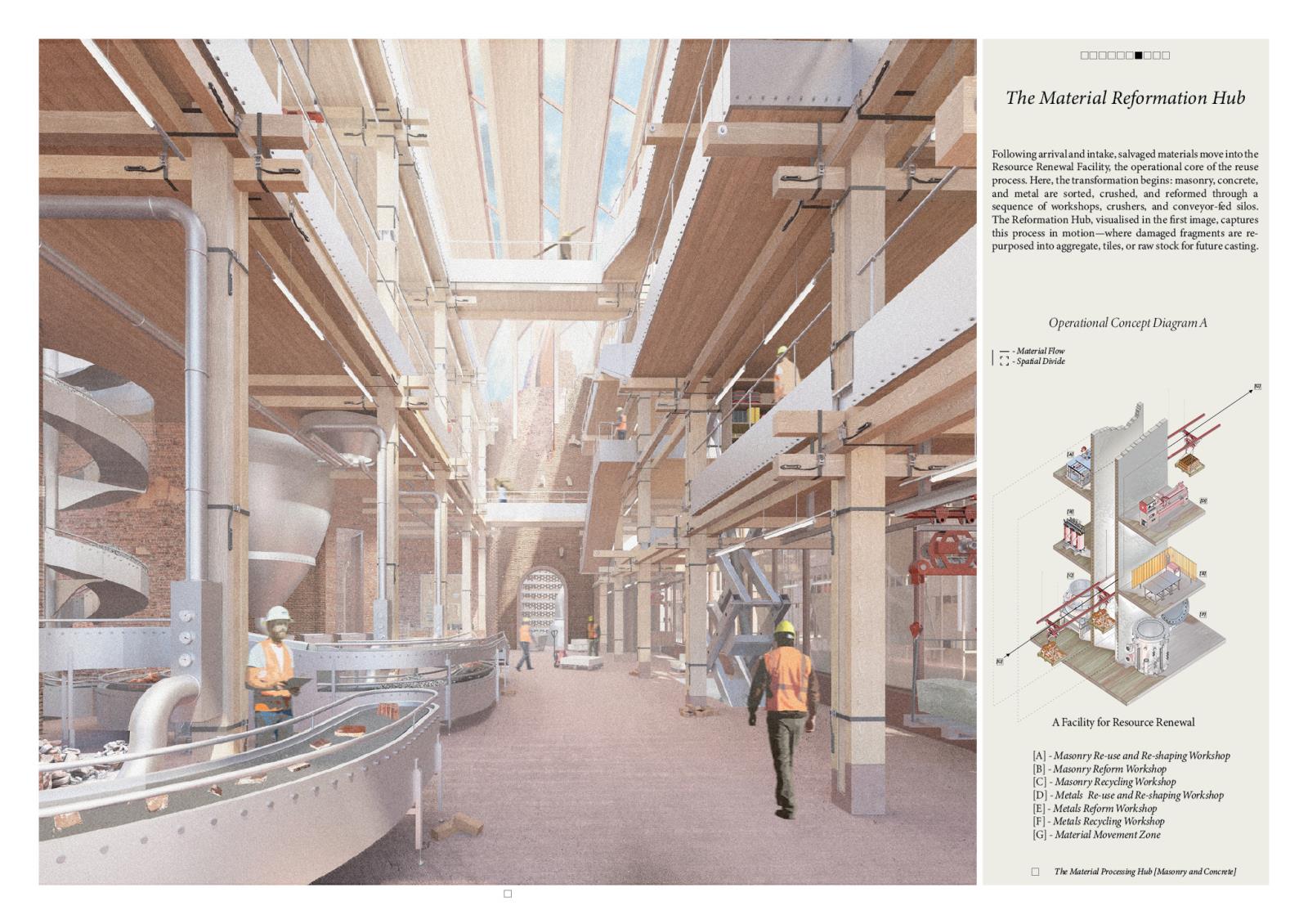 Re-use remains limited by fragmented systems, a lack of infrastructure, and an industry dominated by demolition and raw materials. 'Re:Construct' proposes a scalable alternative, a material reclamation and resource hub embedded within the city, enabling reuse logistics to become part of the built environment.