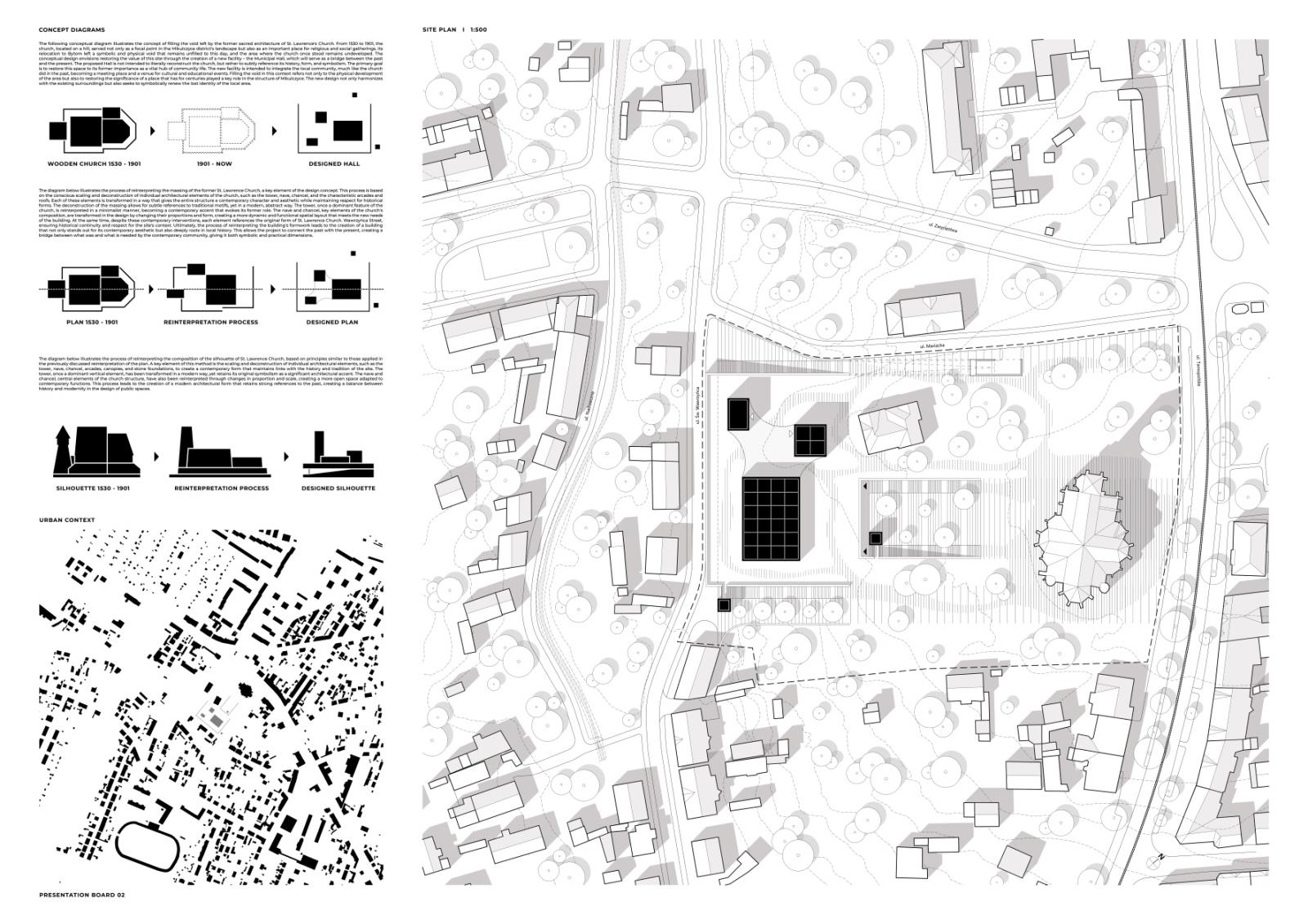 The main idea of this project was to fill the void left after the demolition of the historic wooden Church of St. Lawrence, which stood in Mikulczyce, a district of Zabrze, Poland, until 1901. This loss was not only physical but also emotional and symbolic. The church was an important landmark in the local landscape and social life. Its disappearance left a tangible gap within the community.