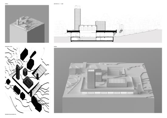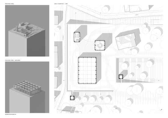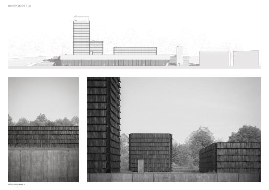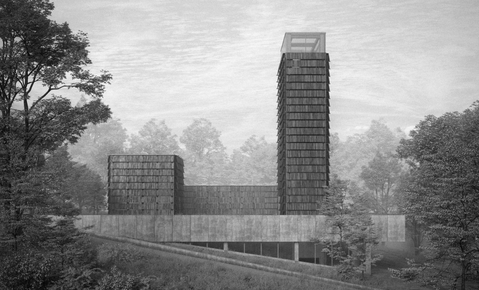 The project aims not only to physically close this void but also to restore social bonds and the symbolic value of the place. A key concept was referencing the historic wooden structure through the reinterpretation of its original architectural forms. Instead of reconstruction, a contemporary transformation of the former church’s volumes and spatial arrangement was proposed, where the tower, nave, and chancel become modern architectural forms.