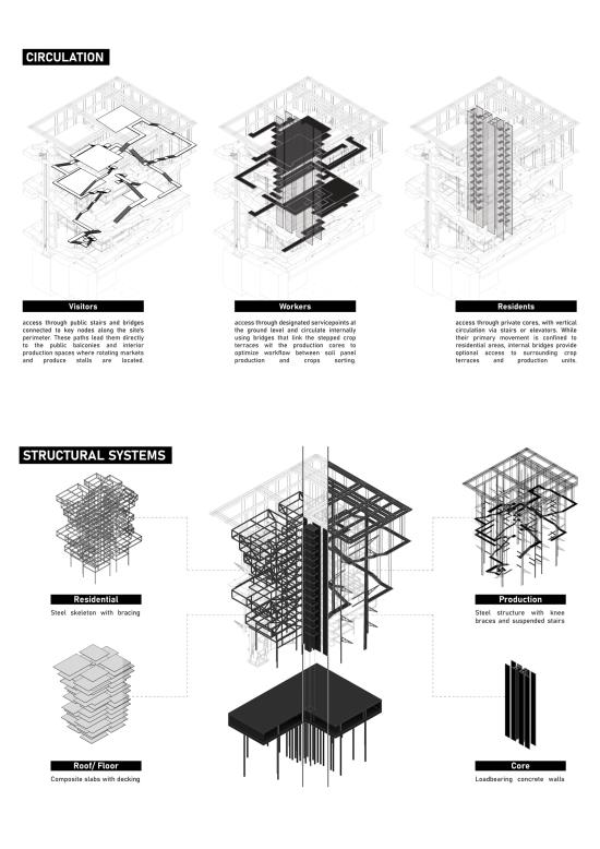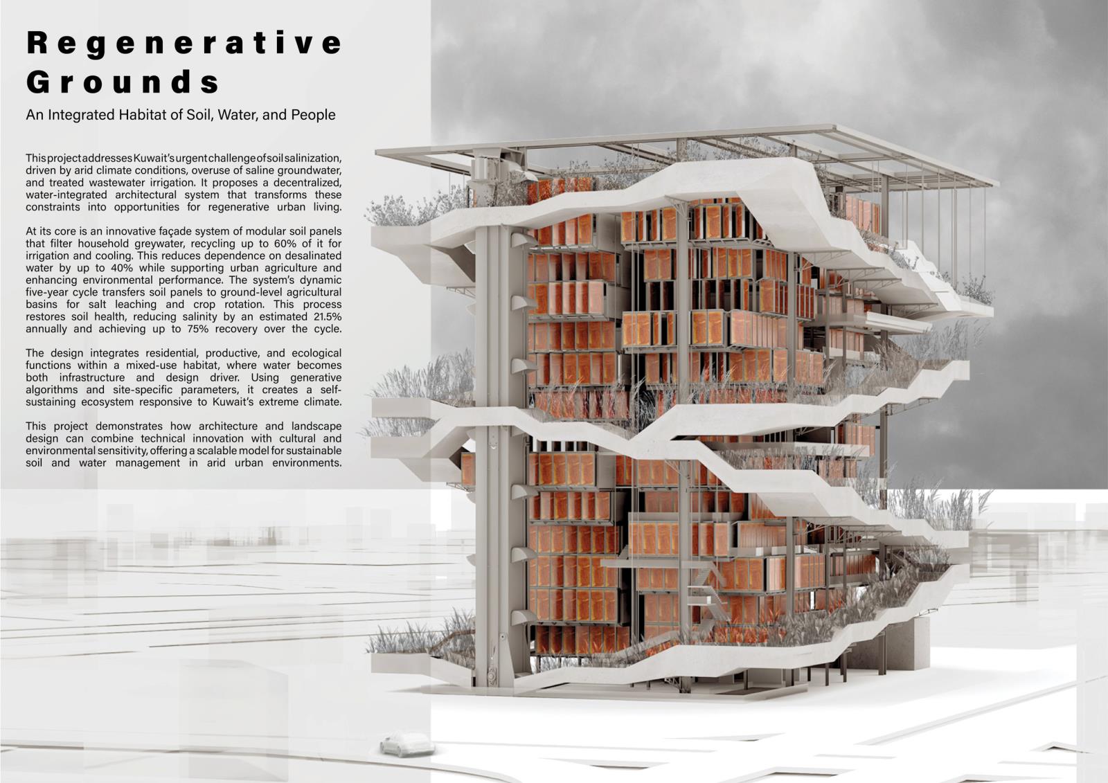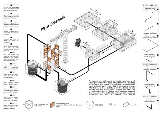 This project addresses Kuwait’s urgent challenge of soil salinization, driven by arid climate conditions, overuse of saline groundwater, and treated wastewater irrigation. It proposes a decentralized, water-integrated architectural system that transforms these constraints into opportunities for regenerative urban living.