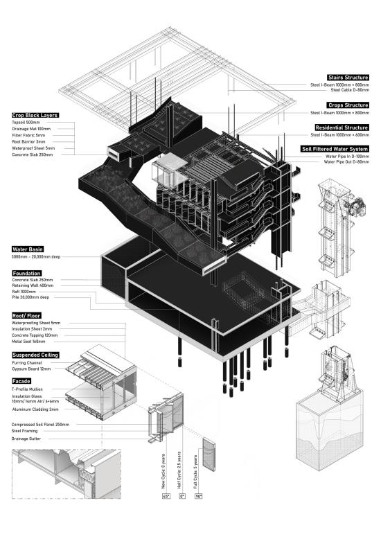 At its core is an innovative façade system of modular soil panels that filter household greywater, recycling up to 60% of it for irrigation and cooling. This reduces dependence on desalinated water by up to 40% while supporting urban agriculture and enhancing environmental performance. The system’s dynamic five-year cycle transfers soil panels to ground-level agricultural basins for salt leaching and crop rotation.