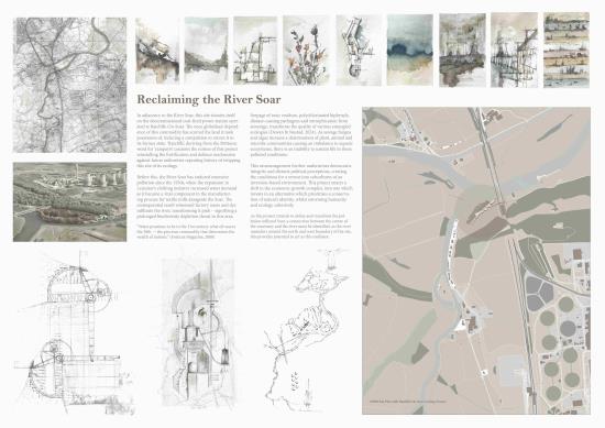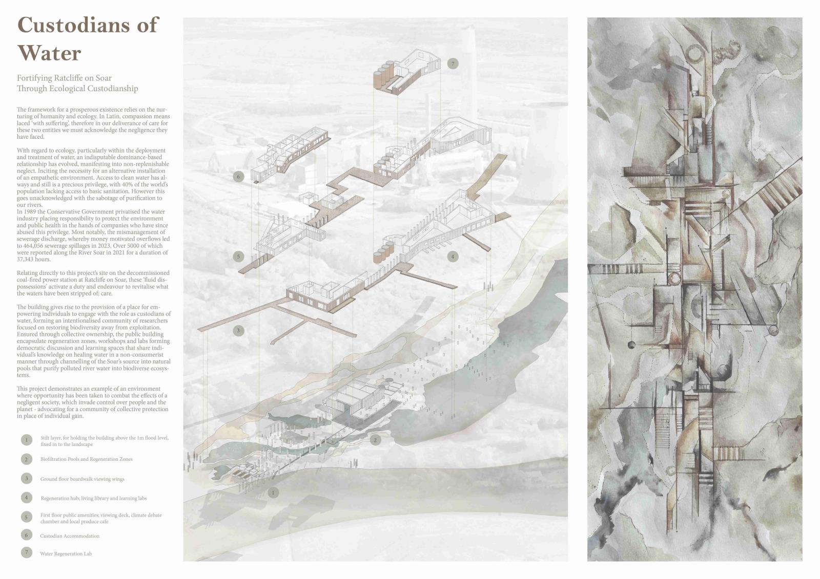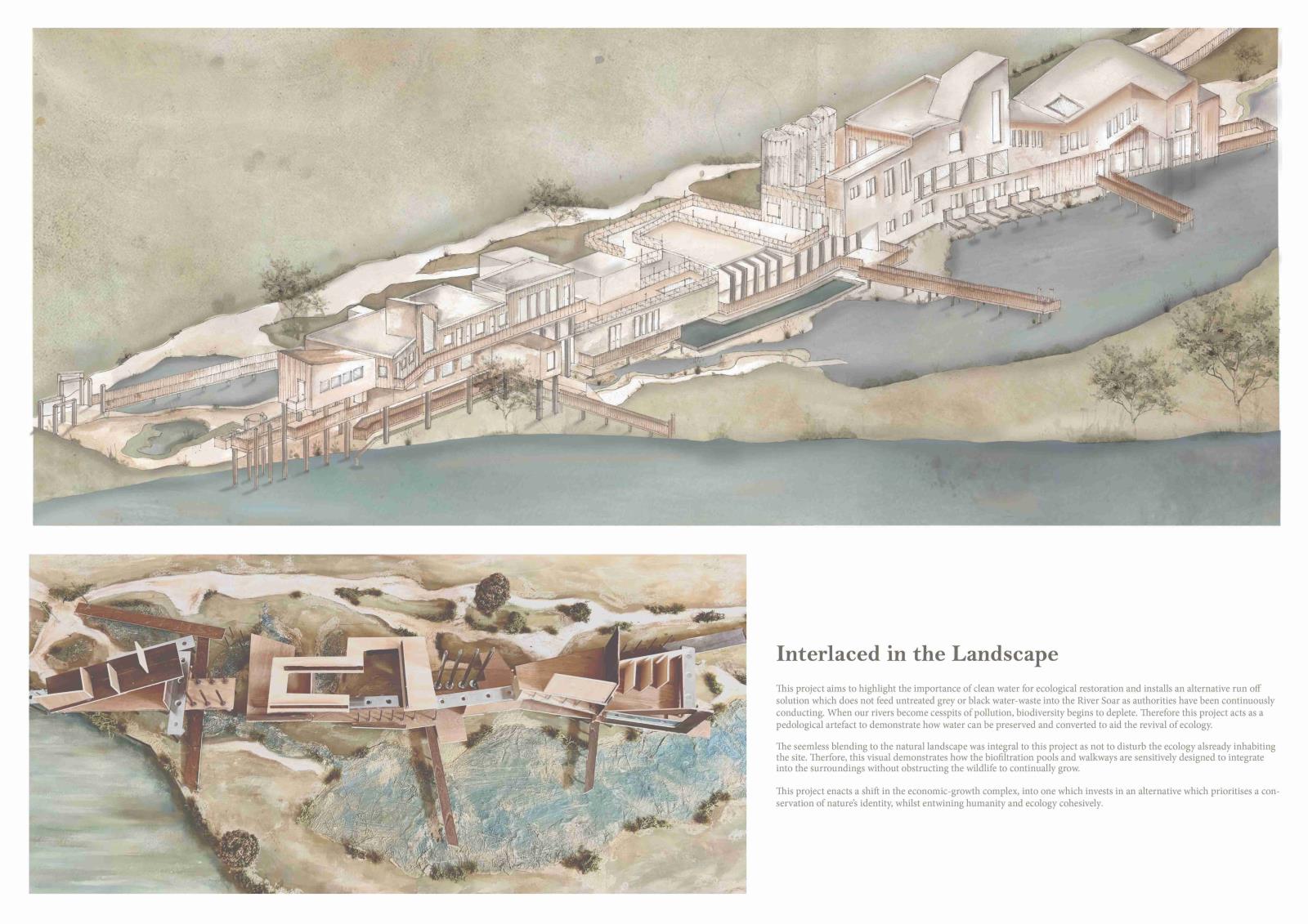 The building gives rise to the provision of a place for empowering individuals to engage with the role as ‘Custodians of Water.’ The public building encapsulates regeneration zones, workshops and labs forming democratic discussion spaces as well as channelling the River Soar into natural pools that purify polluted river water into biodiverse ecosystems.