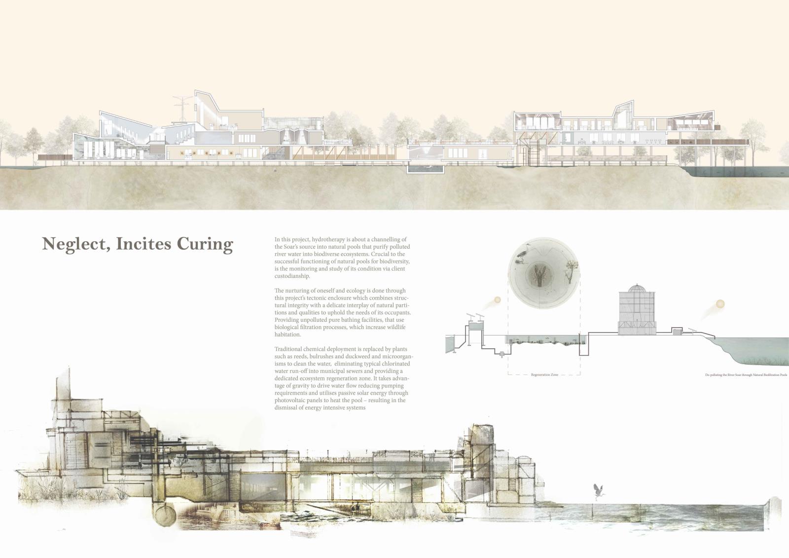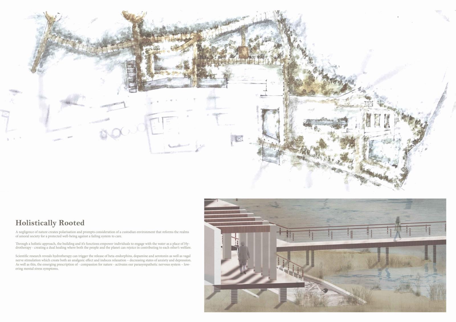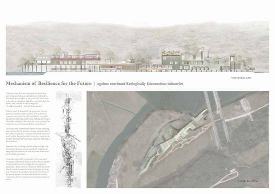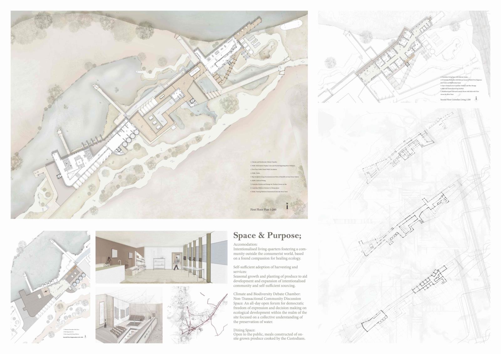 The building gives rise to the provision of a place for empowering individuals to engage with the role as ‘Custodians of Water.’ The public building encapsulates regeneration zones, workshops and labs forming democratic discussion spaces as well as channelling the River Soar into natural pools that purify polluted river water into biodiverse ecosystems.