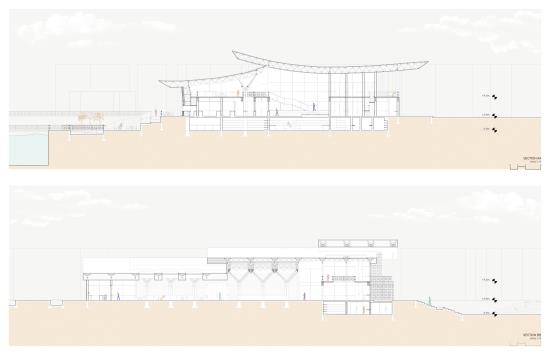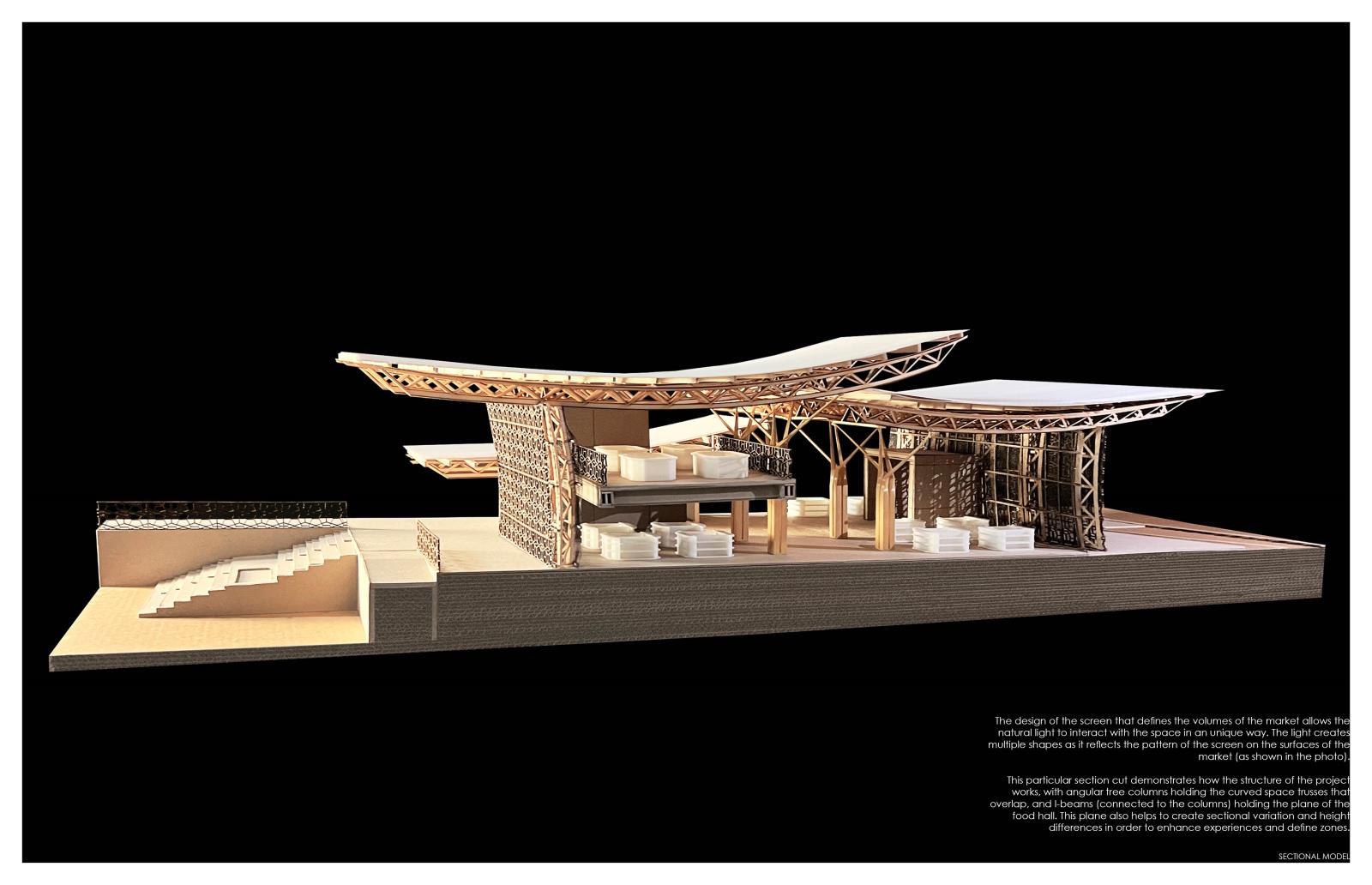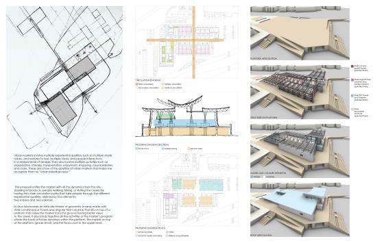 Its structure reveals an intricate interior of geometry that sits on top of a platform that rises the market for enhanced views and binds together all the dynamics that emerge from its program.