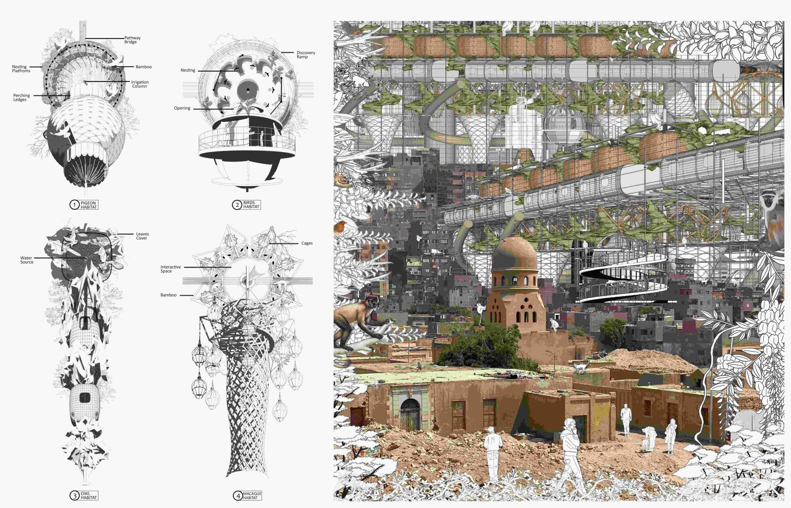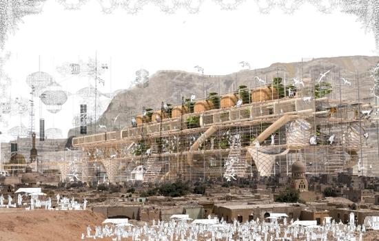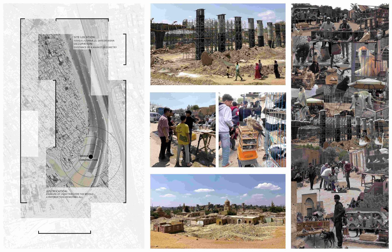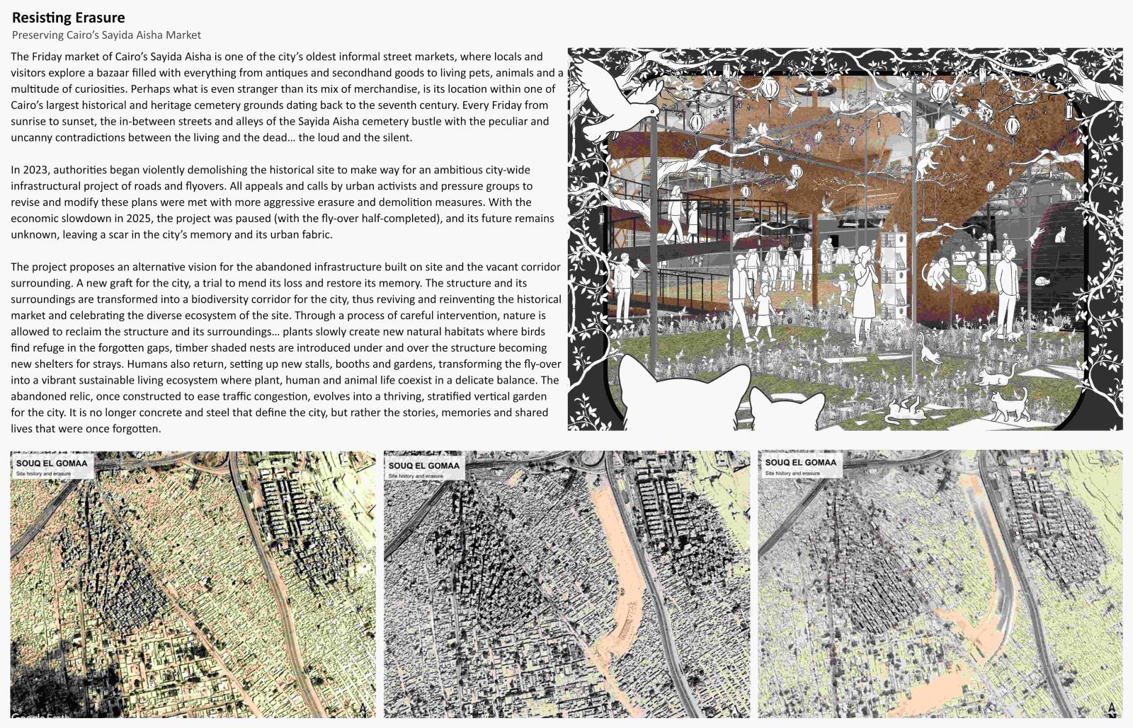 Resisting Erasure Part 1 Project 2025 Lojaina TarekMariam Walid Arab Academy for Science, Technology & Maritime Transport - Smart Village Campus Cairo | Egypt The Friday market of Cairo’s Sayida Aisha is one of the city’s oldest informal street markets, where it is a bazaar filled with everything from antiques and secondhand goods to living pets and animals. It is located within one of Cairo’s largest historical cemeteries. Every Friday the alleys of the Sayida Aisha bustle with peculiar contradictions between the living and the dead… the loud and the silent.In 2023, authorities began demolishing the historical site to construct an infrastructural project of flyovers. All appeals to revise these plans were met with more aggressive erasure and demolition measures. In 2025, the project was paused with the flyover uncompleted.The project proposes an alternative vision for the abandoned infrastructure. The structure and its surroundings are transformed into a biodiversity corridor for the city, thus reviving the historical market and celebrating the diverse ecosystem of the site. Nature is carefully allowed to reclaim the area… plants create natural habitats where birds find refuge in the forgotten gaps, timber nests are introduced as new shelters for strays and humans return, transforming the fly-over into a vibrant ecosystem. The abandoned relic, once constructed to ease traffic congestion, evolves into a vertical garden for the city. Tutor(s)