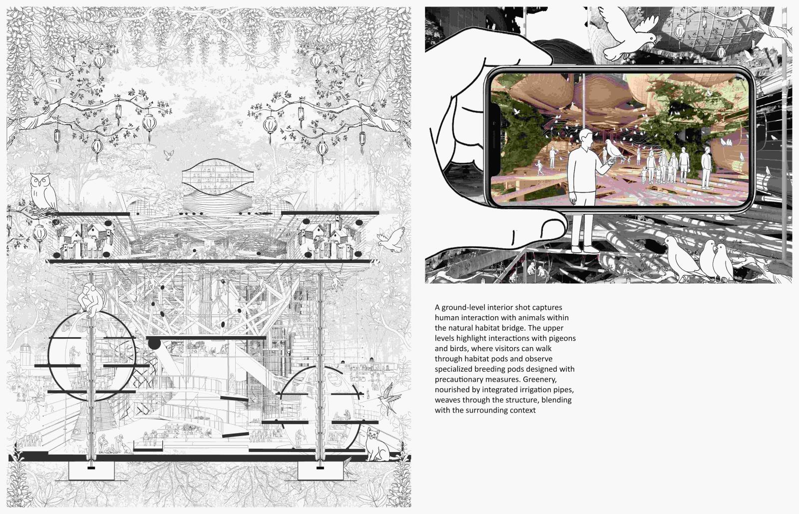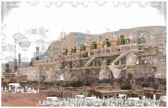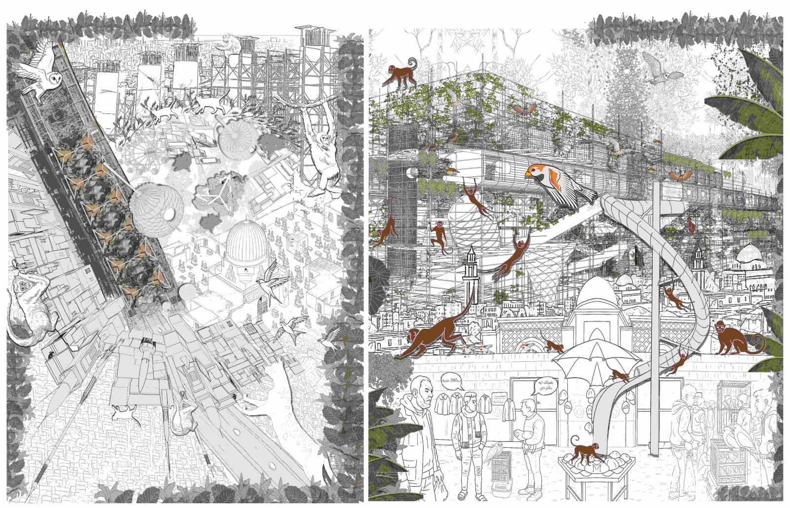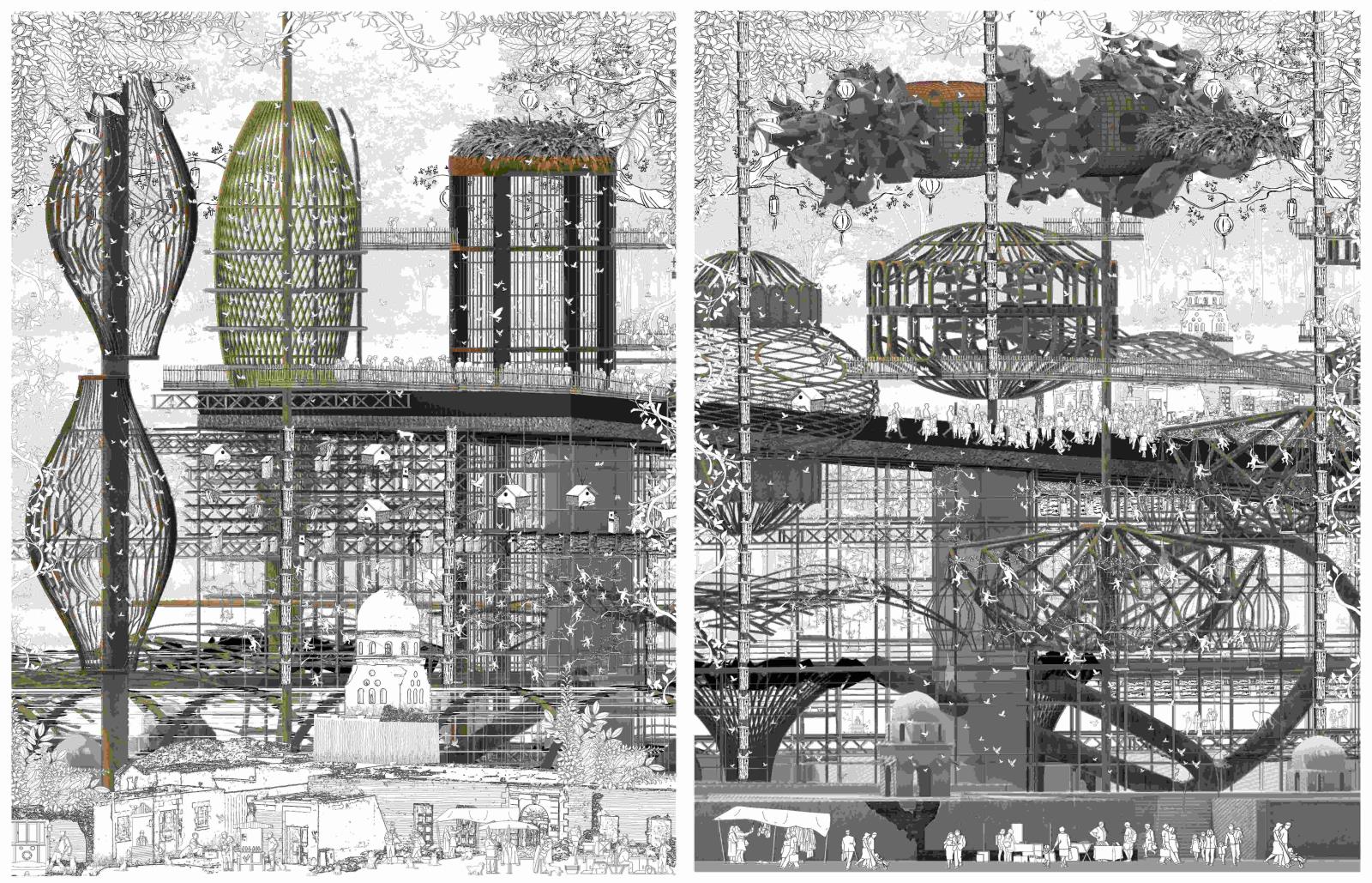 Resisting Erasure Part 1 Project 2025 Lojaina TarekMariam Walid Arab Academy for Science, Technology & Maritime Transport - Smart Village Campus Cairo | Egypt The Friday market of Cairo’s Sayida Aisha is one of the city’s oldest informal street markets, where it is a bazaar filled with everything from antiques and secondhand goods to living pets and animals. It is located within one of Cairo’s largest historical cemeteries. Every Friday the alleys of the Sayida Aisha bustle with peculiar contradictions between the living and the dead… the loud and the silent.In 2023, authorities began demolishing the historical site to construct an infrastructural project of flyovers. All appeals to revise these plans were met with more aggressive erasure and demolition measures. In 2025, the project was paused with the flyover uncompleted.The project proposes an alternative vision for the abandoned infrastructure. The structure and its surroundings are transformed into a biodiversity corridor for the city, thus reviving the historical market and celebrating the diverse ecosystem of the site. Nature is carefully allowed to reclaim the area… plants create natural habitats where birds find refuge in the forgotten gaps, timber nests are introduced as new shelters for strays and humans return, transforming the fly-over into a vibrant ecosystem. The abandoned relic, once constructed to ease traffic congestion, evolves into a vertical garden for the city. Tutor(s)