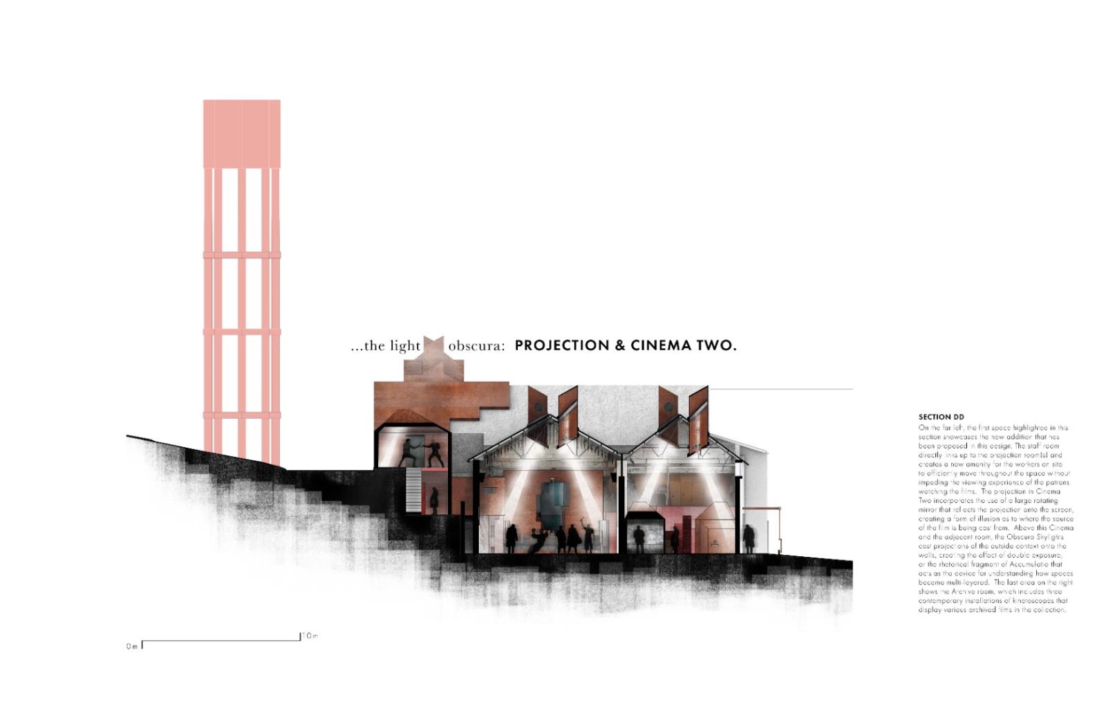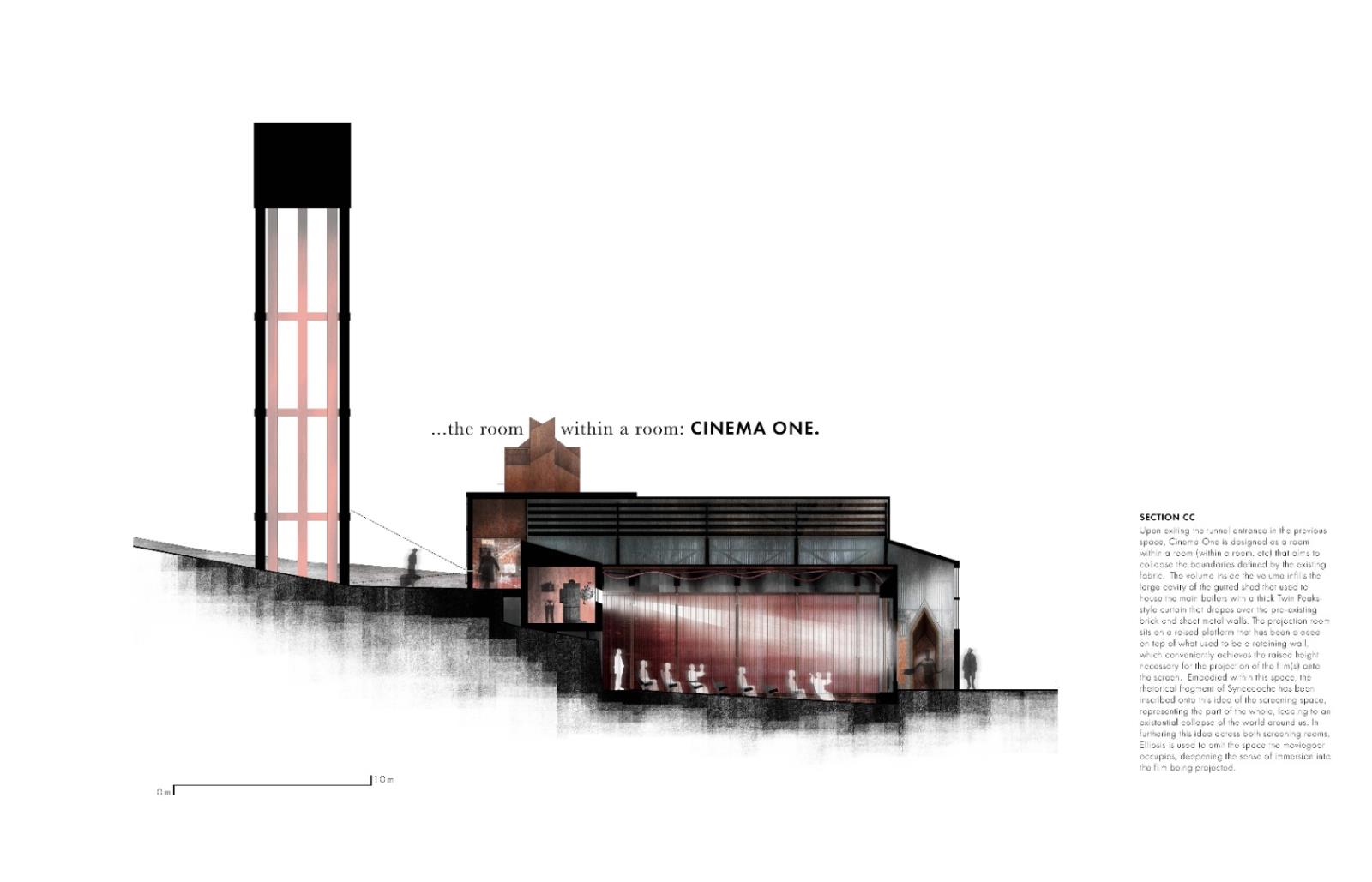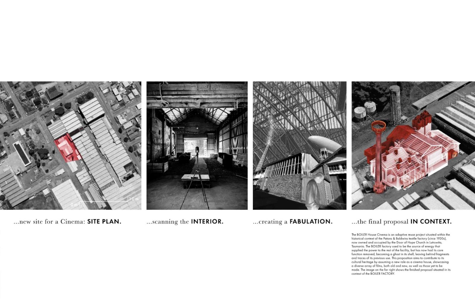 The BOILER House Cinema is an adaptive reuse project situated within the historic context of the Polons & Baldwins textile factory (circa 1920s), now owned and occupied by the Door of Hope Church in Lutruwita, Tasmania. The BOILER factory once supplied energy to the entire facility but has now lost its core function, becoming a shell of its former self, leaving behind fragments and traces of its past use. This proposal aims to contribute to its cultural heritage by assuming a new role as a cinema, showcasing a diverse array of films, both old and new, as well as those yet to be made. At the heart of the concept, this cinema - or Temple of Sensalion(sJ - uses film as a rhetorical device to amplify architecture, acting to clarify the ambiguities that arise when these two disciplines intertwine. The four main fragments of the project (with others implicitly embedded) - Synecdoche, Ellipsis, Accumulatio, and Hyperbole - form the framework for the BOILER's conceptual and material design as a cinema, constituting on overall image and eliciting a proposal that represents an experiential space in pursuit of poetic and emotional affect.