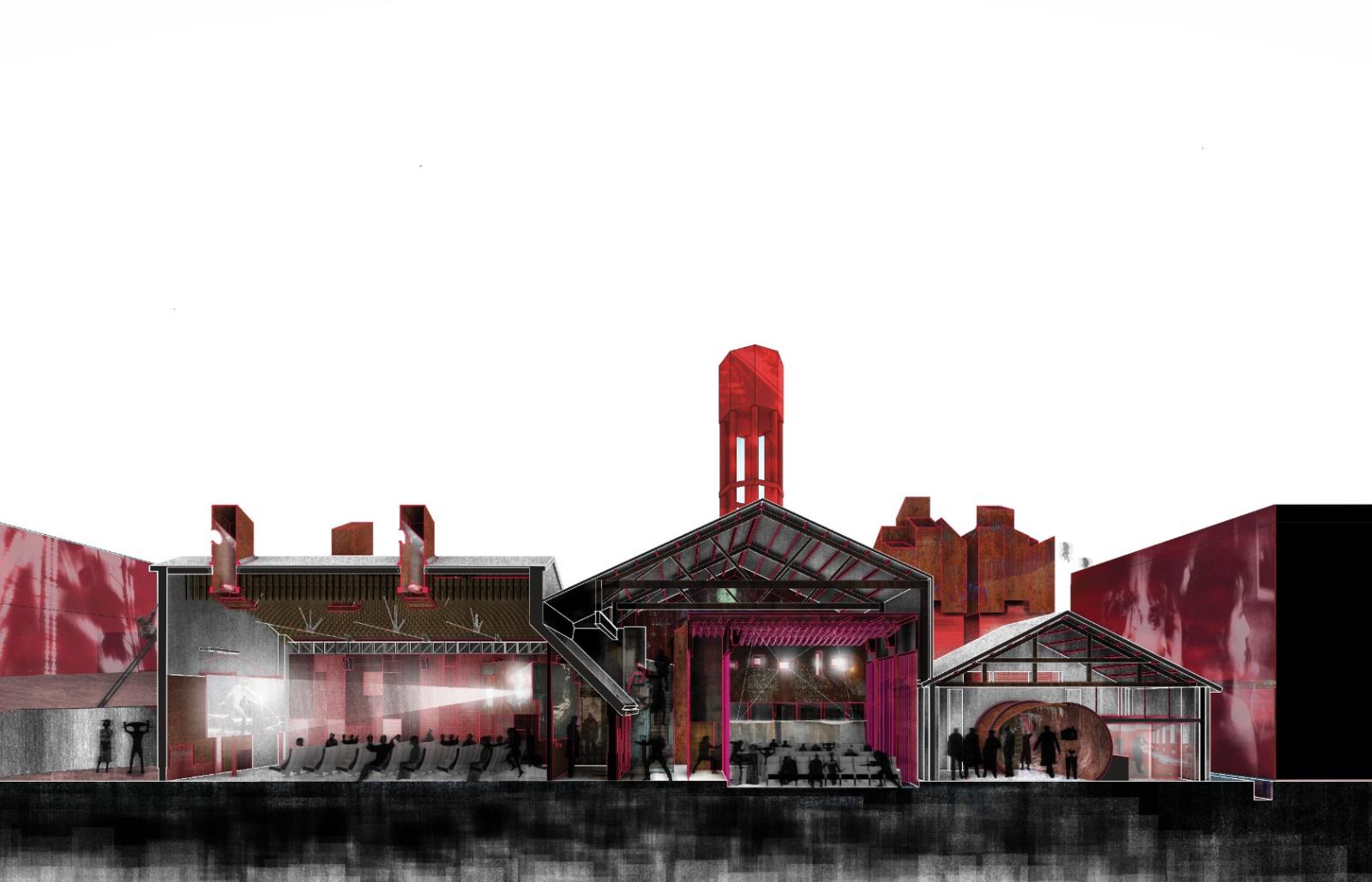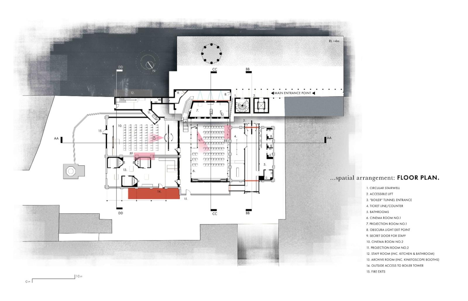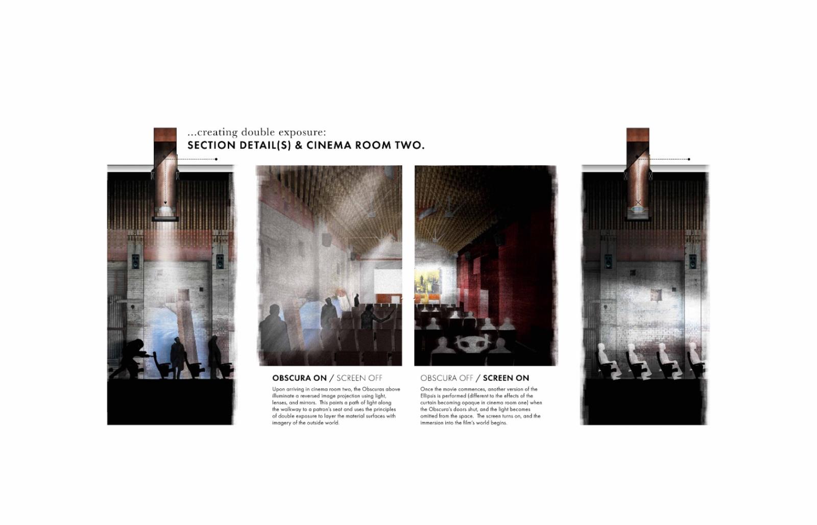 The BOILER House Cinema is an adaptive reuse project situated within the historic context of the Polons & Baldwins textile factory (circa 1920s), now owned and occupied by the Door of Hope Church in Lutruwita, Tasmania. The BOILER factory once supplied energy to the entire facility but has now lost its core function, becoming a shell of its former self, leaving behind fragments and traces of its past use. This proposal aims to contribute to its cultural heritage by assuming a new role as a cinema, showcasing a diverse array of films, both old and new, as well as those yet to be made. At the heart of the concept, this cinema - or Temple of Sensalion(sJ - uses film as a rhetorical device to amplify architecture, acting to clarify the ambiguities that arise when these two disciplines intertwine. The four main fragments of the project (with others implicitly embedded) - Synecdoche, Ellipsis, Accumulatio, and Hyperbole - form the framework for the BOILER's conceptual and material design as a cinema, constituting on overall image and eliciting a proposal that represents an experiential space in pursuit of poetic and emotional affect.
