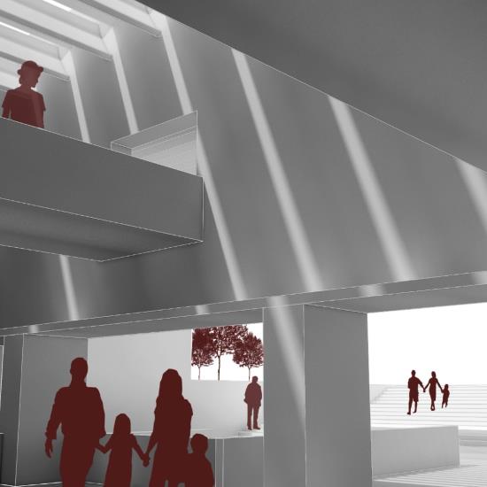The museum’s layout is defined by the arrangement of intersecting planes that create open, transitional spaces of varying scales. This composition moves away from the idea of a solid volume and instead generates routes shaped by voids, thresholds, and subtle contrasts between light and shadow.