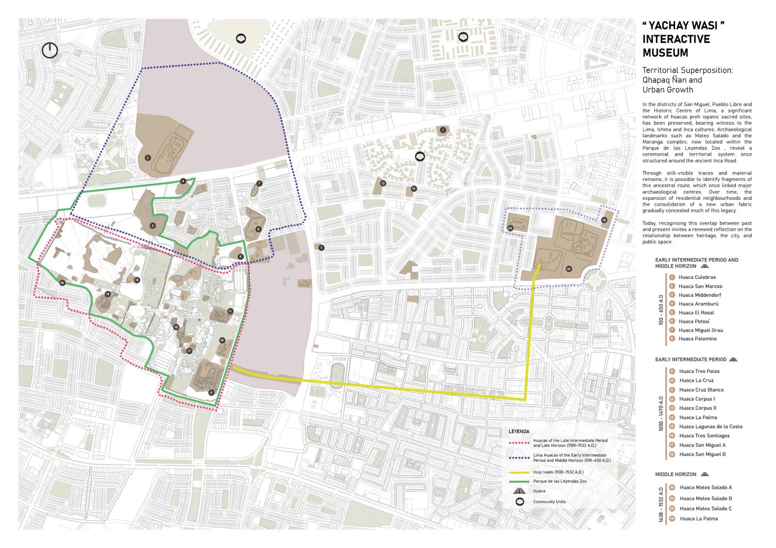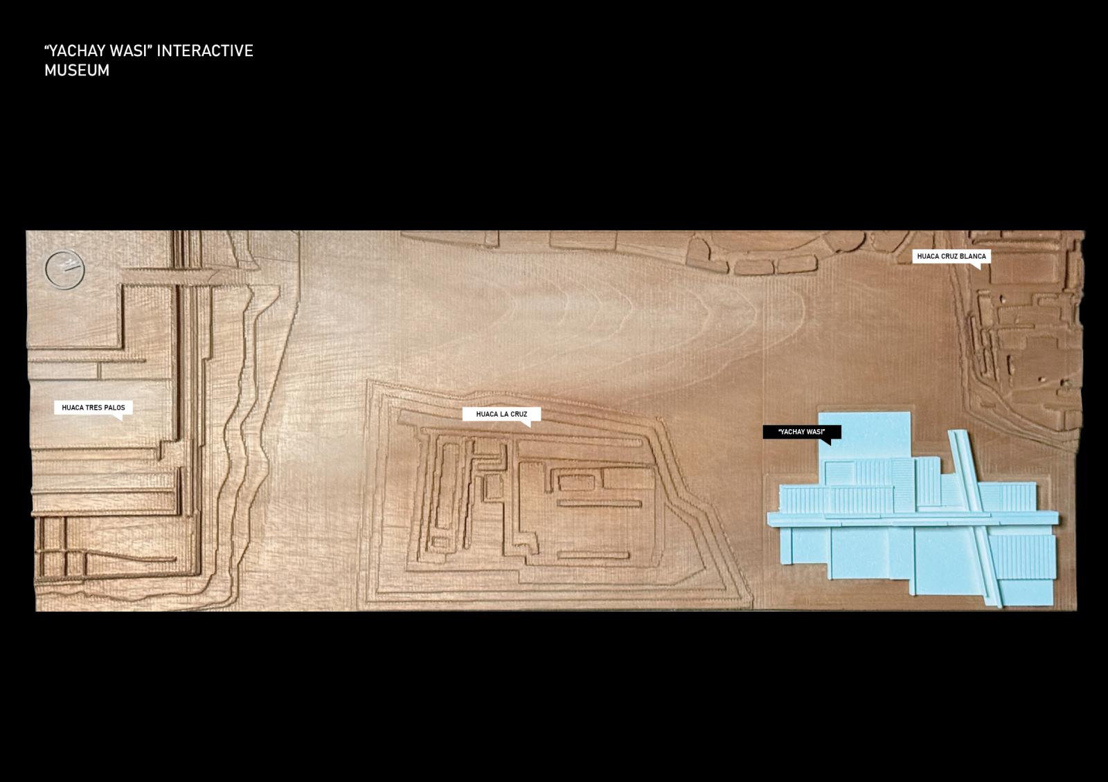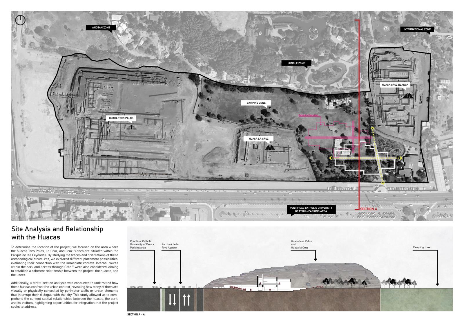 Drawing inspiration from identifiable architectural elements in the huacas — such as platforms, walls, and paths — the project seeks to integrate into the archaeological context without replicating or overpowering it. Through public spaces and pedestrian connections, the proposal offers an open architecture that encourages visitors to rediscover the heritage landscape from a contemporary perspective.