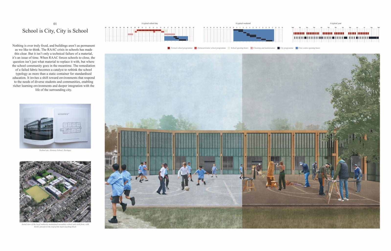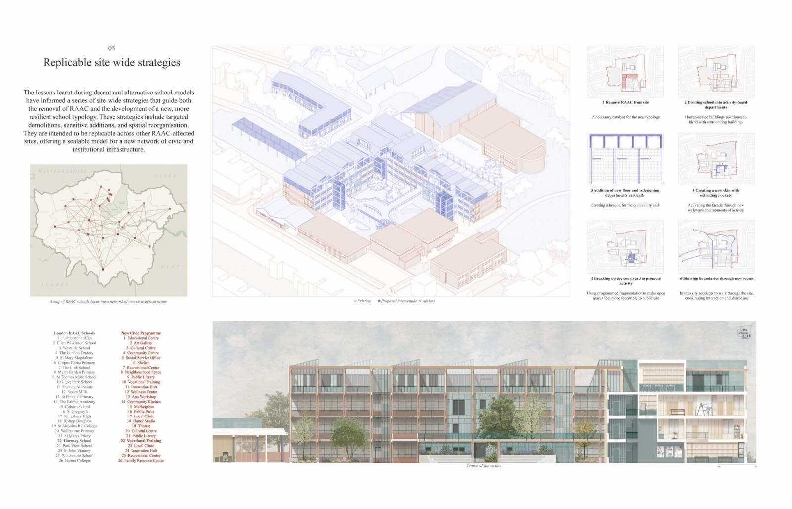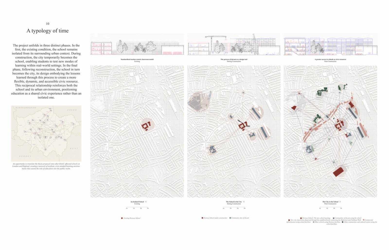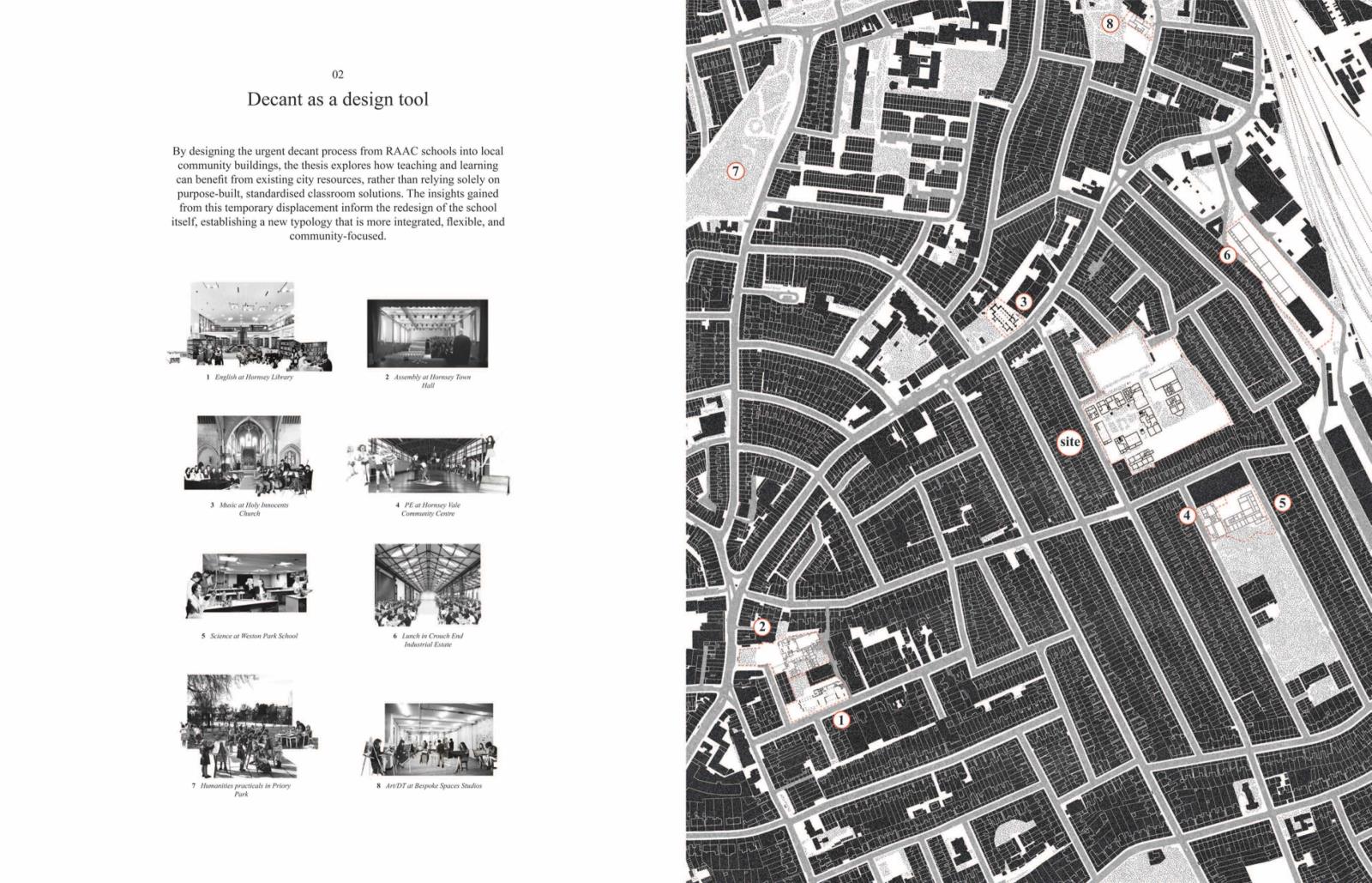 The thesis uses the RAAC crisis as a catalyst to question not only the technical failure of a material, but the deeper typological redundancy embedded in the UK's mainstream school system. Using Hornsey School in Haringey as a testbed, the project responds directly to DfE policy on RAAC management and capital funding, critiquing the current tendency towards like-for-like replacement with a radical alternative which can benefit both education and the wider civic landscape. Rather than treating decant as temporary disruption, the project reframes it as a design tool, using the relocation of students into nearby civic buildings to test new spatial models for learning. These include libraries, coworking studios, parks, and town halls, which offer multi-sensory, real-world learning experiences that surpass the limits of traditional classrooms. The pedagogical insights gained from this urban dispersal directly inform the design of a new school typology: not just a rebuilt school, but a future-facing civic institution, co-owned by its community, embedded in its context, and capable of evolving over time.