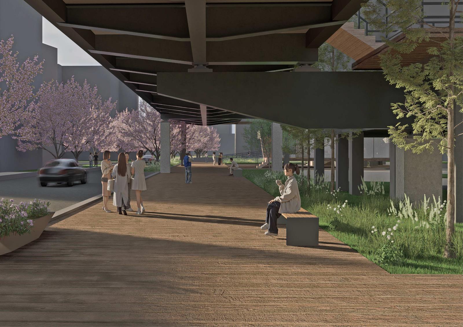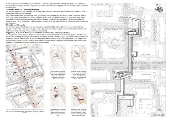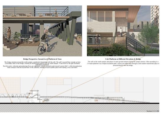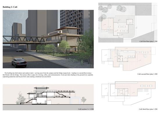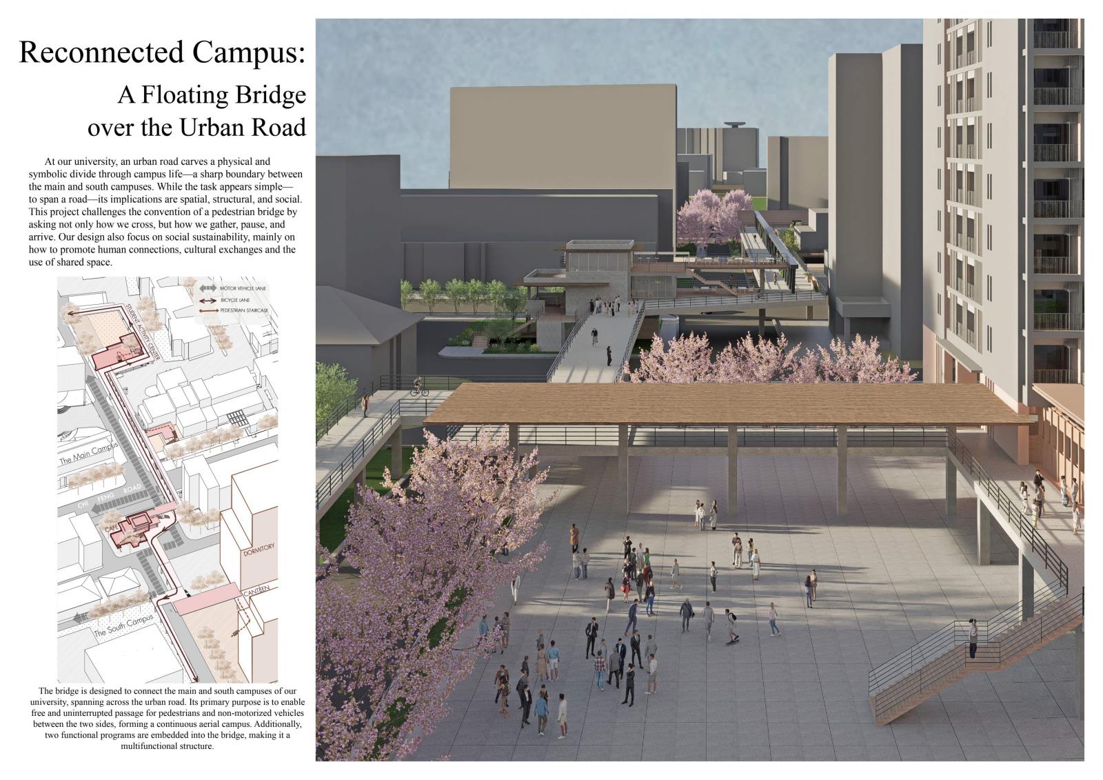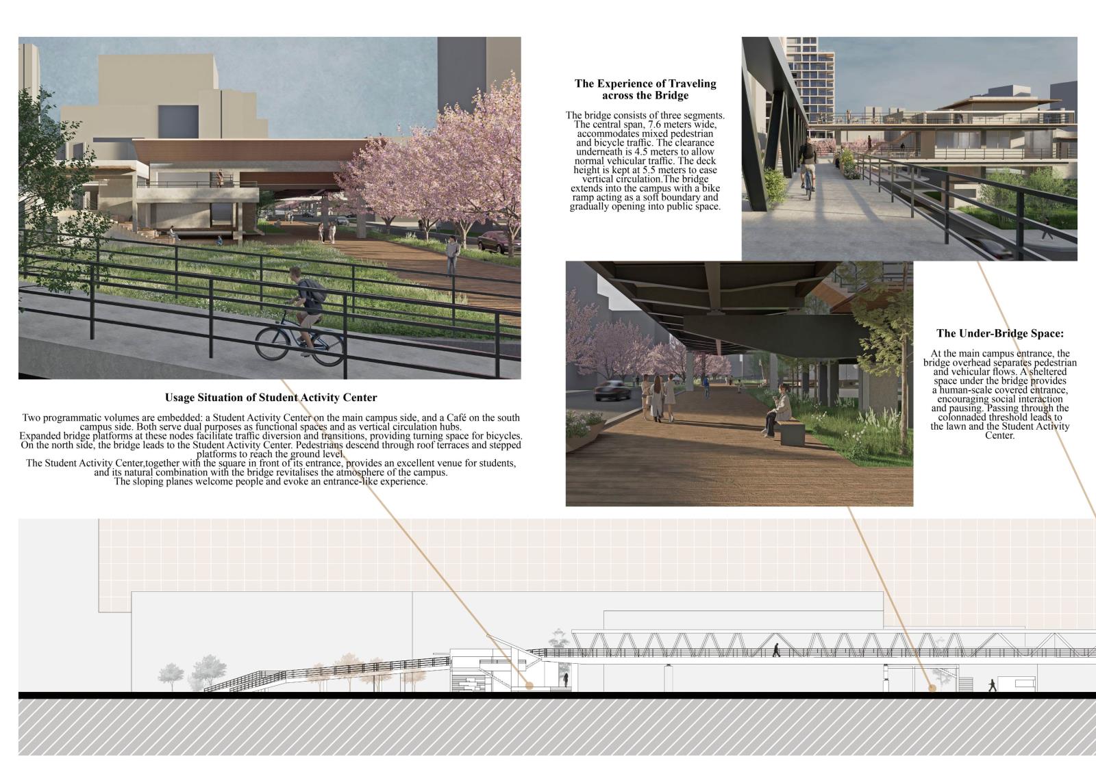 The project proposes an innovative sky bridge solution to resolve the fragmentation of the campus caused by the urban road, reconnecting the dispersed areas, reshaping the campus gateway form, and allowing vibrant public life to span the two campuses.