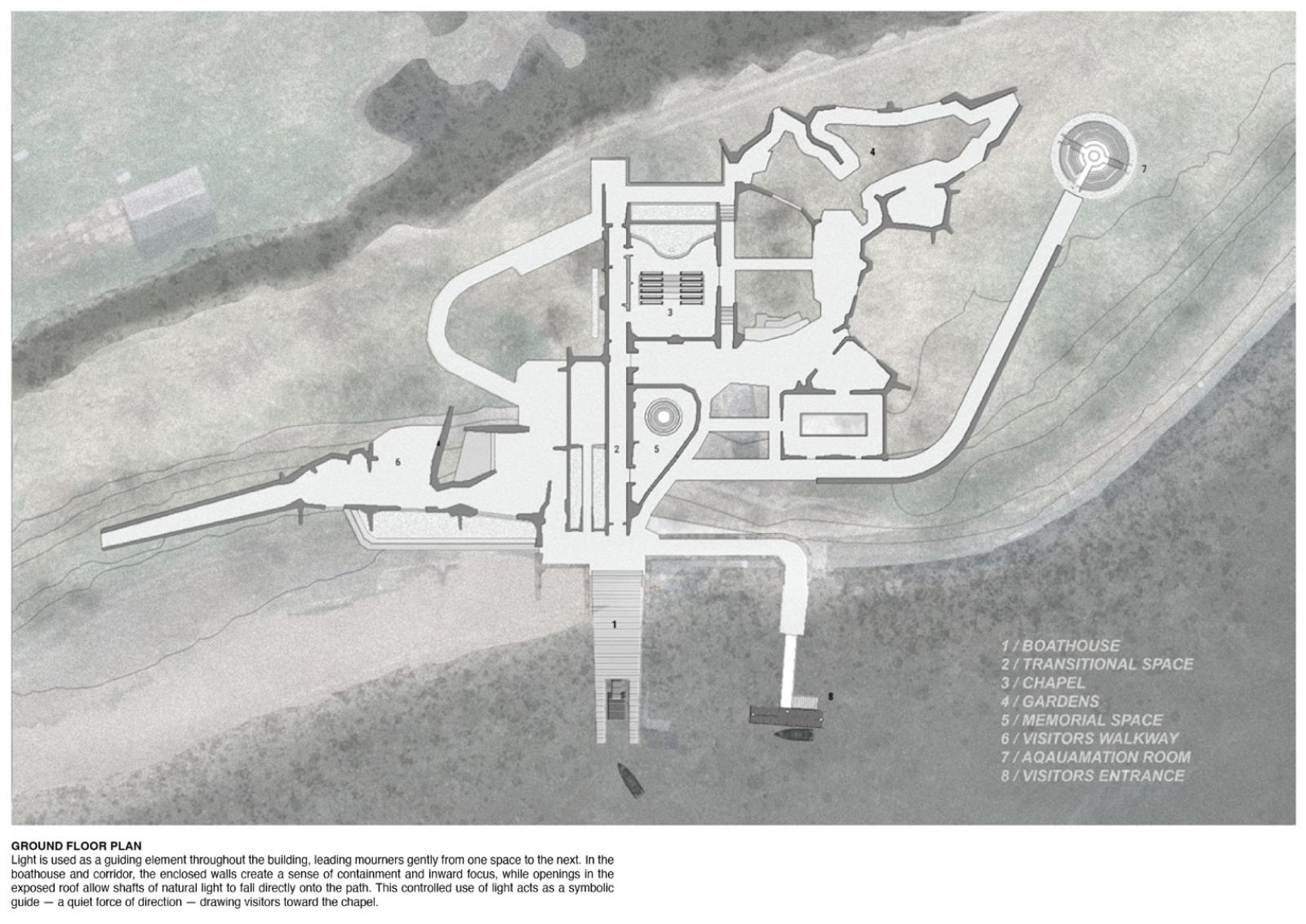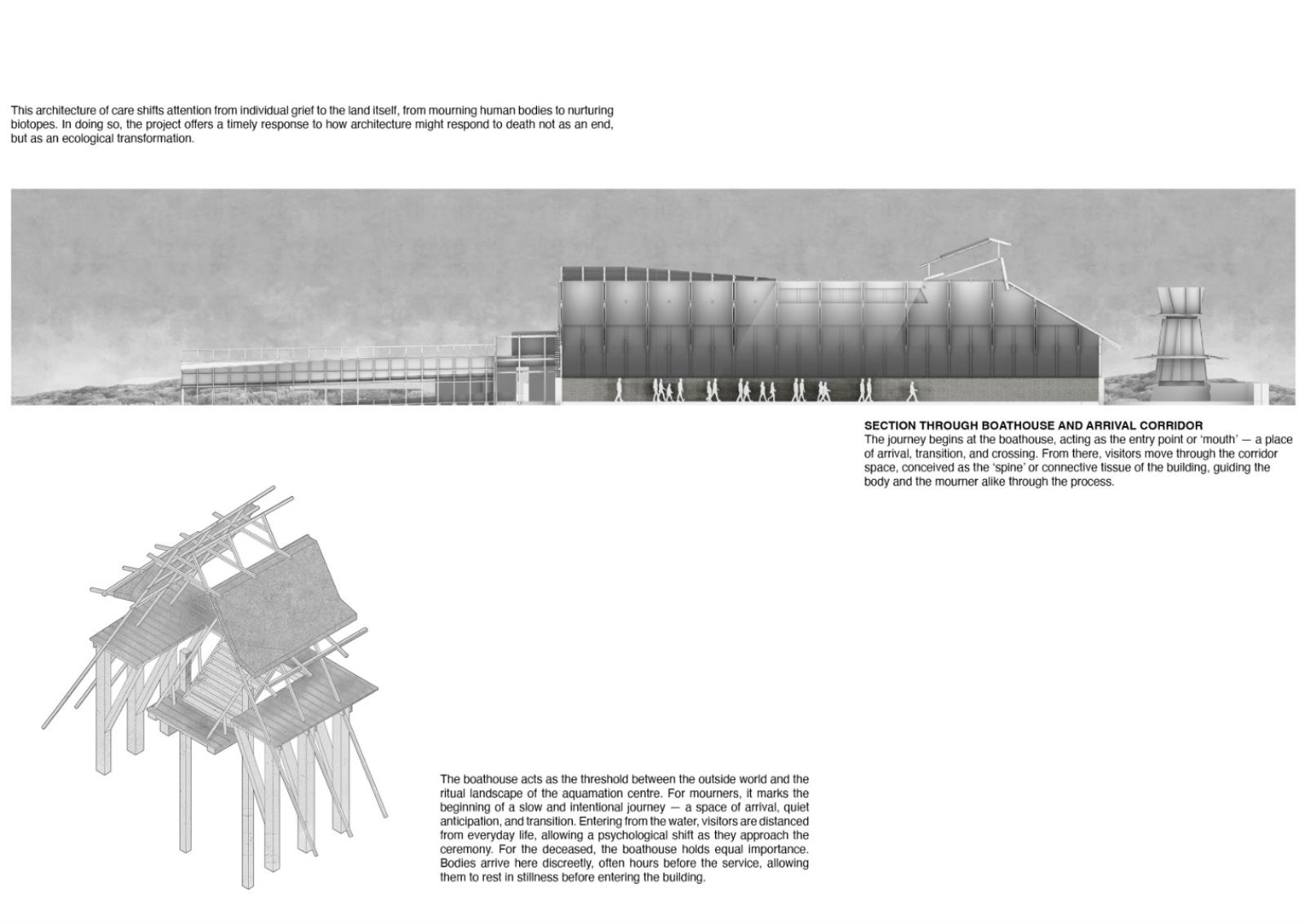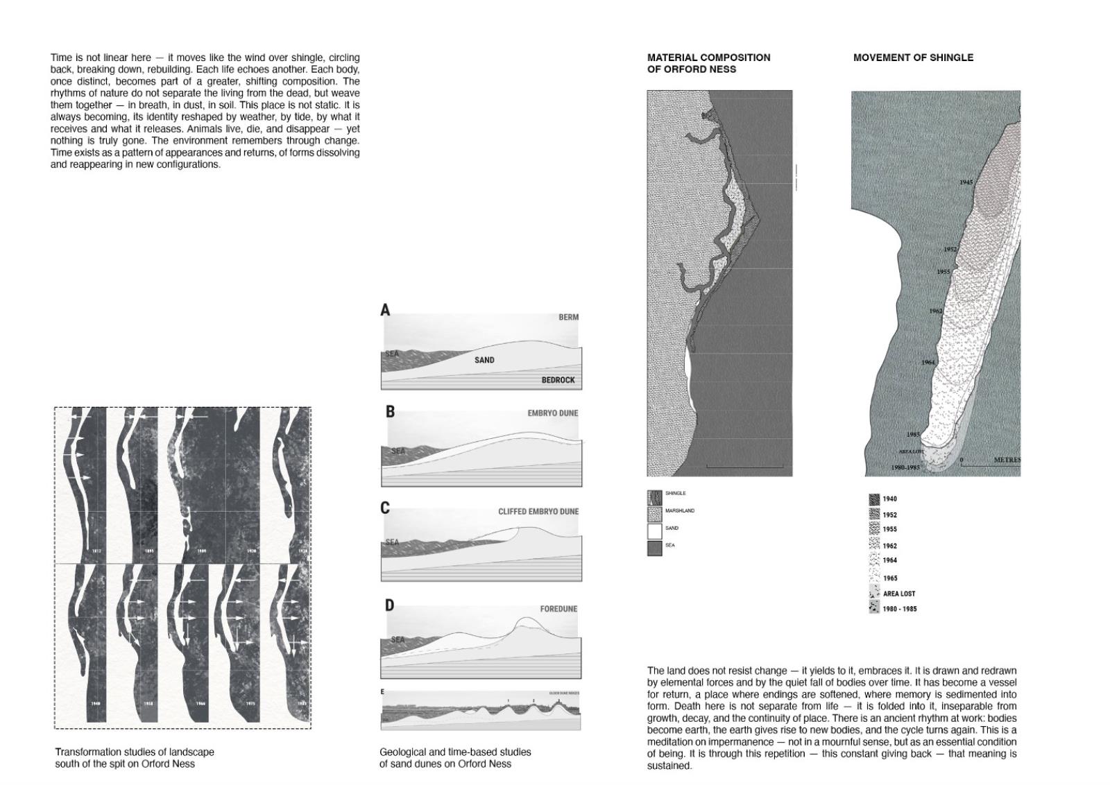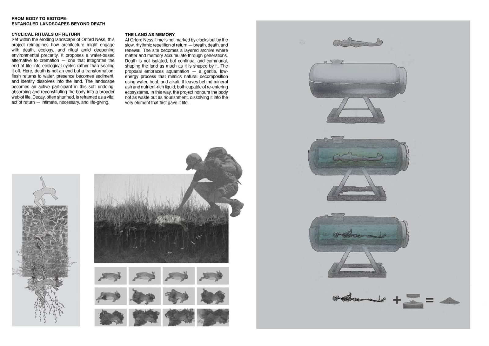 This design project proposes an Aquamation Centre at the arrival platform of Orfordness, offering a gentle, ecological alternative to traditional body disposition. Rooted in the process of water cremation, the centre transforms death into a ritual of return – where the body dissolves, nourishes, and re-enters the island’s fragile ecosystem as part of an ongoing cycle. Drawing on theories of impermanence and ecological interdependence, the proposal reframes death not as an end, but as a generative act embedded within the temporal rhythms of the landscape. The design unfolds as a sequence of symbolic spaces, inspired by body, water, and plant metaphors. Materially grounded in the site – using flint, thatch, and timber – and responsive to Orfordness’ history of erosion, decay, and resilience, the building embraces change. A living façade decomposes over time, supporting habitats, while water and bone remnants from aquamation are reintegrated into the land, nourishing plant life. Positioned at the site’s ferry arrival point, the centre acts as both gateway and threshold – initiating a contemplative journey into ritual space. Through architecture, the project fosters reflection, ecological repair, and emotional renewal reinforcing Orfordness as a place where memory, matter and meaning are continually reshaped by the movement of water.