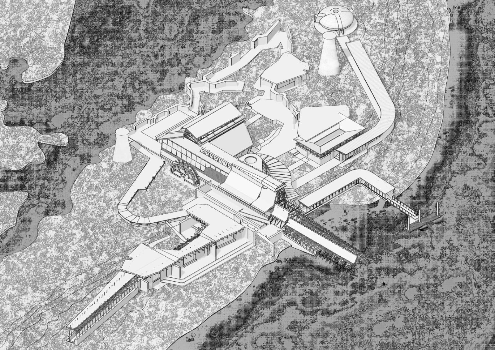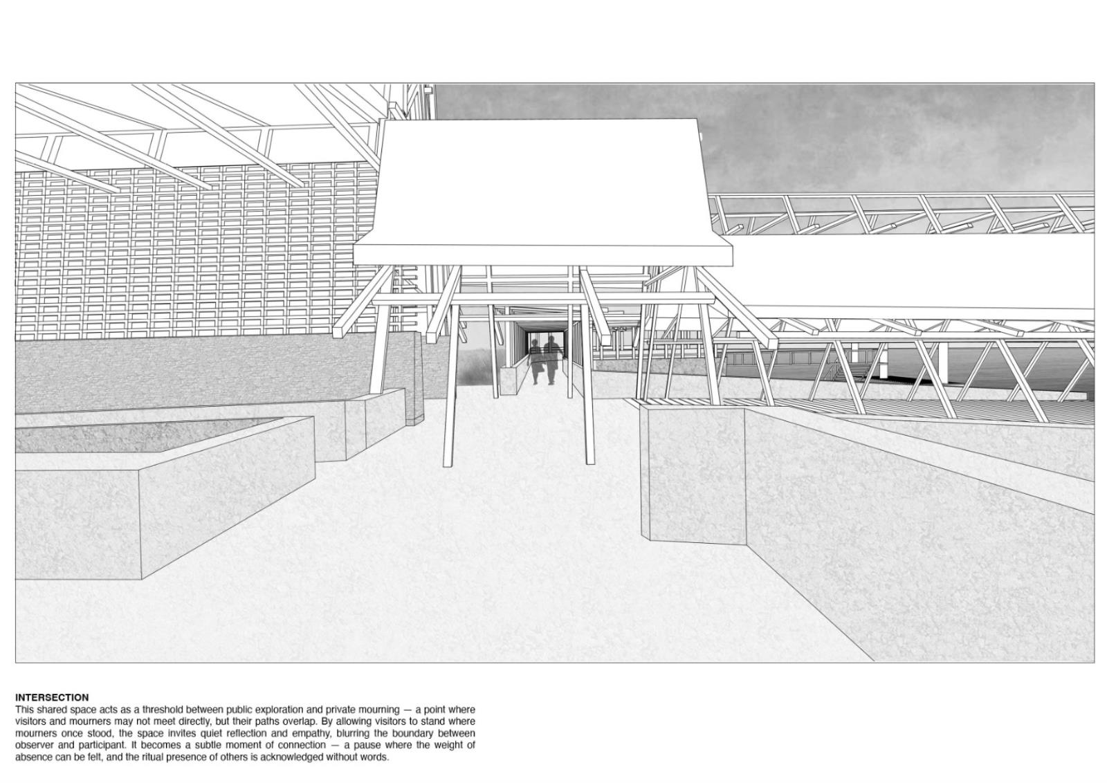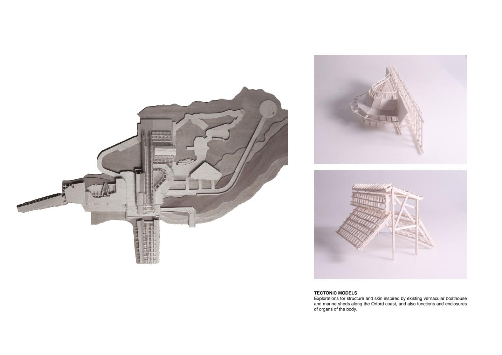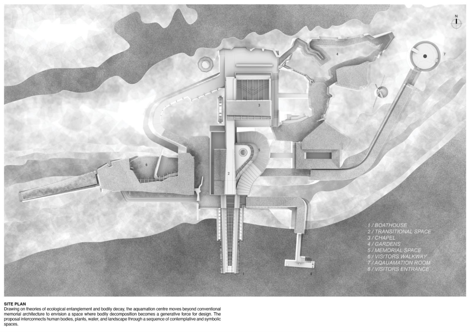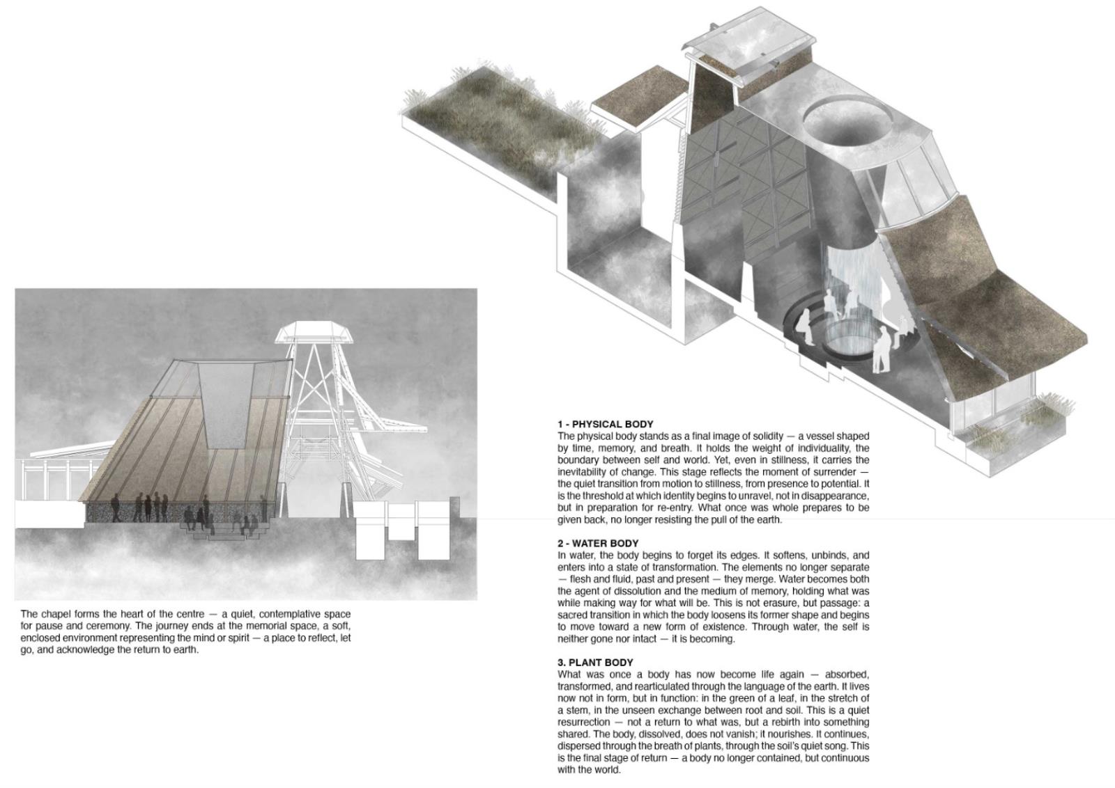 This design project proposes an Aquamation Centre at the arrival platform of Orfordness, offering a gentle, ecological alternative to traditional body disposition. Rooted in the process of water cremation, the centre transforms death into a ritual of return – where the body dissolves, nourishes, and re-enters the island’s fragile ecosystem as part of an ongoing cycle. Drawing on theories of impermanence and ecological interdependence, the proposal reframes death not as an end, but as a generative act embedded within the temporal rhythms of the landscape. The design unfolds as a sequence of symbolic spaces, inspired by body, water, and plant metaphors. Materially grounded in the site – using flint, thatch, and timber – and responsive to Orfordness’ history of erosion, decay, and resilience, the building embraces change. A living façade decomposes over time, supporting habitats, while water and bone remnants from aquamation are reintegrated into the land, nourishing plant life. Positioned at the site’s ferry arrival point, the centre acts as both gateway and threshold – initiating a contemplative journey into ritual space. Through architecture, the project fosters reflection, ecological repair, and emotional renewal reinforcing Orfordness as a place where memory, matter and meaning are continually reshaped by the movement of water.