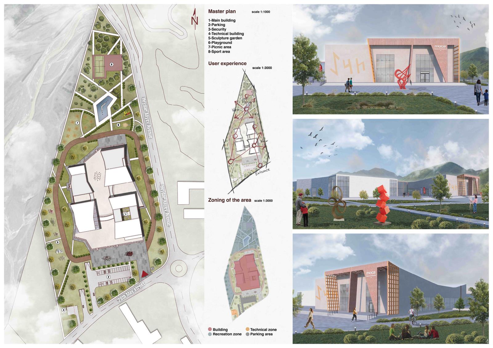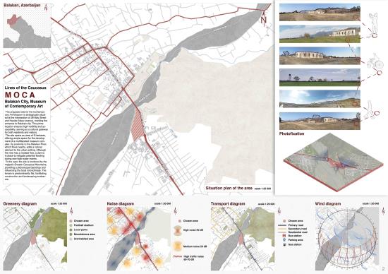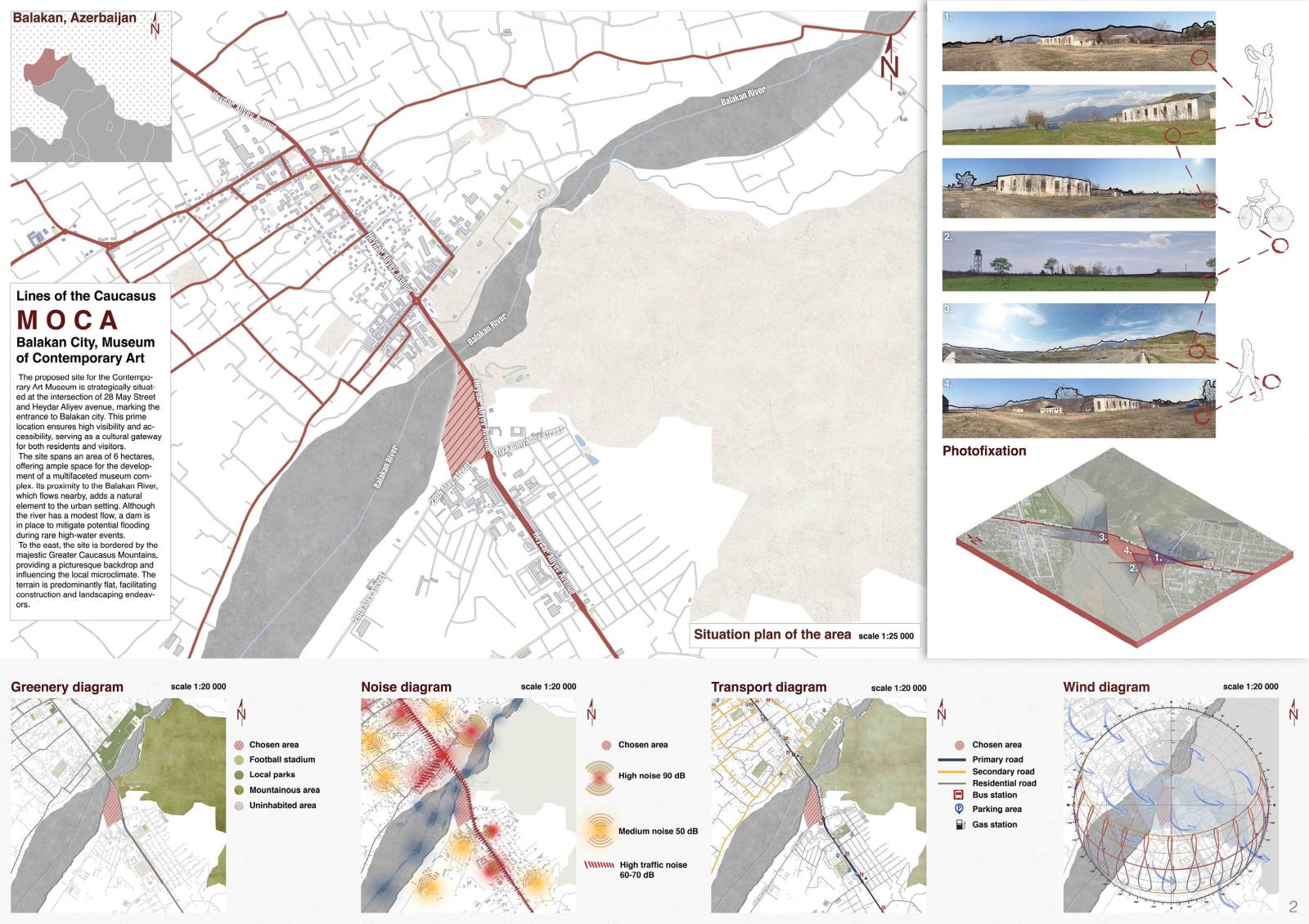 Balakan, located in the Greater Caucasus Mountains and on the national border has the potential to attract visitors. The site spans an area of six hectares. Its proximity to the Balakan River, which flows nearby, adds a natural element to the urban setting. Surrounded by the Greater Caucasus Mountains, the museum becomes a part of the natural ecosystem, with its roof dancing to the rhythm of the surrounding slopes. The idea was not to compete with the mountains but to enter a dialogue with them, creating a harmony between built form and slope lines of the Caucasus.