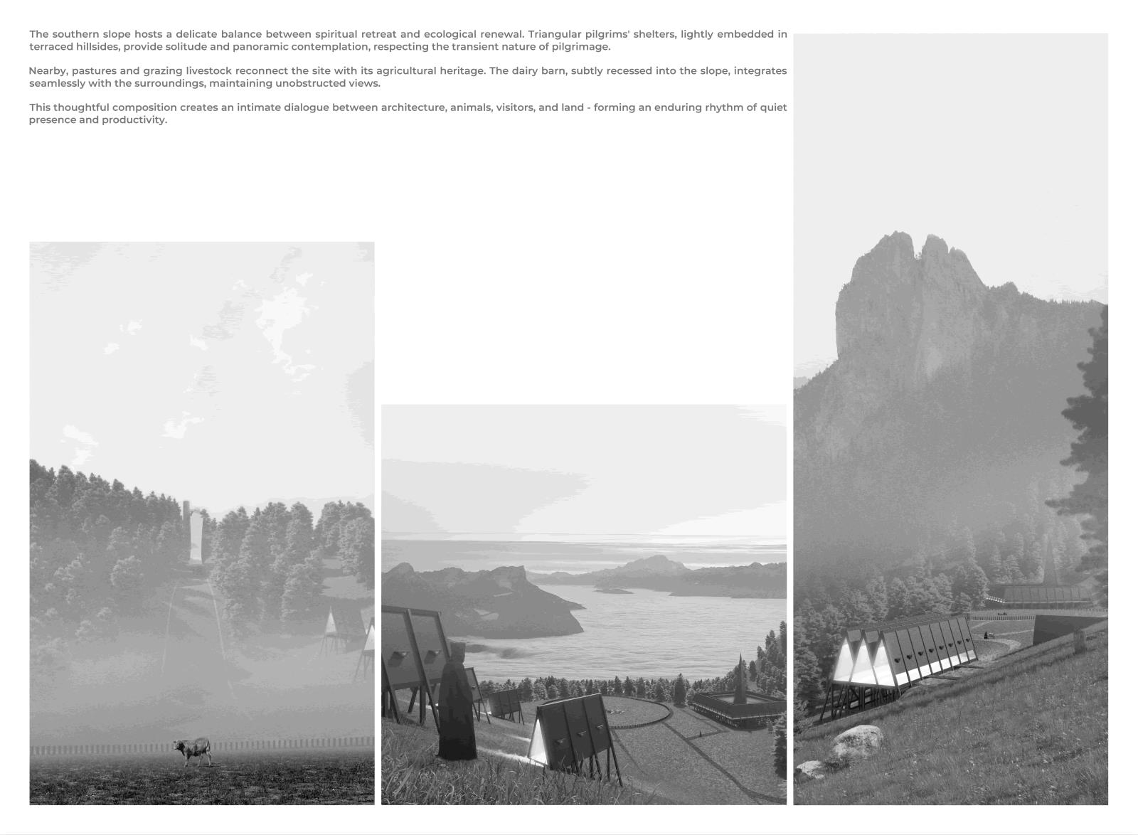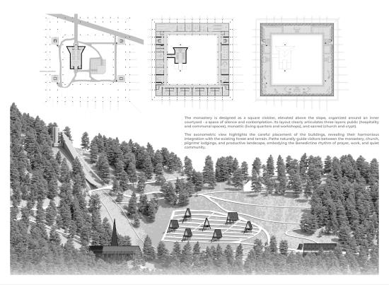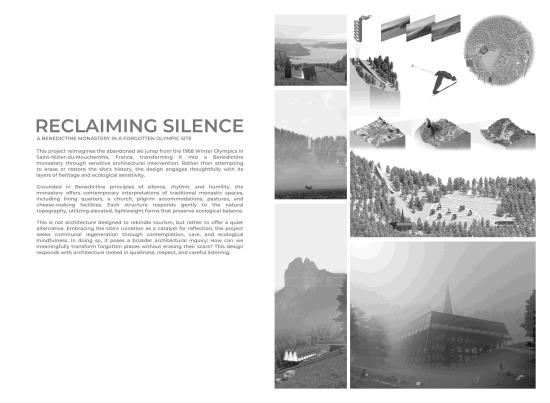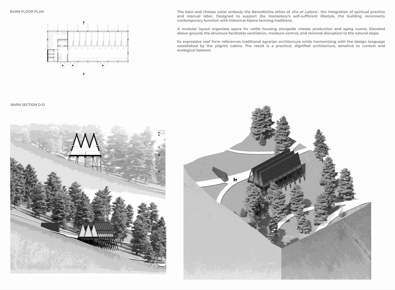 Rather than restoring or commercializing the site, the proposal transforms it through the lens of Benedictine monastic values - silence, rhythm, subsistence, and respect for nature. A new timber ensemble is introduced, comprising a church, cloister, pilgrims’ dwellings, workshops, barn, and cheese-aging rooms. The ski jump itself is retained and reinterpreted as a vertical promenade for solitude and reflection.
