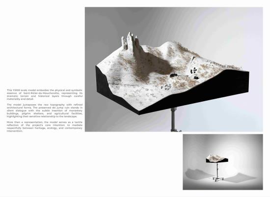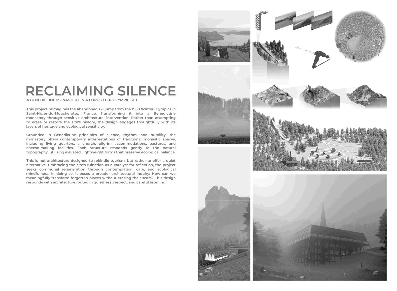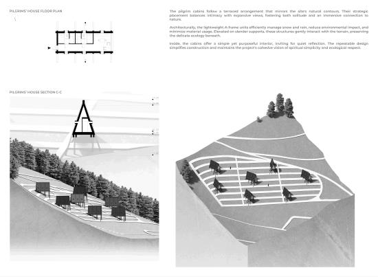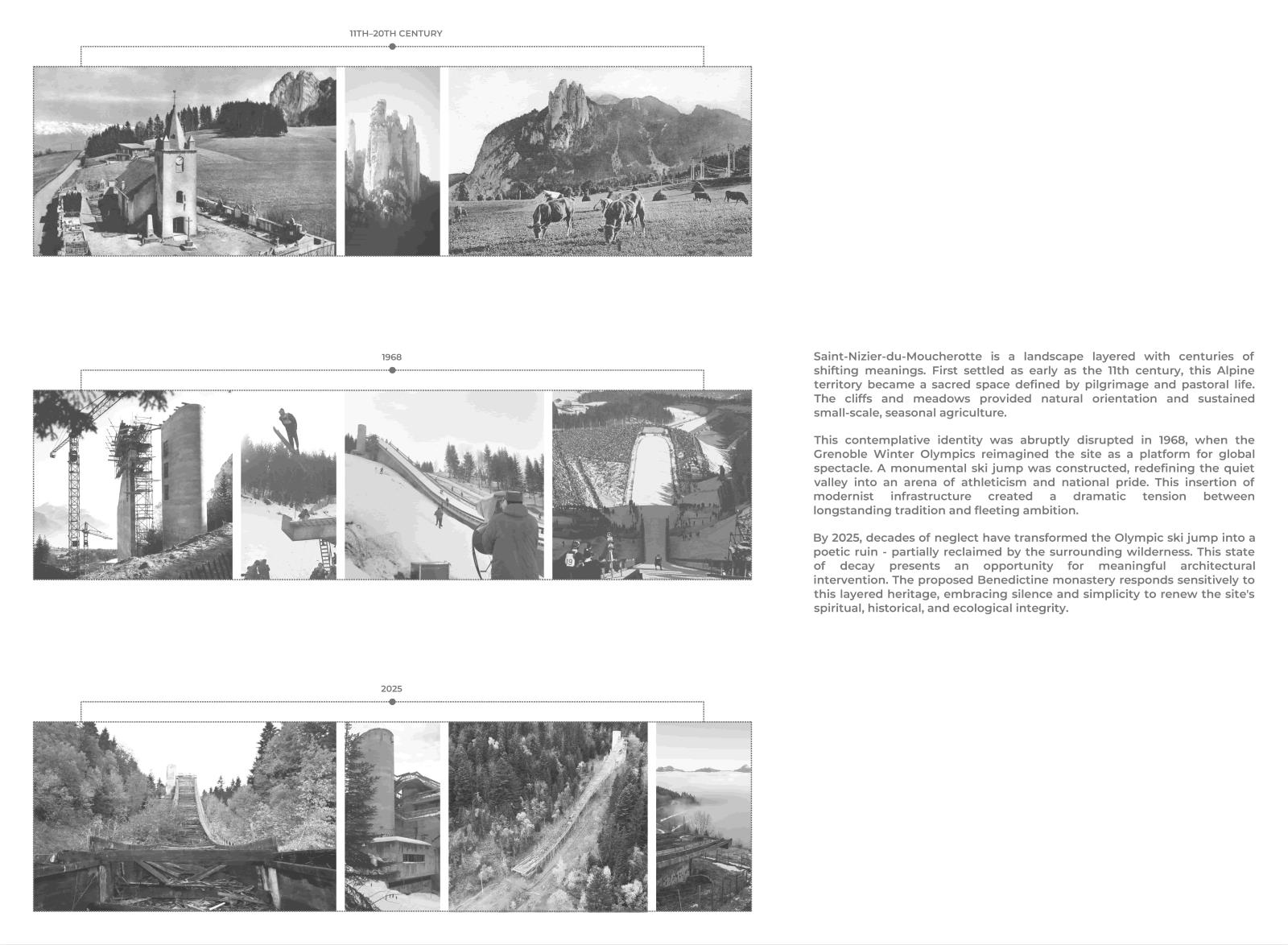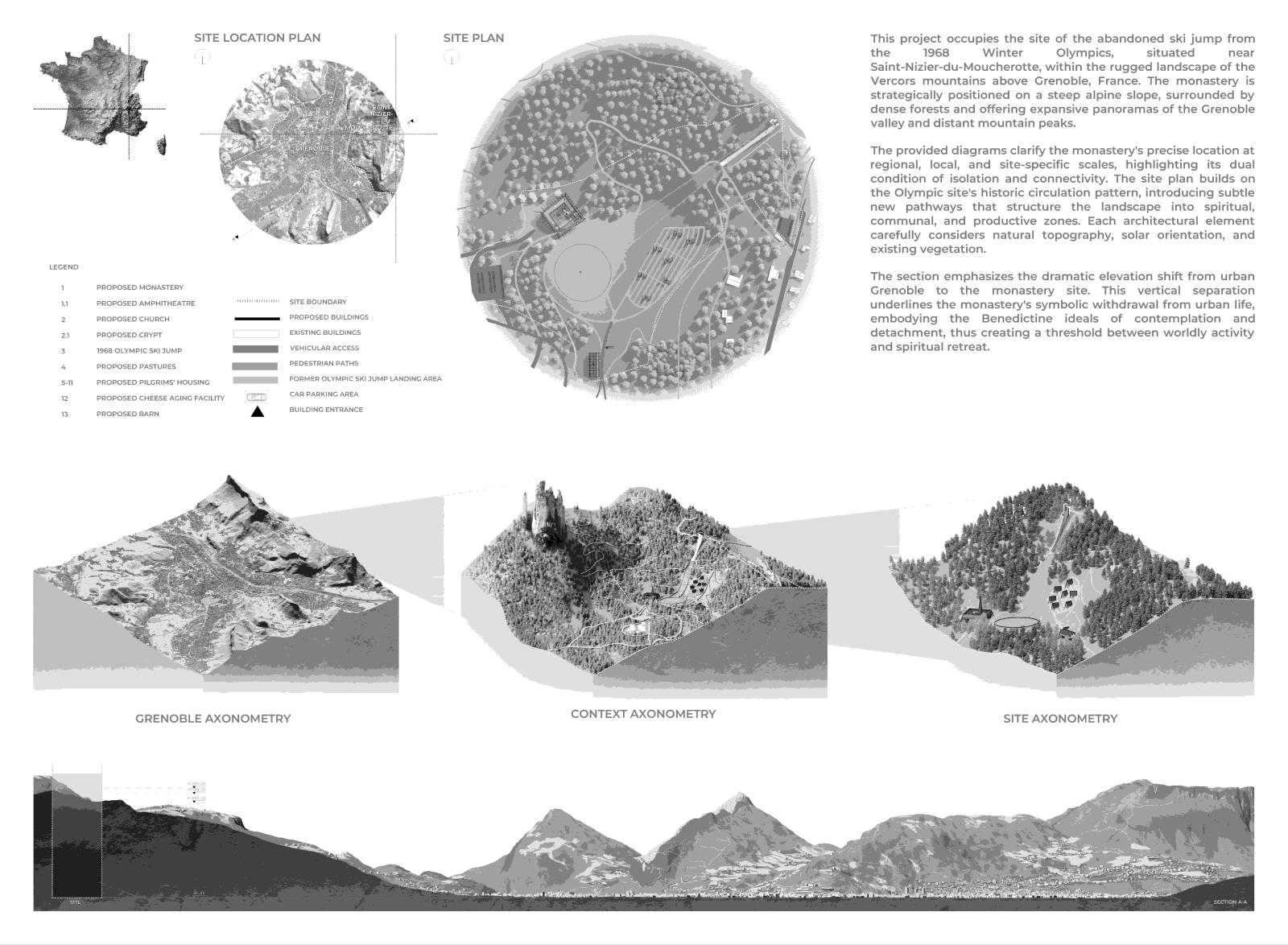 Rather than restoring or commercializing the site, the proposal transforms it through the lens of Benedictine monastic values - silence, rhythm, subsistence, and respect for nature. A new timber ensemble is introduced, comprising a church, cloister, pilgrims’ dwellings, workshops, barn, and cheese-aging rooms. The ski jump itself is retained and reinterpreted as a vertical promenade for solitude and reflection.