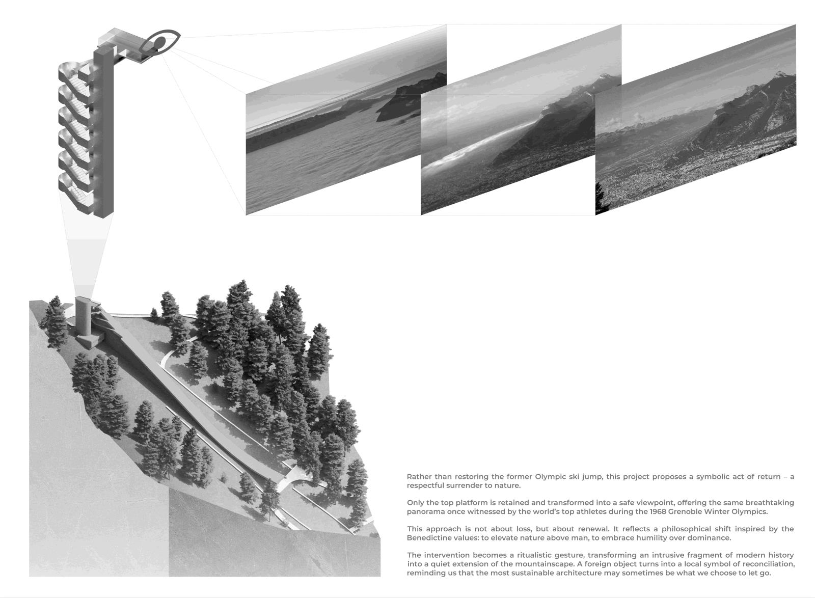 This project reimagines a disused Olympic ski jump in Saint-Nizier-du-Moucherotte, France, as a contemplative and regenerative architectural landscape.