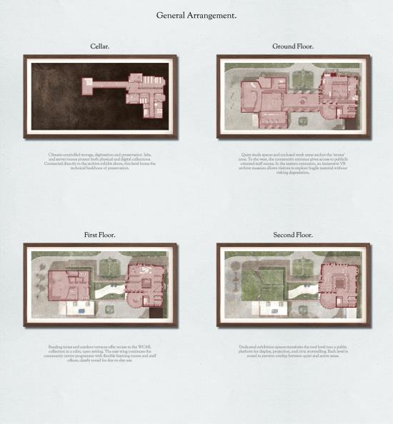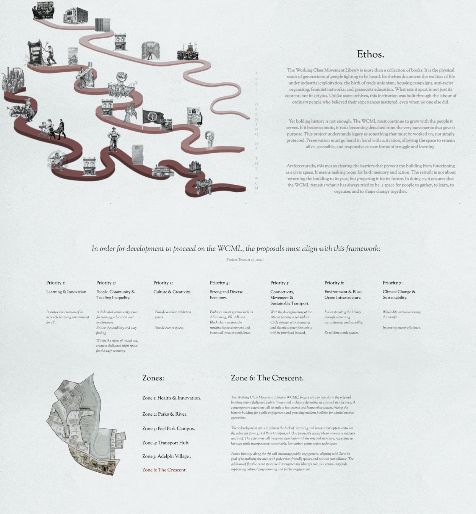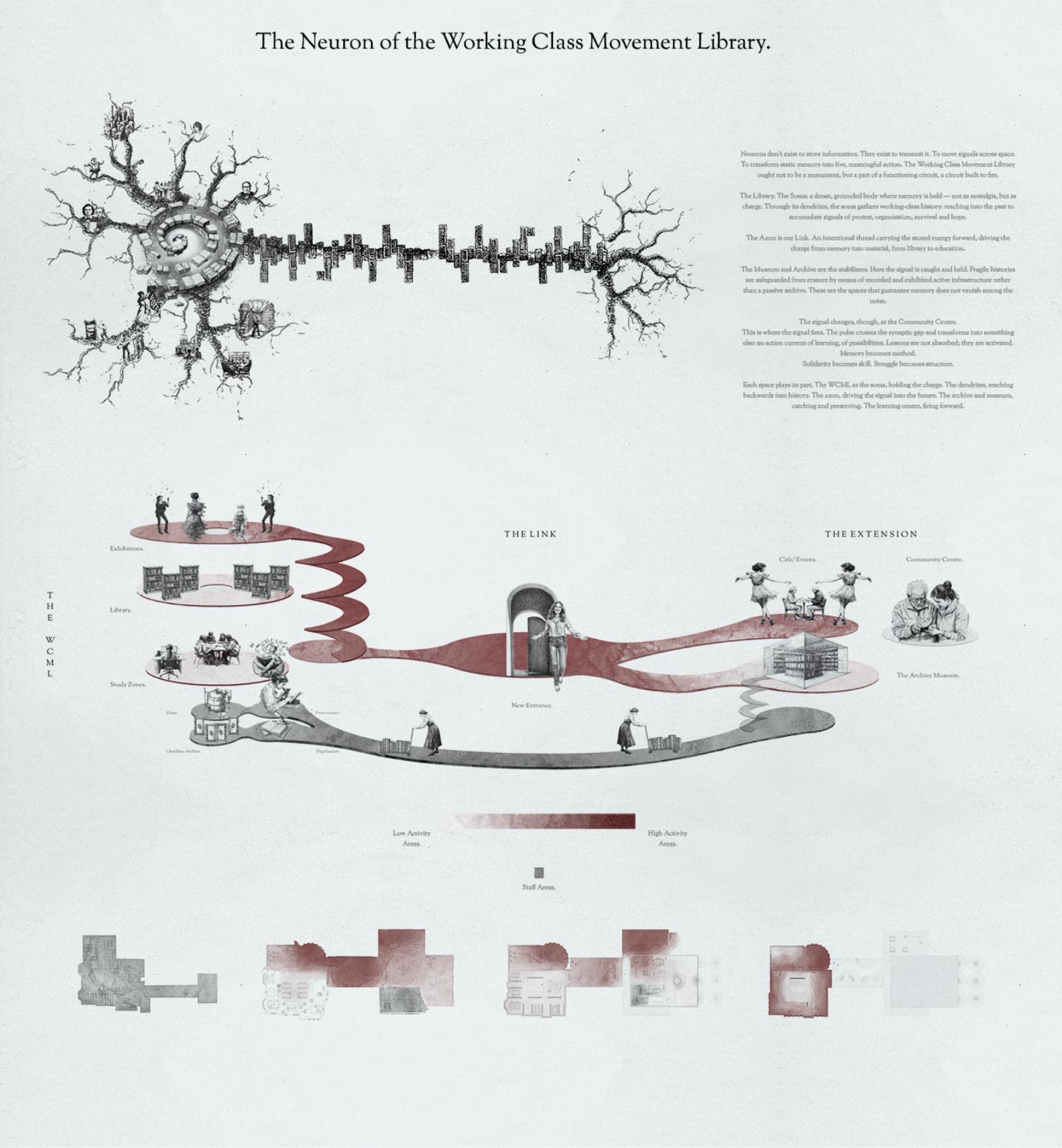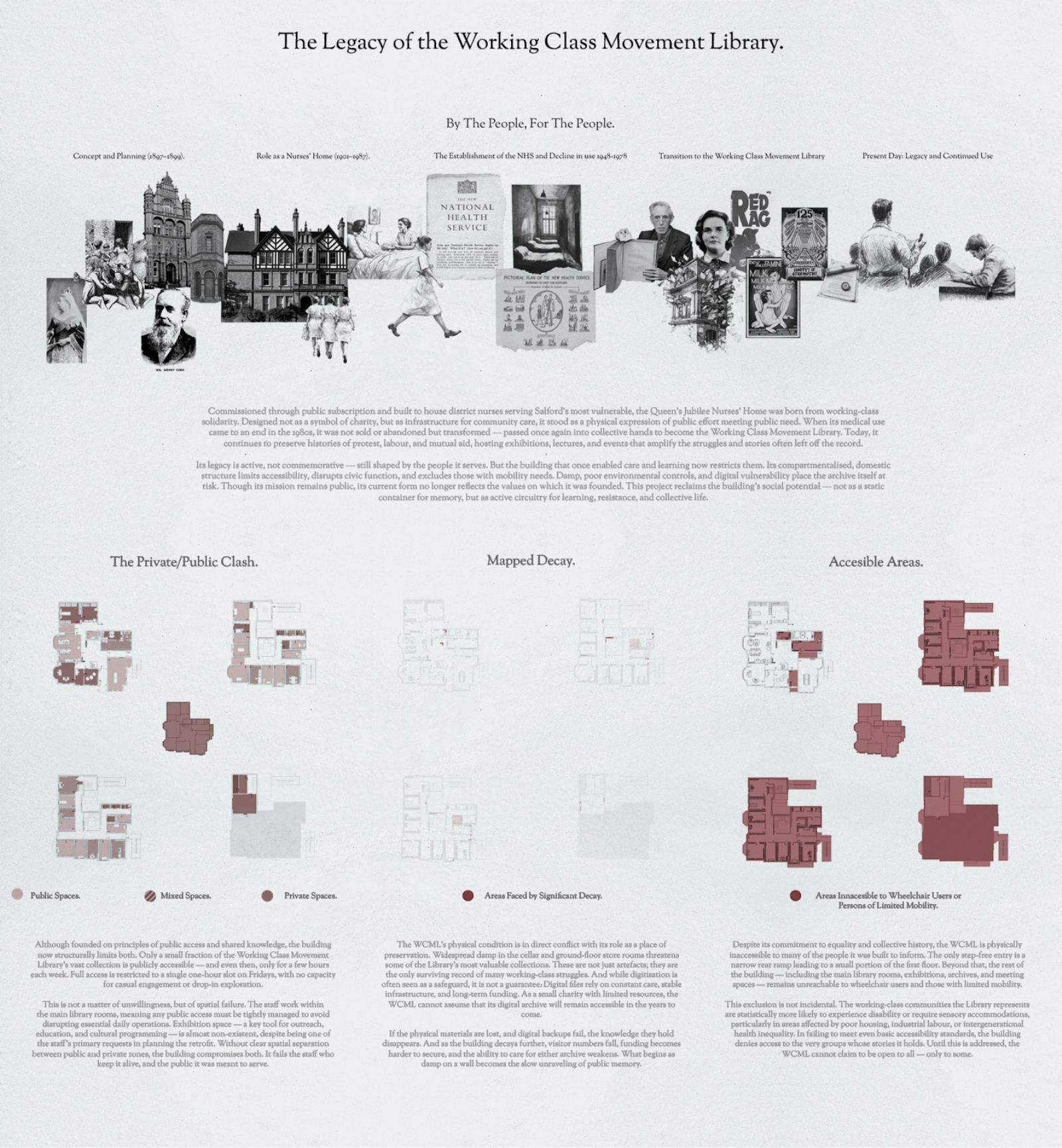 This project reimagines the Working Class Movement Library not as a static archive, but as a living part of civic infrastructure — a building designed to activate memory, not just preserve it. Set in Salford, the proposal addresses the tension between heritage and usability, where poor access, environmental decay, and outdated spatial logic risk undermining the Library’s public mission.