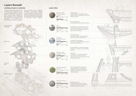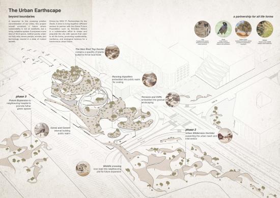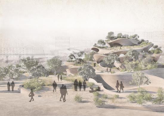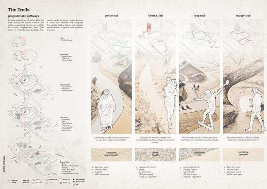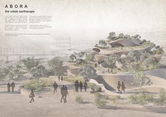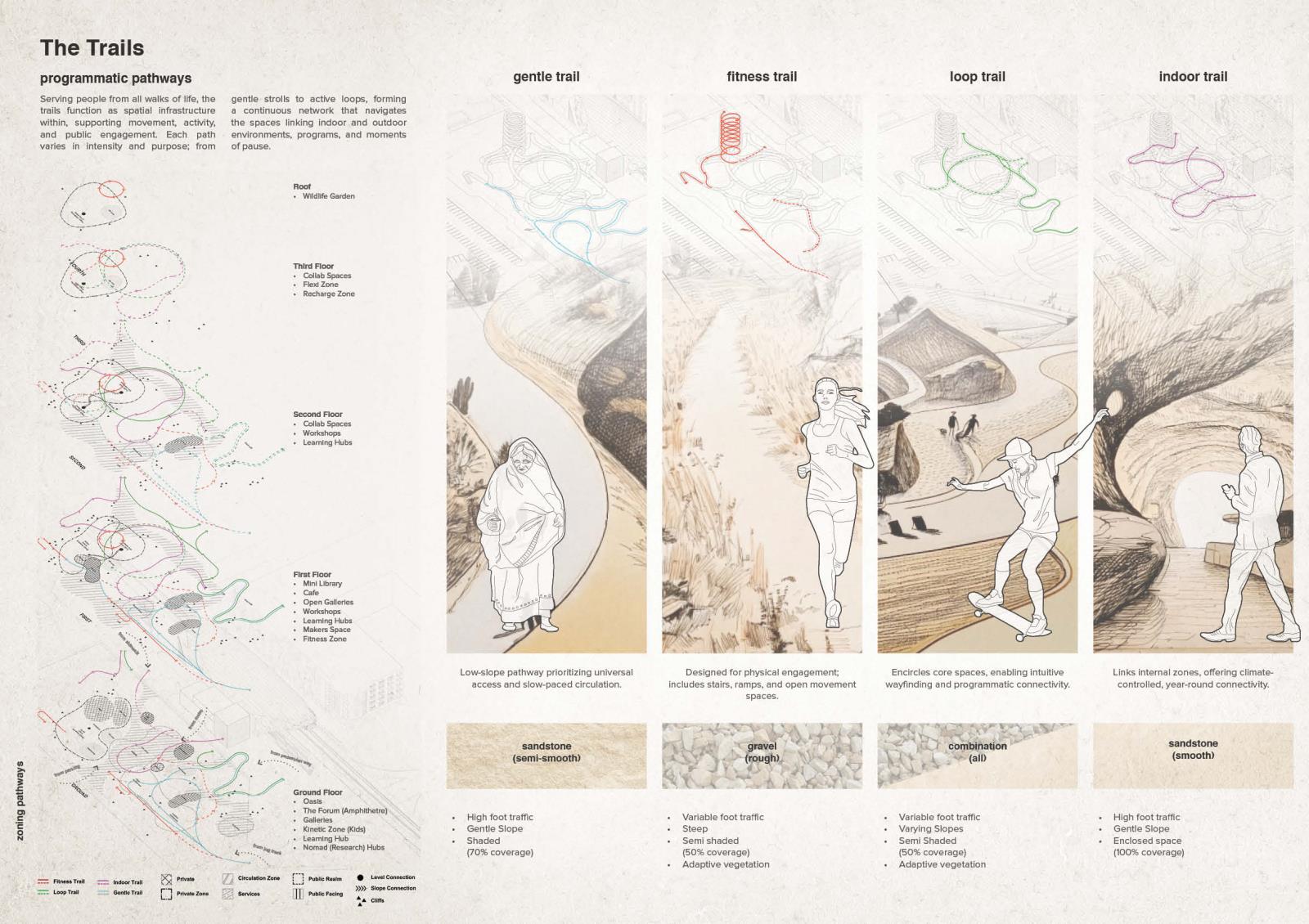 Through an assemblage of trails, thresholds, and adaptive structures, the proposal reimagines the public realm as an earthscape, a space shaped by the temporal rhythms of soil, sediment, and settlement. The architectural language resists object- centric monumentality and instead privileges porous forms, exposed construction, and layered material assemblies that evoke both permanence and transience. At its heart lies an oasis, a terrain of encounter where informal socialities, ecological systems, and speculative futures interweave.