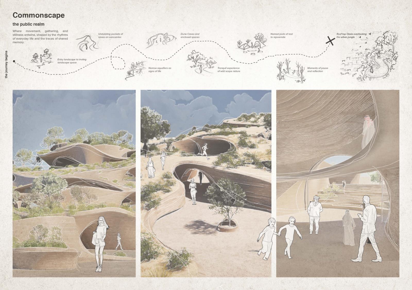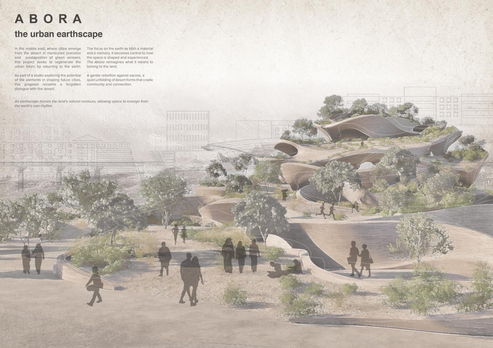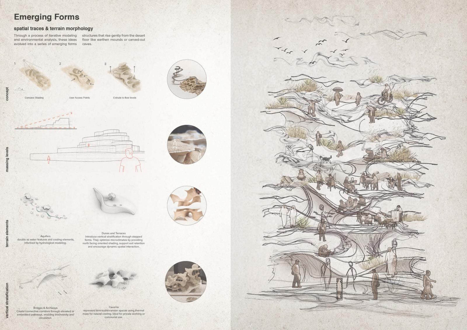 In a time when the terrain has been flattened beneath the weight of rapid development, this project reimagines the ground as an active and generative layer of the city. Situated in Oud Metha, Dubai a city known for its polished aesthetic, the proposal explores how reintroducing natural formations into the built environment can support emerging forms of public life, knowledge exchange, and ecological awareness.