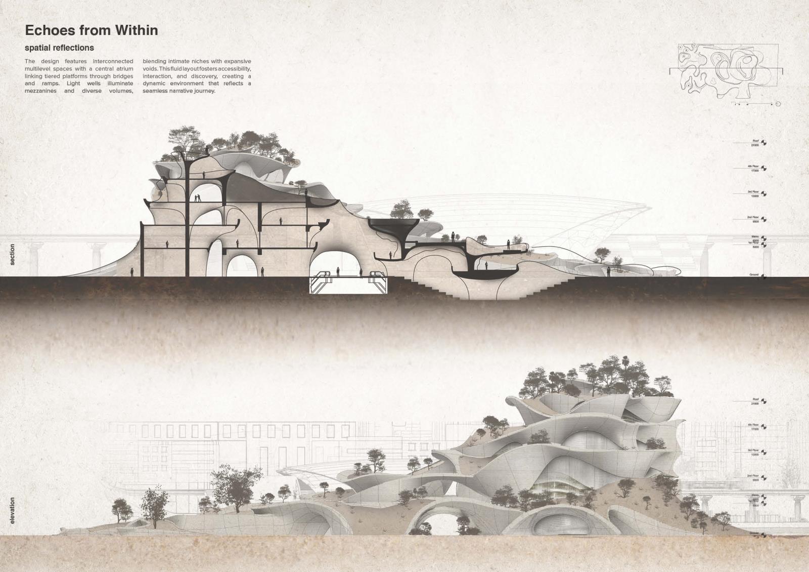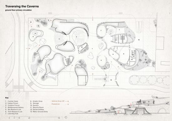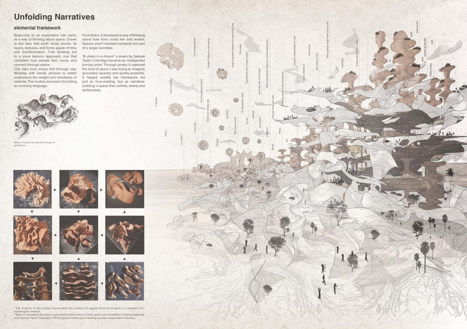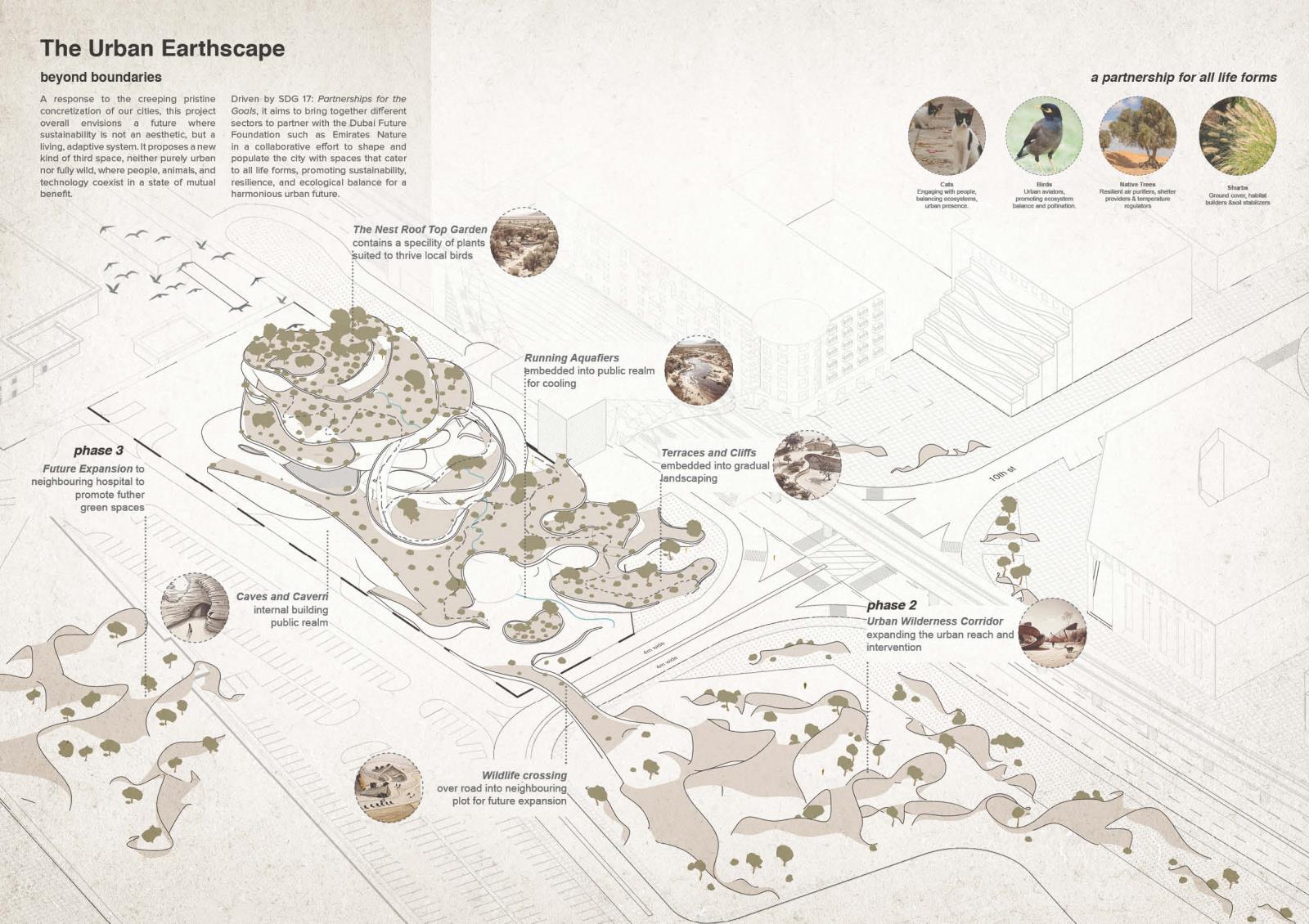 In a time when the terrain has been flattened beneath the weight of rapid development, this project reimagines the ground as an active and generative layer of the city. Situated in Oud Metha, Dubai a city known for its polished aesthetic, the proposal explores how reintroducing natural formations into the built environment can support emerging forms of public life, knowledge exchange, and ecological awareness.