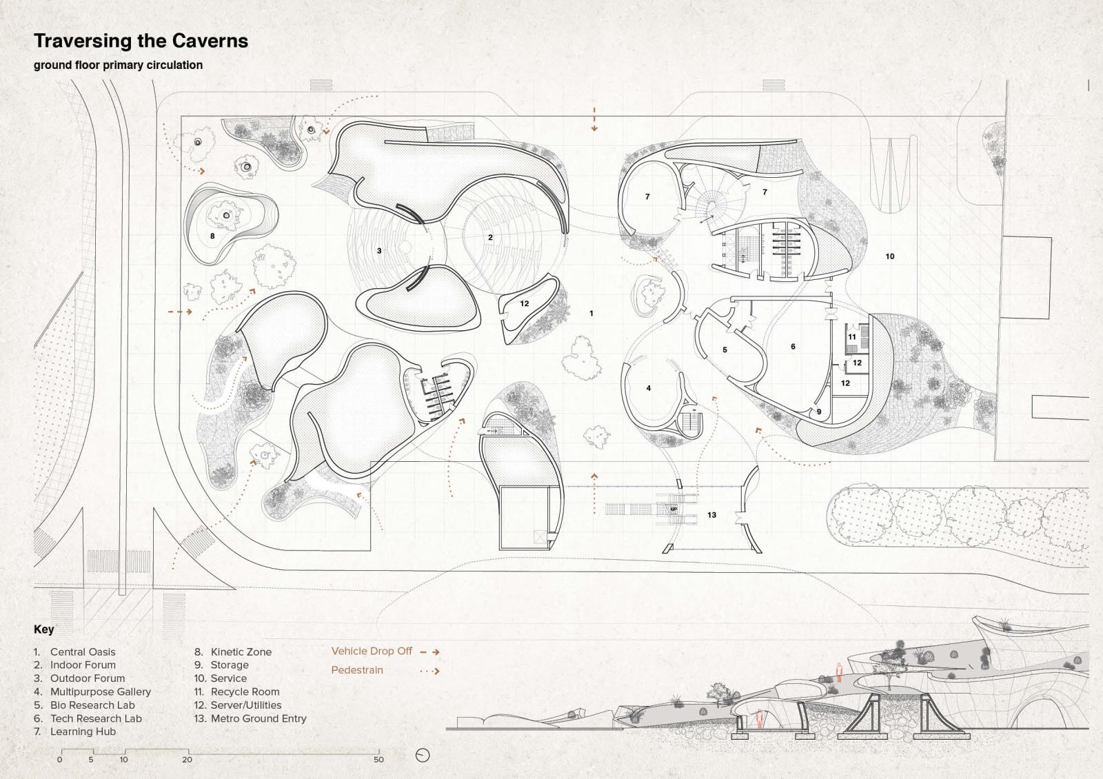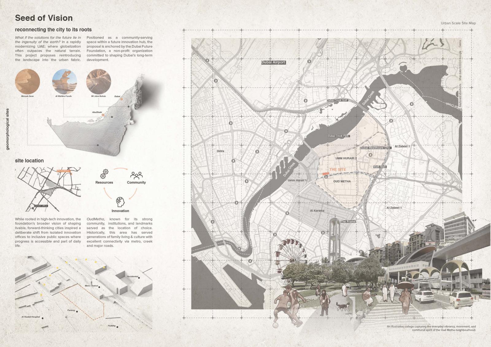 Developed in partnership with the Dubai Future Foundation as a proposed client, the scheme operates as a living testbed for community-grounded innovation. It is a site where past wisdom and future vision converge, not in opposition but in continuity. The project challenges conventional models of progress by rooting transformation in the overlooked logic of the ground beneath us.