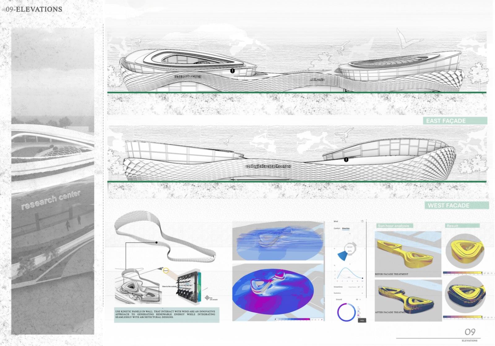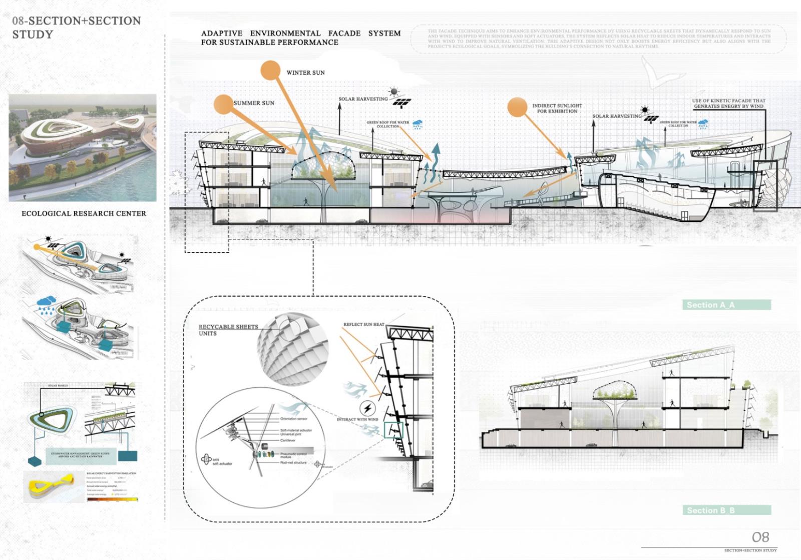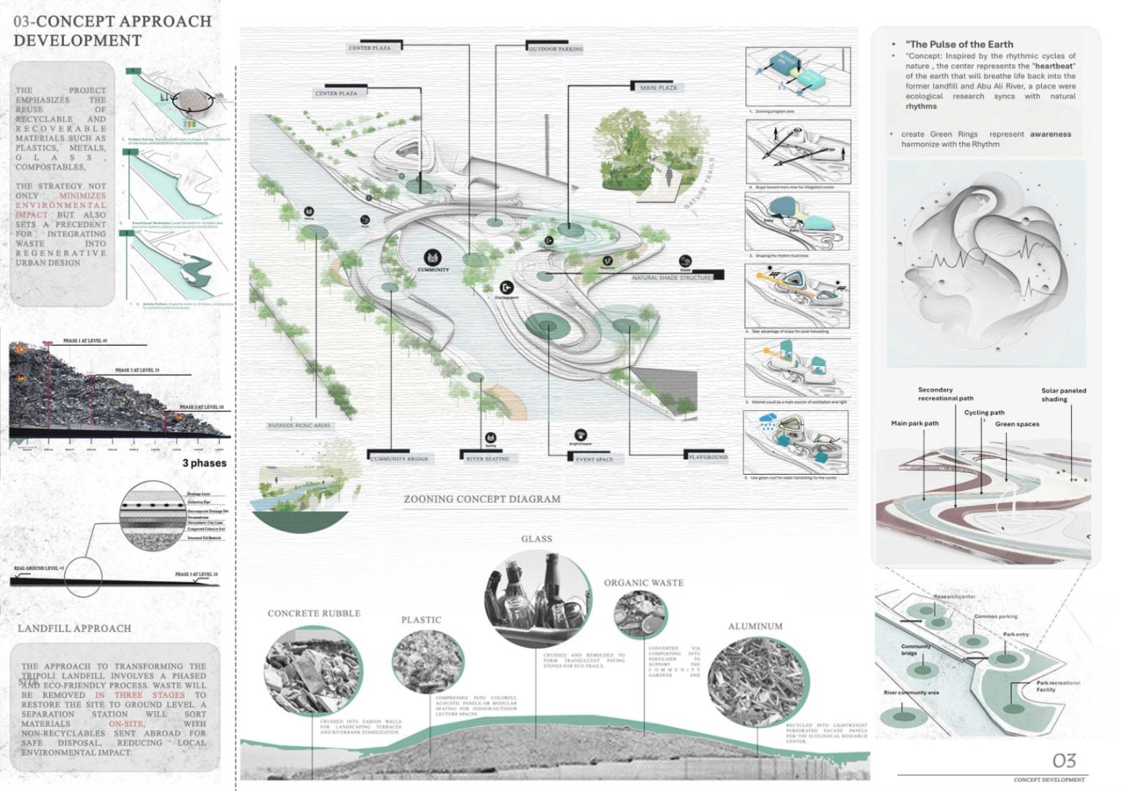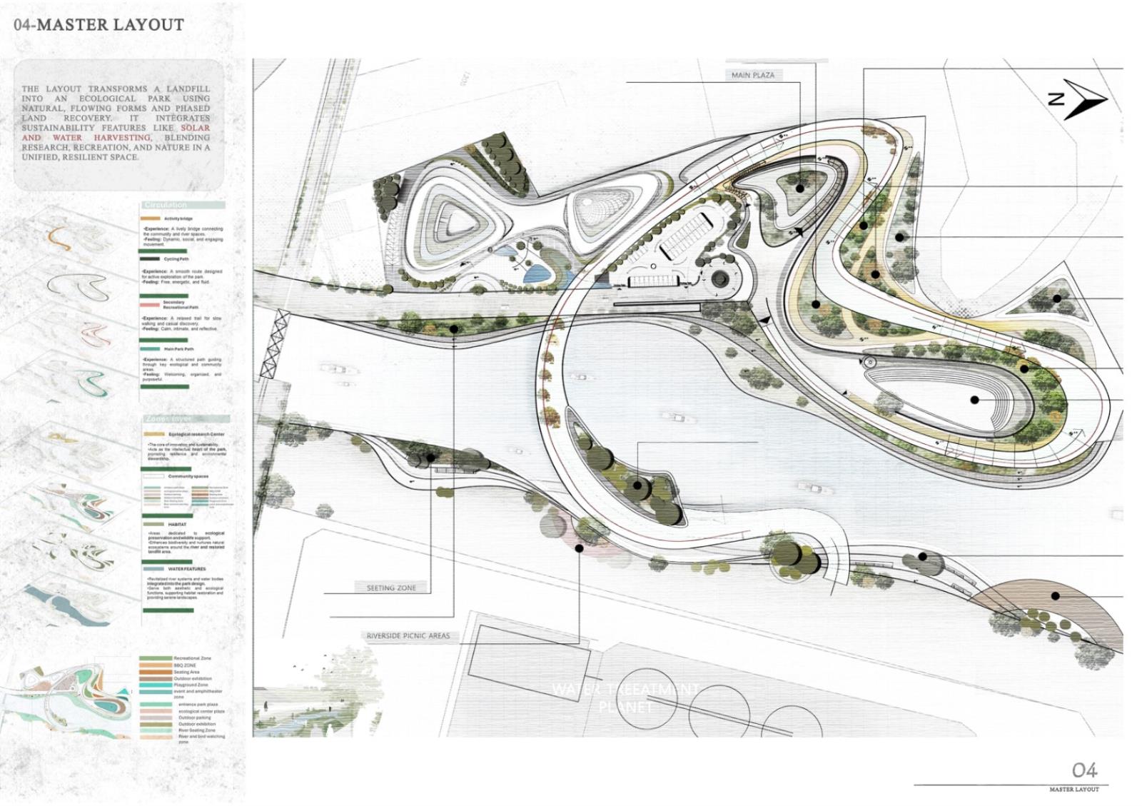 The design centers on the concept of nature’s rhythm—the “pulse of the earth”—with fluid, organic forms symbolizing renewal and continuity. The project unfolds in phases: removing and processing waste, restoring the site, and building a vibrant public park intertwined with a state-of-the-art Ecological Research and Education Center. This facility houses advanced laboratories, greenhouses, and public learning zones dedicated to water quality, biodiversity, and sustainable engineering.