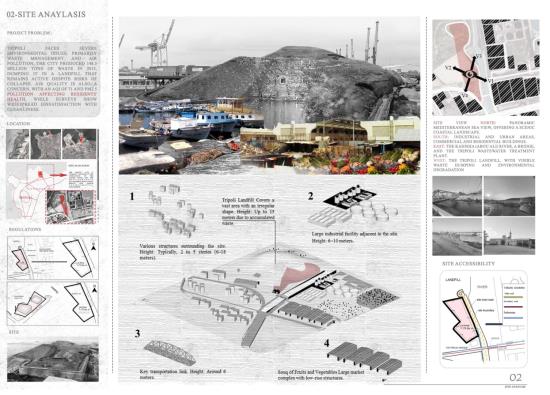 'Reclaiming the Past, Building the Future' is a visionary project that transforms Tripoli’s toxic landfill into a thriving ecological park and research hub. Located at the confluence of the Kadisha River and the Mediterranean Sea, the Tripoli Ecological Hub addresses one of Lebanon’s most pressing environmental challenges: waste pollution. By integrating sustainable design, community spaces, and scientific innovation, the project proposes a comprehensive strategy for ecological restoration and urban resilience.