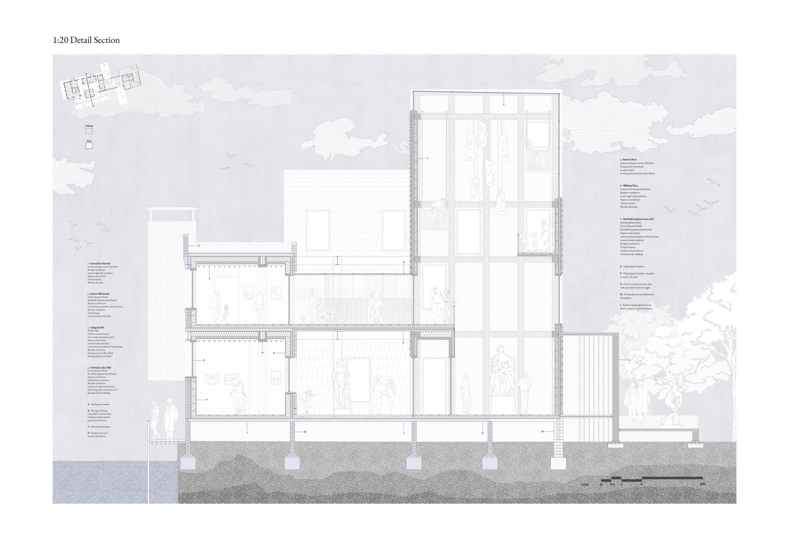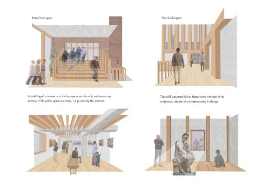 The central exterior ‘heartspace’ of the building opens the existing skin and structure to be viewed more closely, celebrating its robust quality. Inside, the curation of views onto and around the artwork fosters an enhanced appreciation for creativity. The structure is concealed, and it is unclear what is existing and what is new - questioning the authenticity of the building, just like the artwork within it.