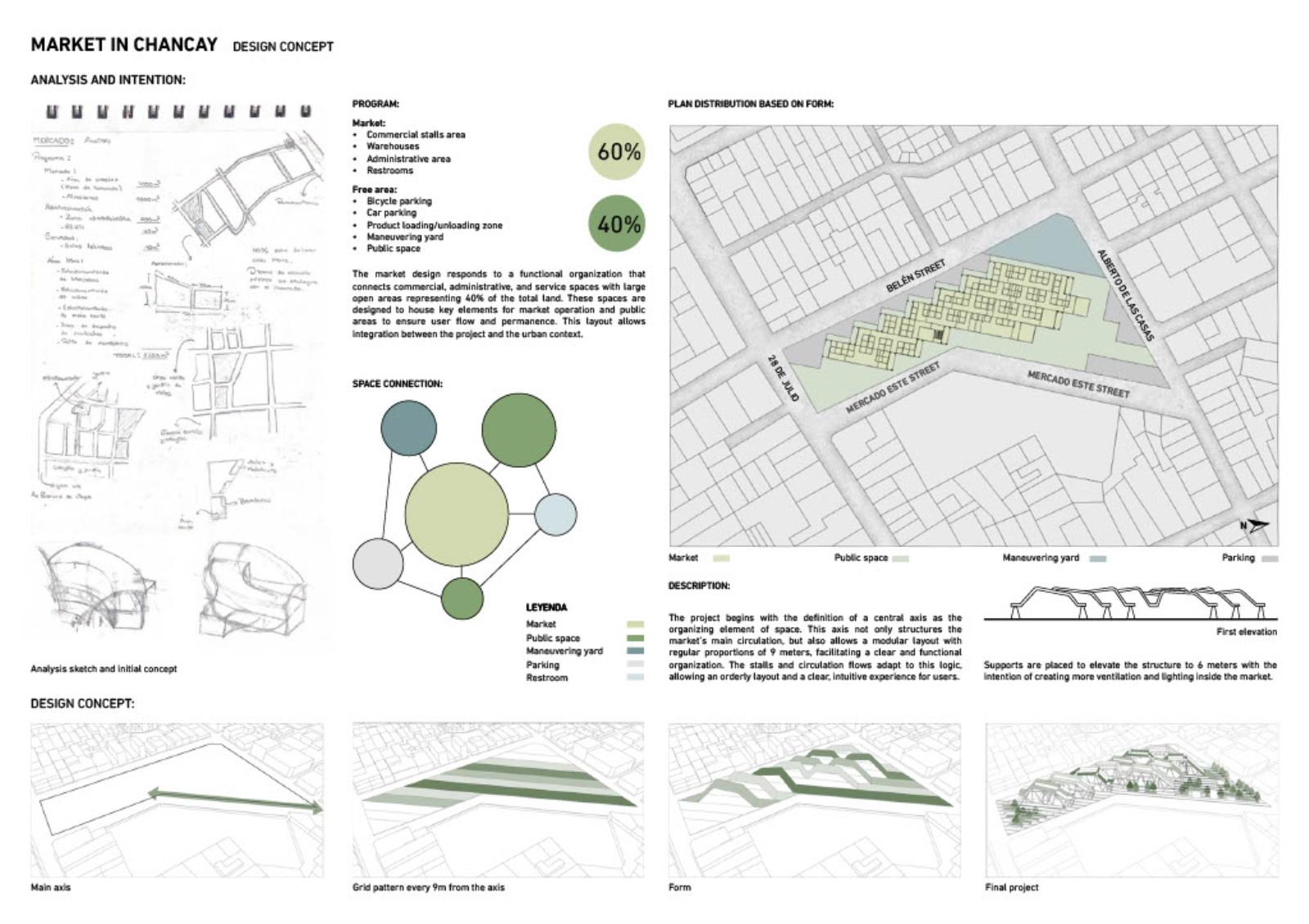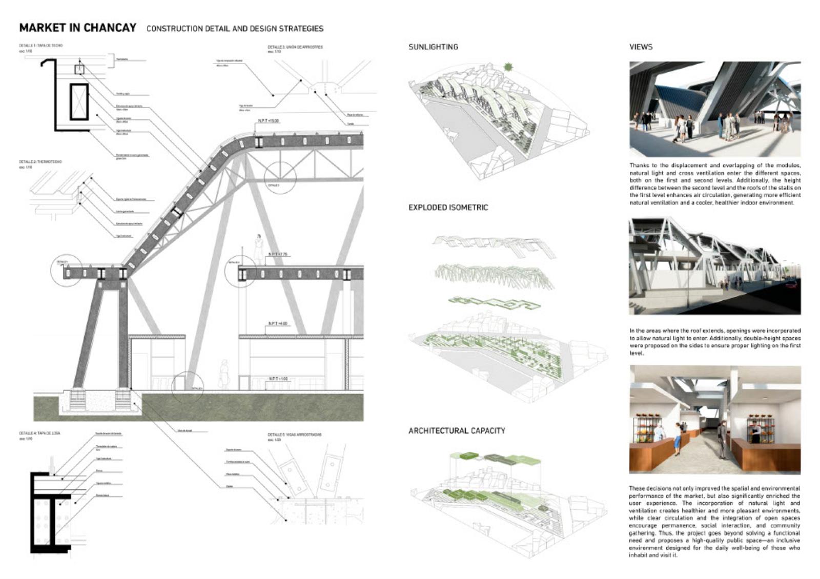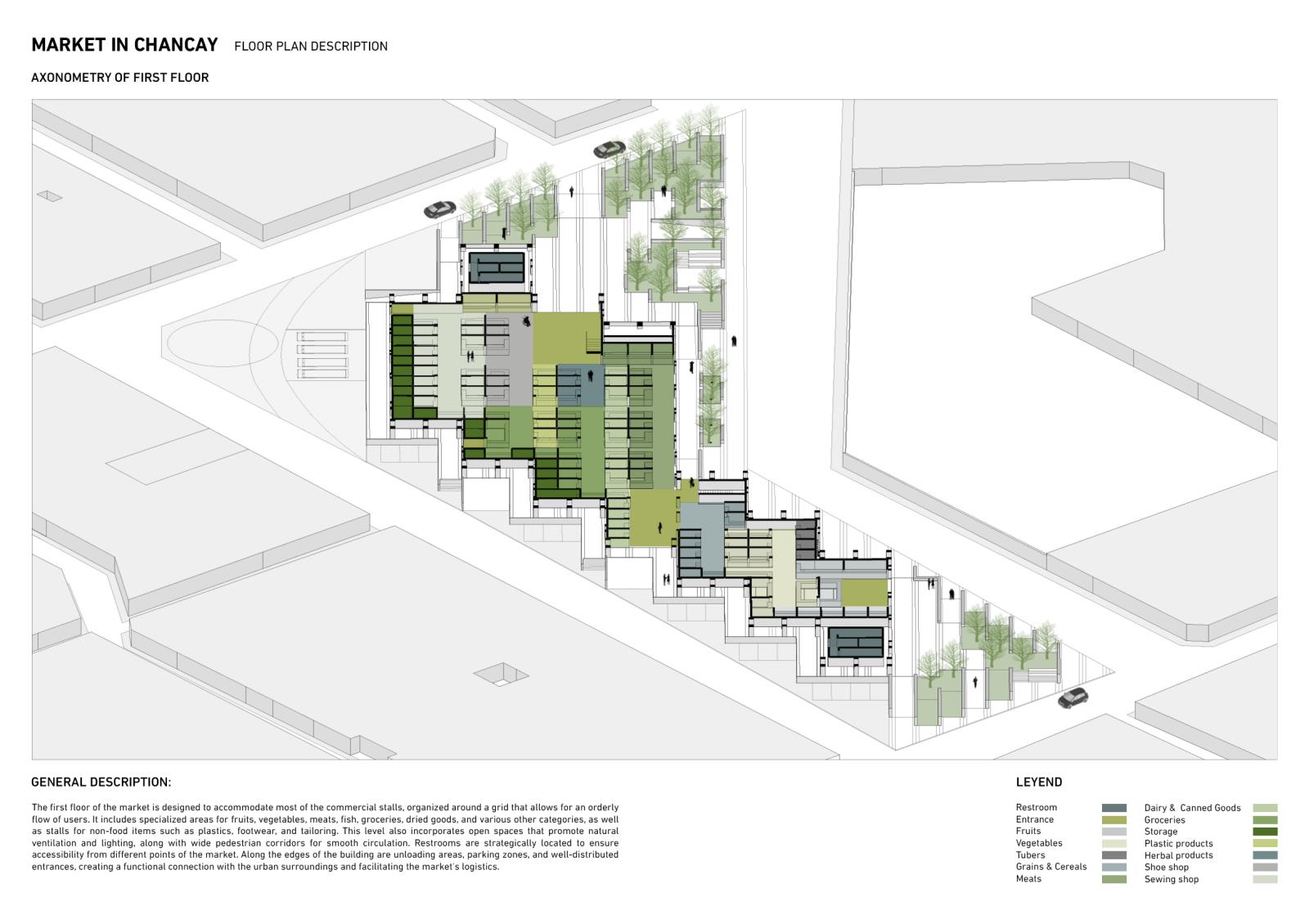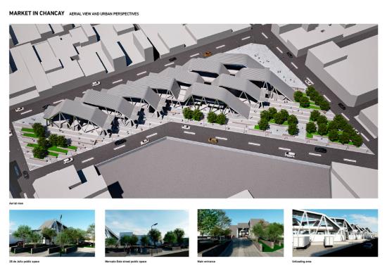 This project proposes the design of a new market in Chancay, Peru, as a response to the urban and social impacts triggered by the construction of the megaport. The proposal aims to restore the market's role as a public space, integrating meeting areas, green zones, and a functional structure that addresses local commercial dynamics. Organised through a central axis and a modular grid, the programme is distributed in volumes with cross ventilation and clear access points, maintaining 40% of the site as open space. An exposed steel structure allows for spaciousness, flexibility, and a contemporary architectural expression. The result is an intervention that goes beyond commercial needs, engaging with the city’s transformation and strengthening urban identity and community connections.