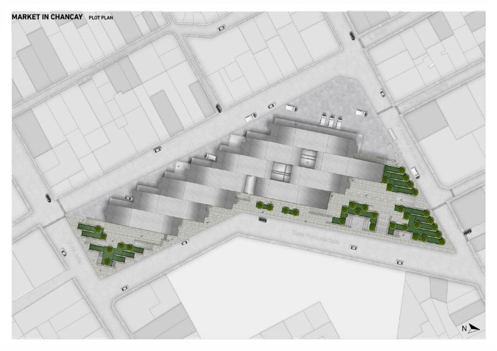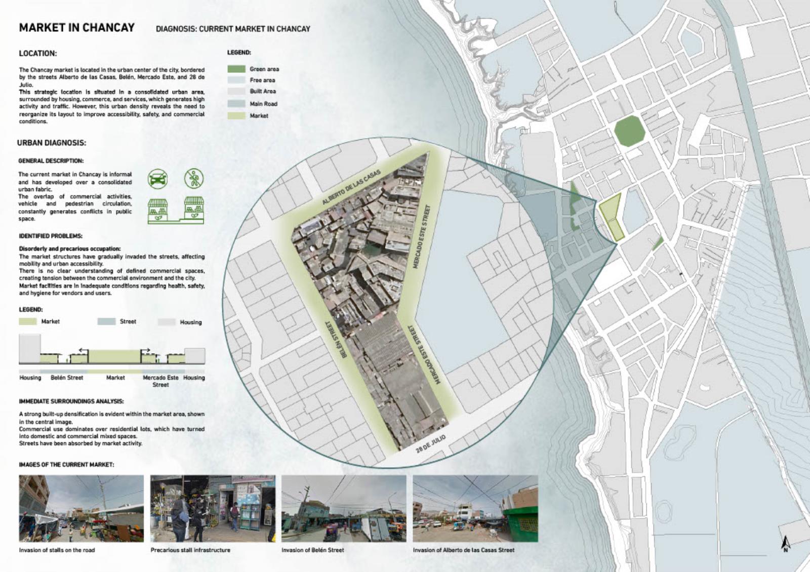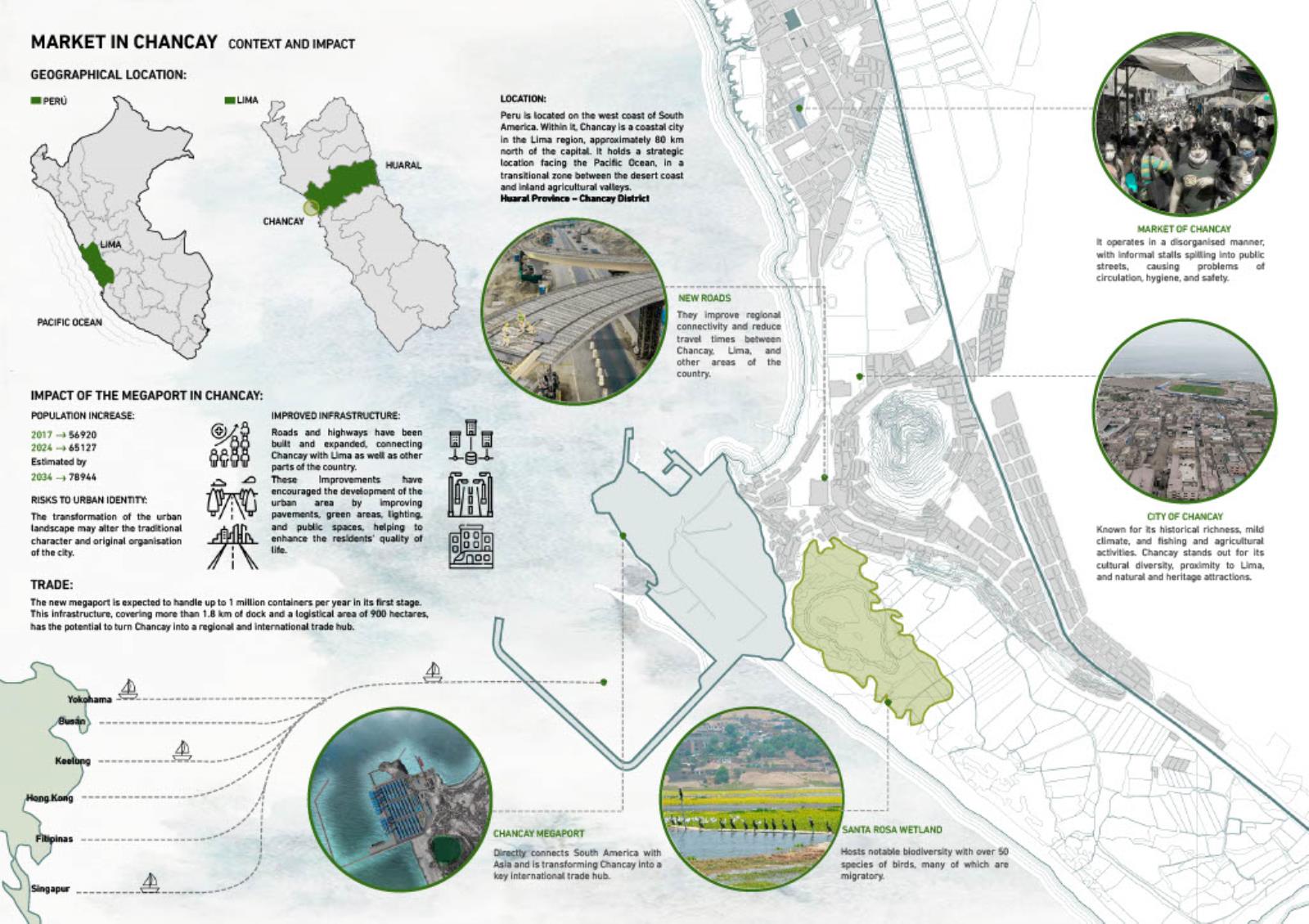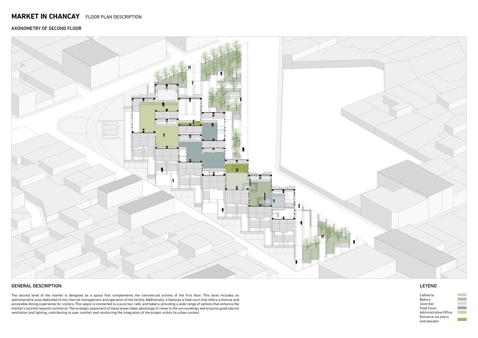 This project proposes the design of a new market in Chancay, Peru, as a response to the urban and social impacts triggered by the construction of the megaport. The proposal aims to restore the market's role as a public space, integrating meeting areas, green zones, and a functional structure that addresses local commercial dynamics. Organised through a central axis and a modular grid, the programme is distributed in volumes with cross ventilation and clear access points, maintaining 40% of the site as open space. An exposed steel structure allows for spaciousness, flexibility, and a contemporary architectural expression. The result is an intervention that goes beyond commercial needs, engaging with the city’s transformation and strengthening urban identity and community connections.