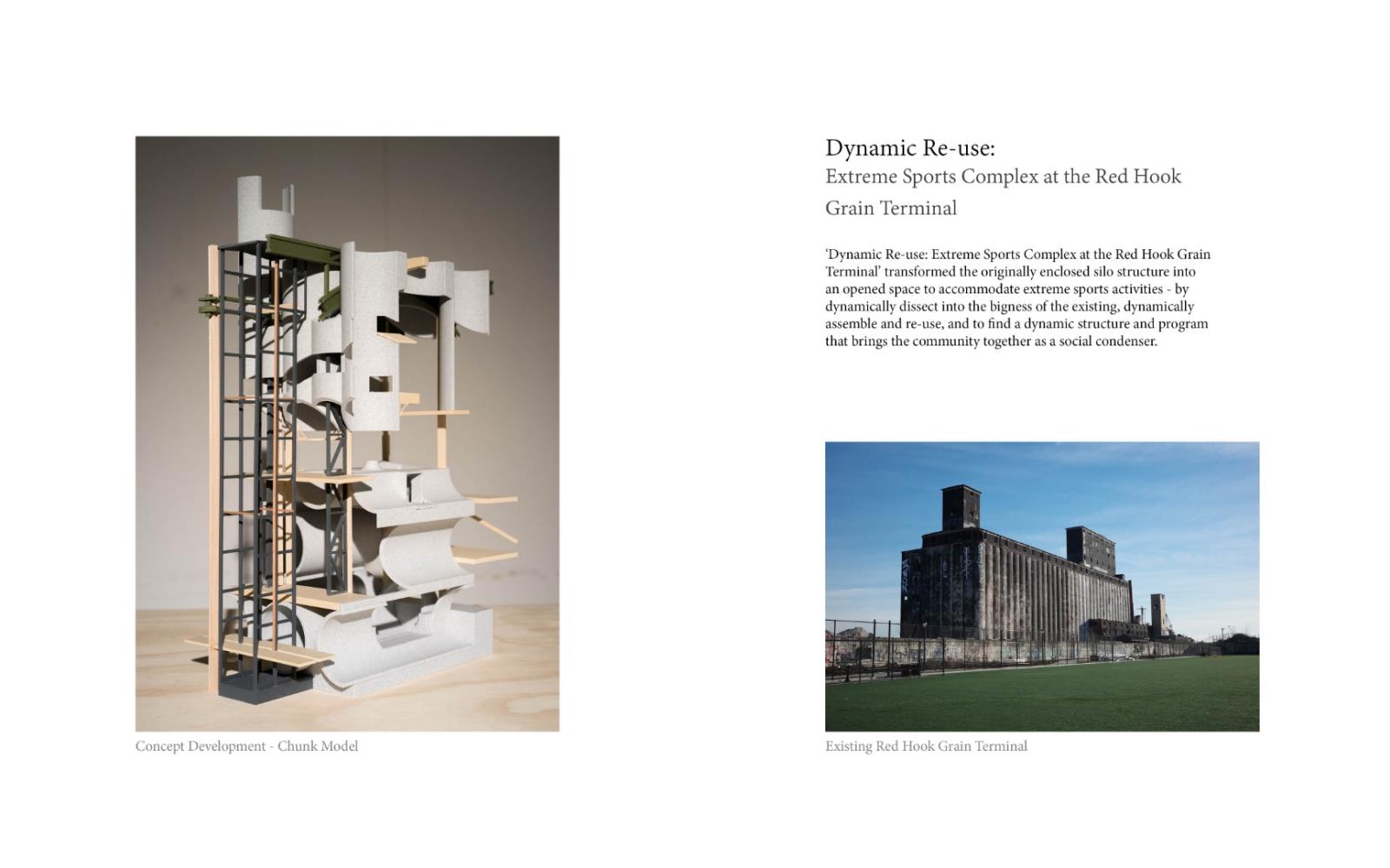 'Dynamic Re-use: Extreme Sports Complex at the Red Hook Grain Terminal' transformed the originally enclosed silo structure into an opened space to accommodate extreme sports activities - by dynamically dissect into the bigness of the existing, dynamically assemble and re-use, and to find a dynamic structure and program that brings the community together as a social condenser.