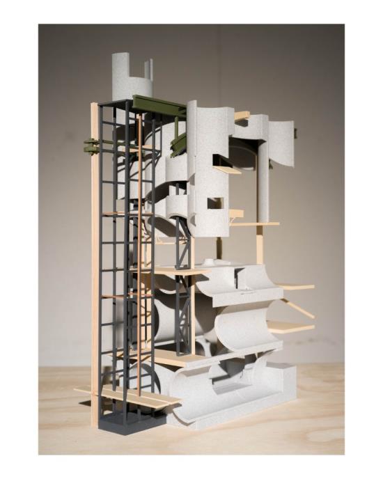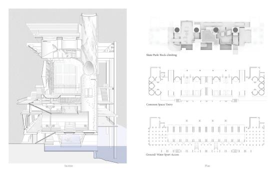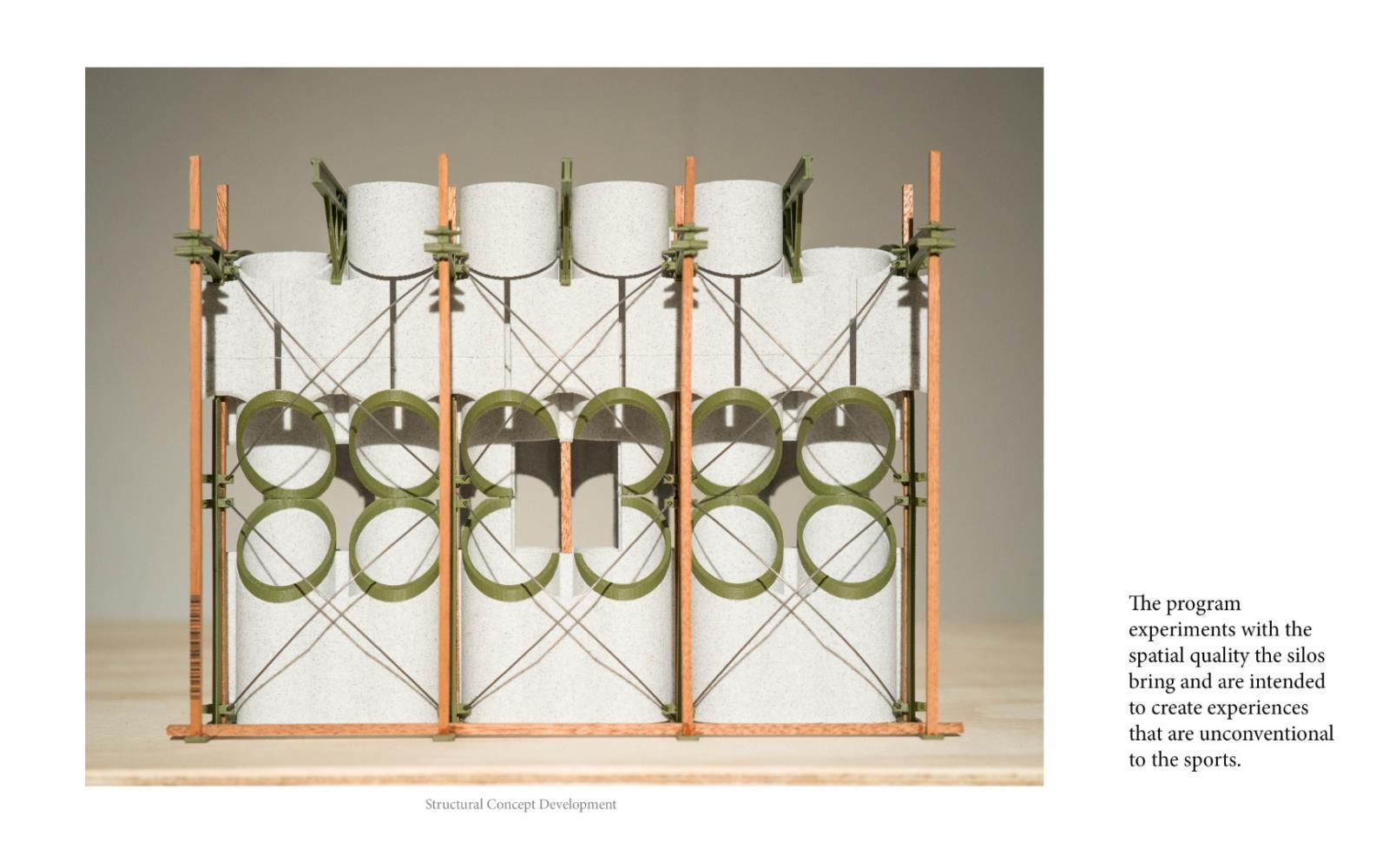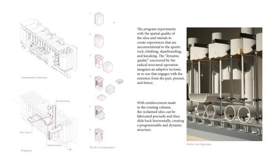 The program experiments with the spatial quality of the silos and intends to create experiences that are unconventional to the sports: rock-climbing, skateboarding, and kayaking. The “dynamic quality” uncovered by the radical structural operation imagines an adaptive tectonic in re-use that engages with the extremes from the past, present, and future.
