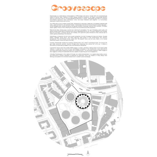 Groovescape is an immersive cultural venue that reinterprets the design, materiality, and social ethos of the 1970s within the industrial shell of the Bethnal Green gas holders in Hackney. As the ABBA Voyage prepares to relocate to Las Vegas, this project proposes a permanent London home for the experience, featuring both a large-scale digital performance theatre and a separate dinner-theatre, offering audiences a fully integrated evening of music, theatre, and dining.