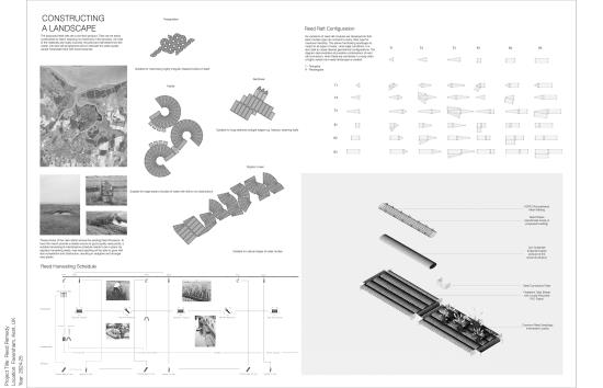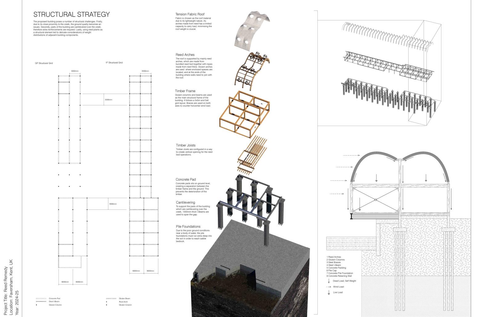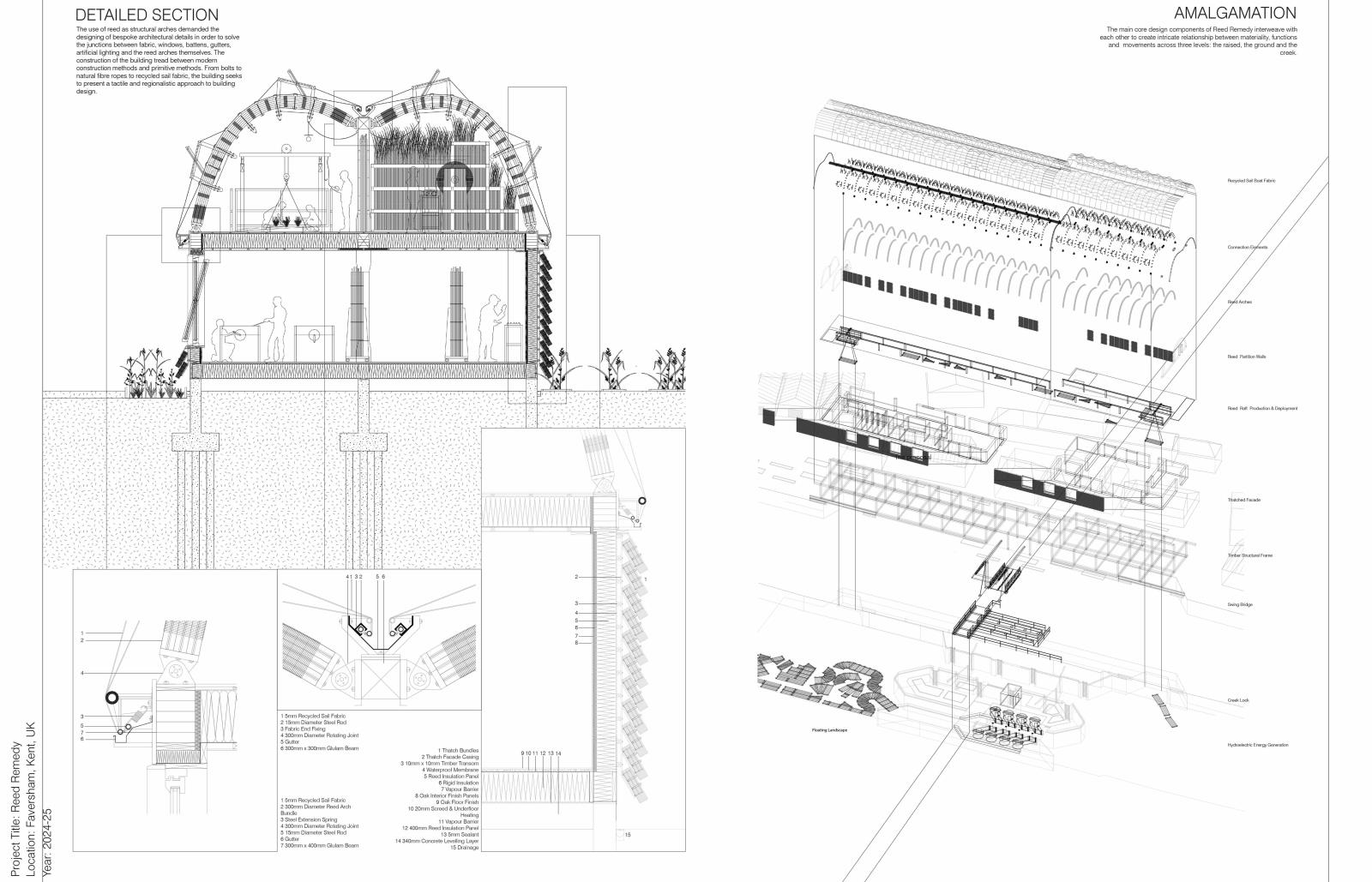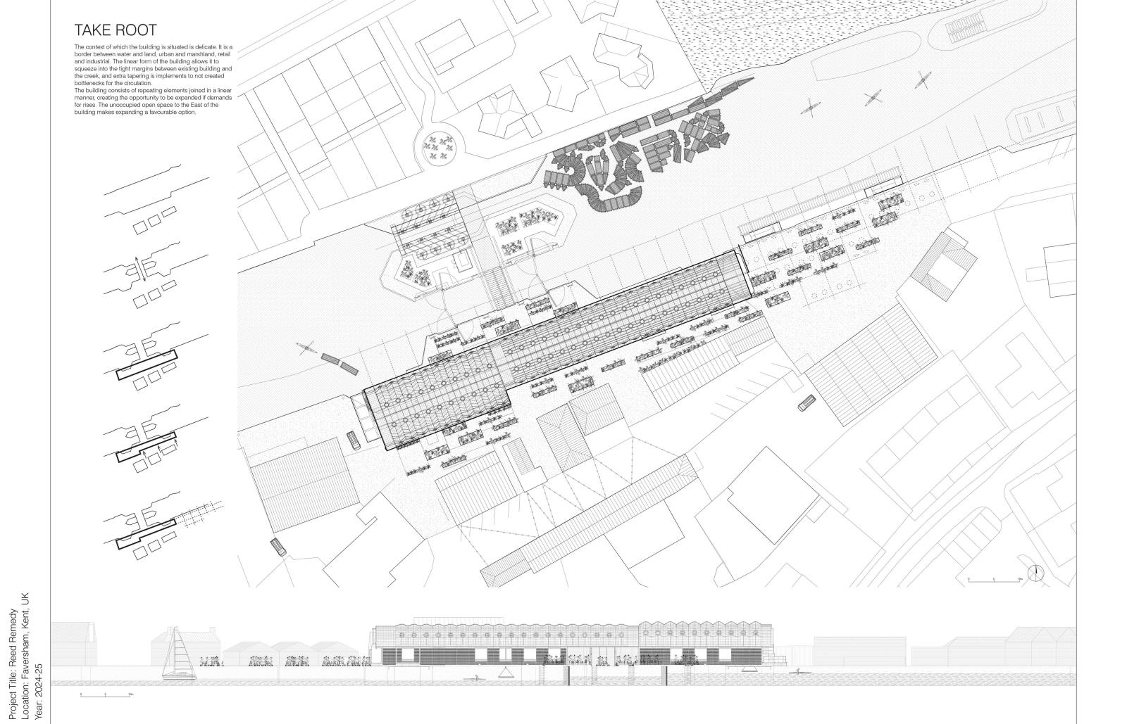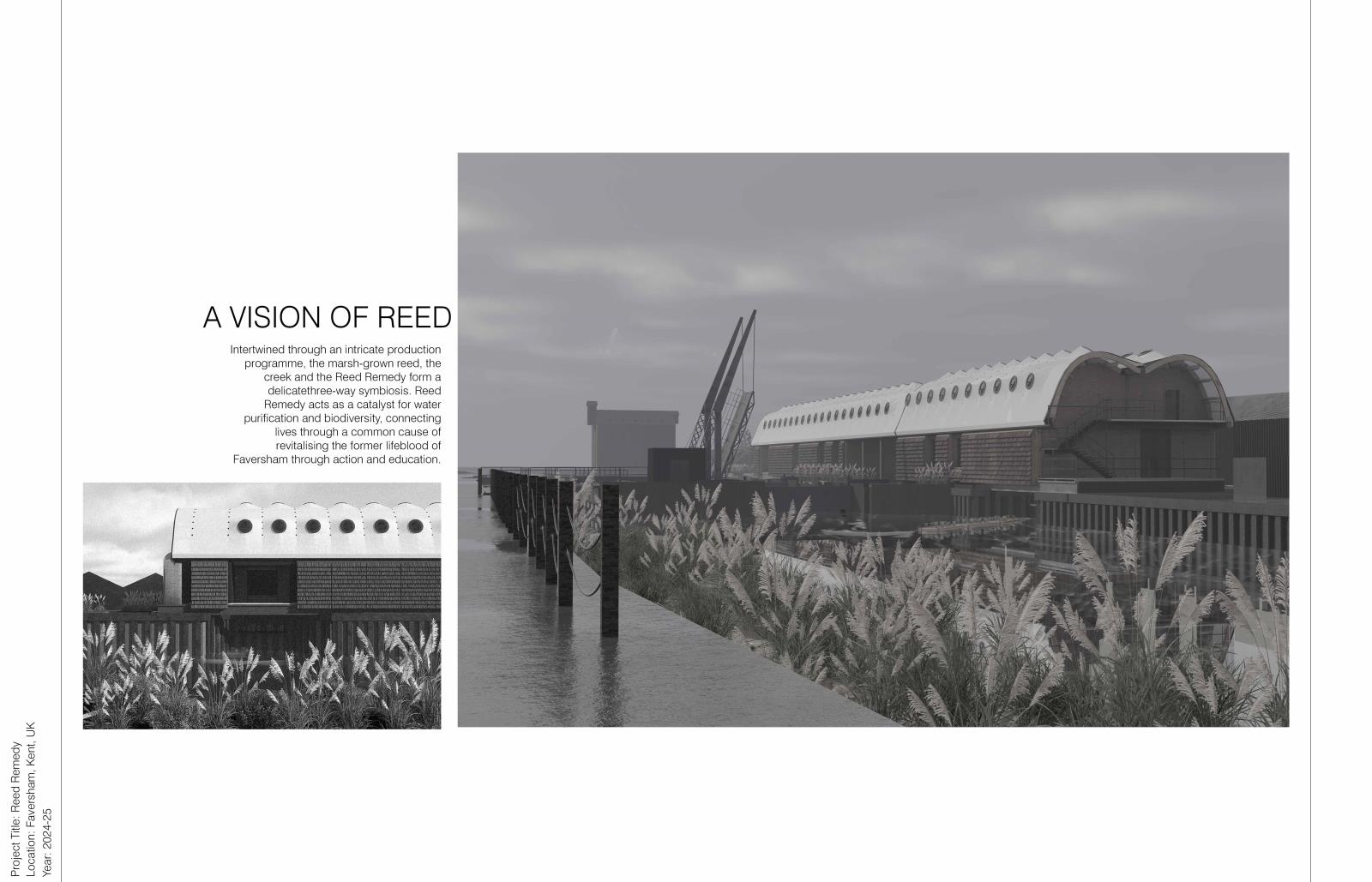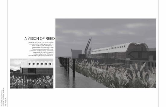 Reed rafts and rope are created, and seedlings are germinated in a linear production facility located in disused quay space. Reeds are also utilised to animate the surrounding public space. The project's structure is based on combining primitive reed construction techniques with modern timber construction. Reed Remedy experiments with the architectural potential of locally abundant resources, interweaving programmes of education, production, and community gatherings to populate the spaces throughout the seasons, showcasing an optimistic long-term vision for Faversham.