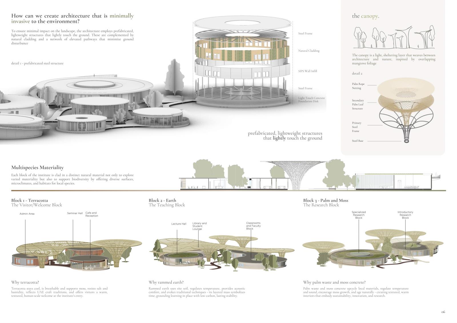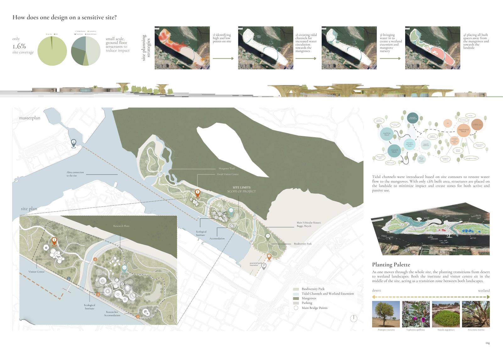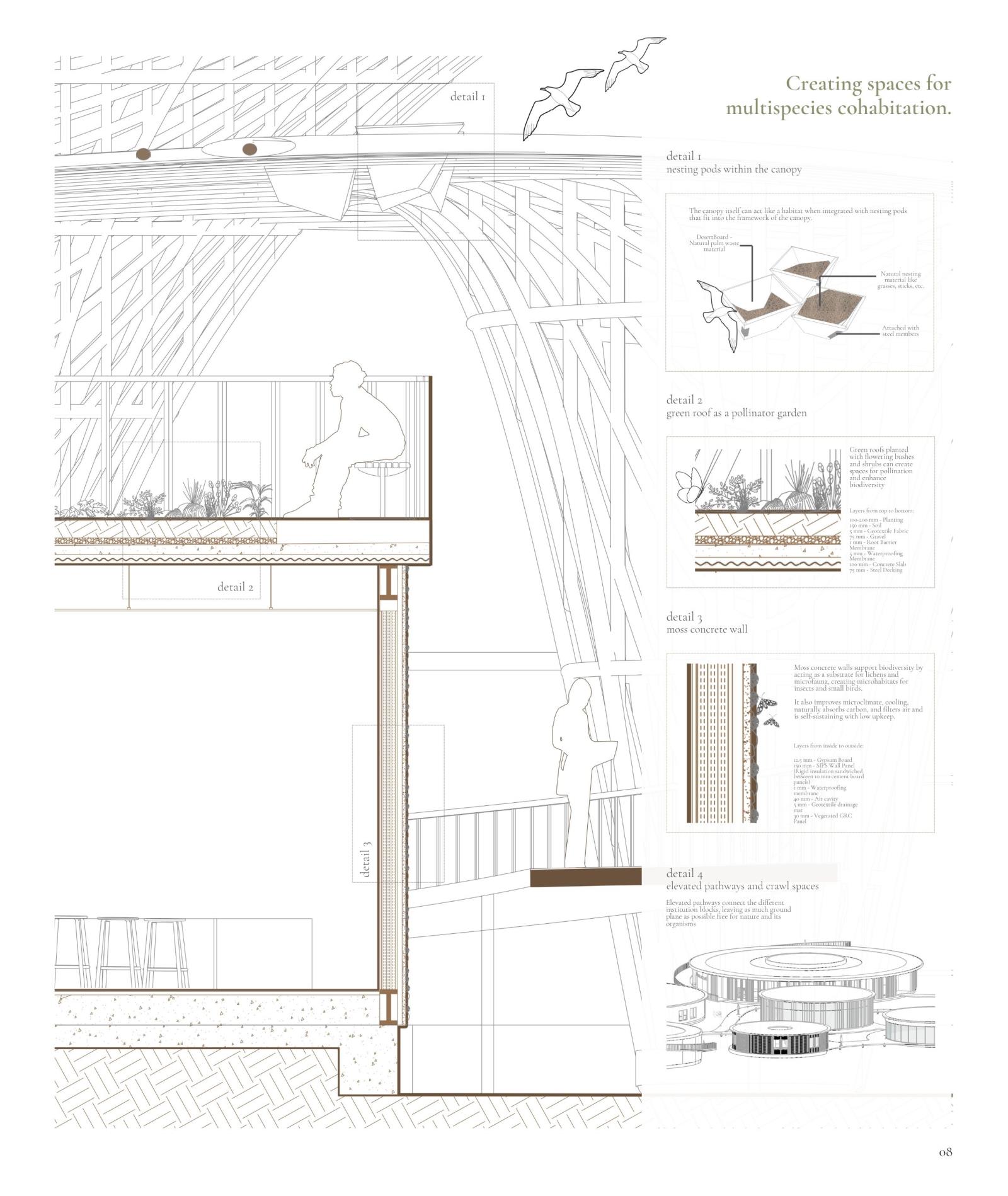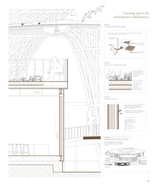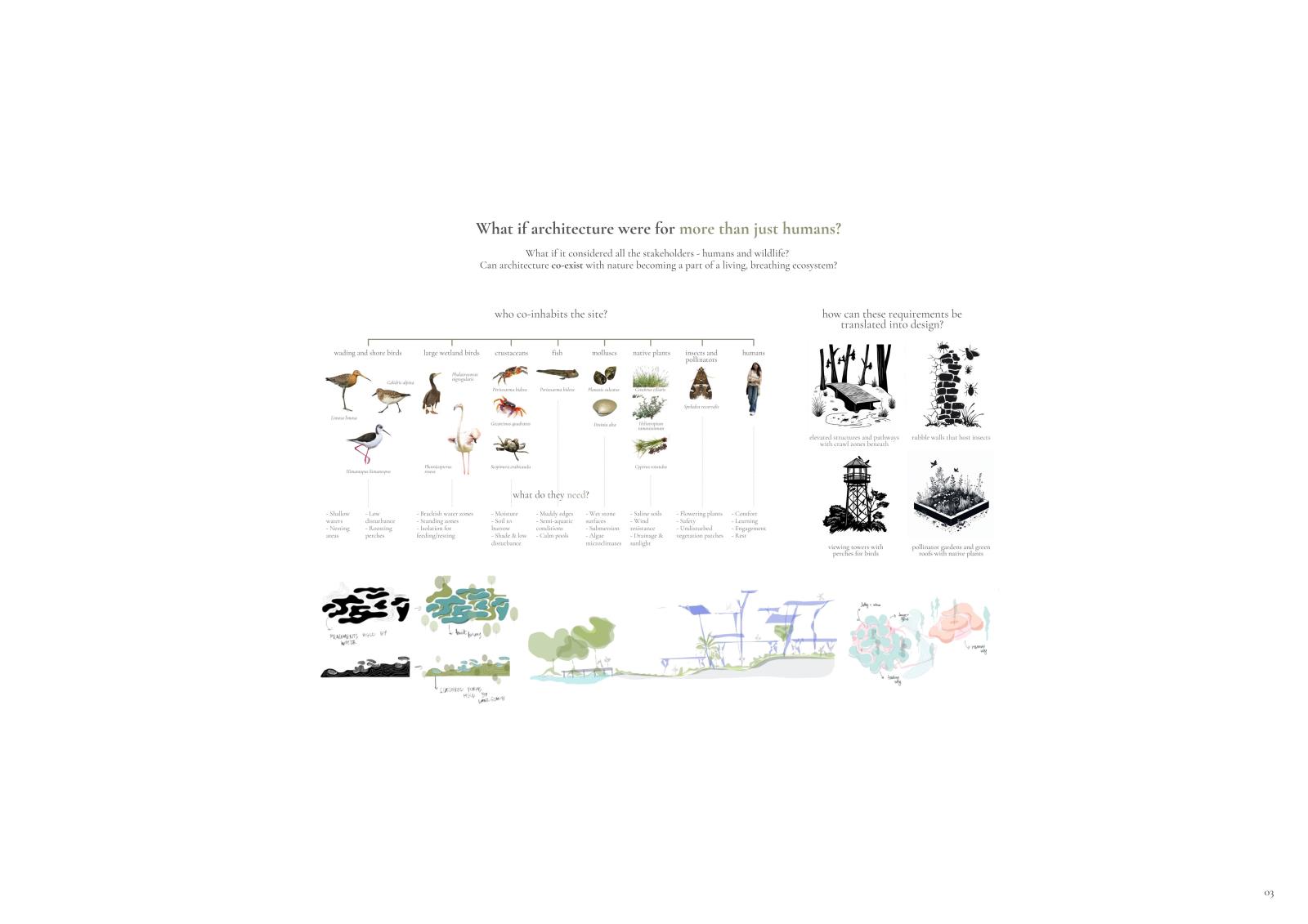 Comprising three interlinked components - an Ecological Research Institute, a Visitor Centre, and a Biodiversity Park – the proposal functions as a centralized hub for learning, conservation, and public engagement. It seeks to reframe architecture not as a human-centric intervention, but as a facilitator of multispecies cohabitation.