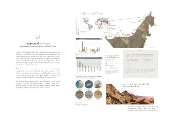 Intertwining Ecologies explores how architecture can move beyond the human, becoming part of a living, breathing ecosystem. Set in the mangrove landscape of Al Zorah, Ajman, the project proposes a Centre for Ecological Education and Research, addressing the urgent need for environmental education in the UAE and wider MENA region, where fewer than five of